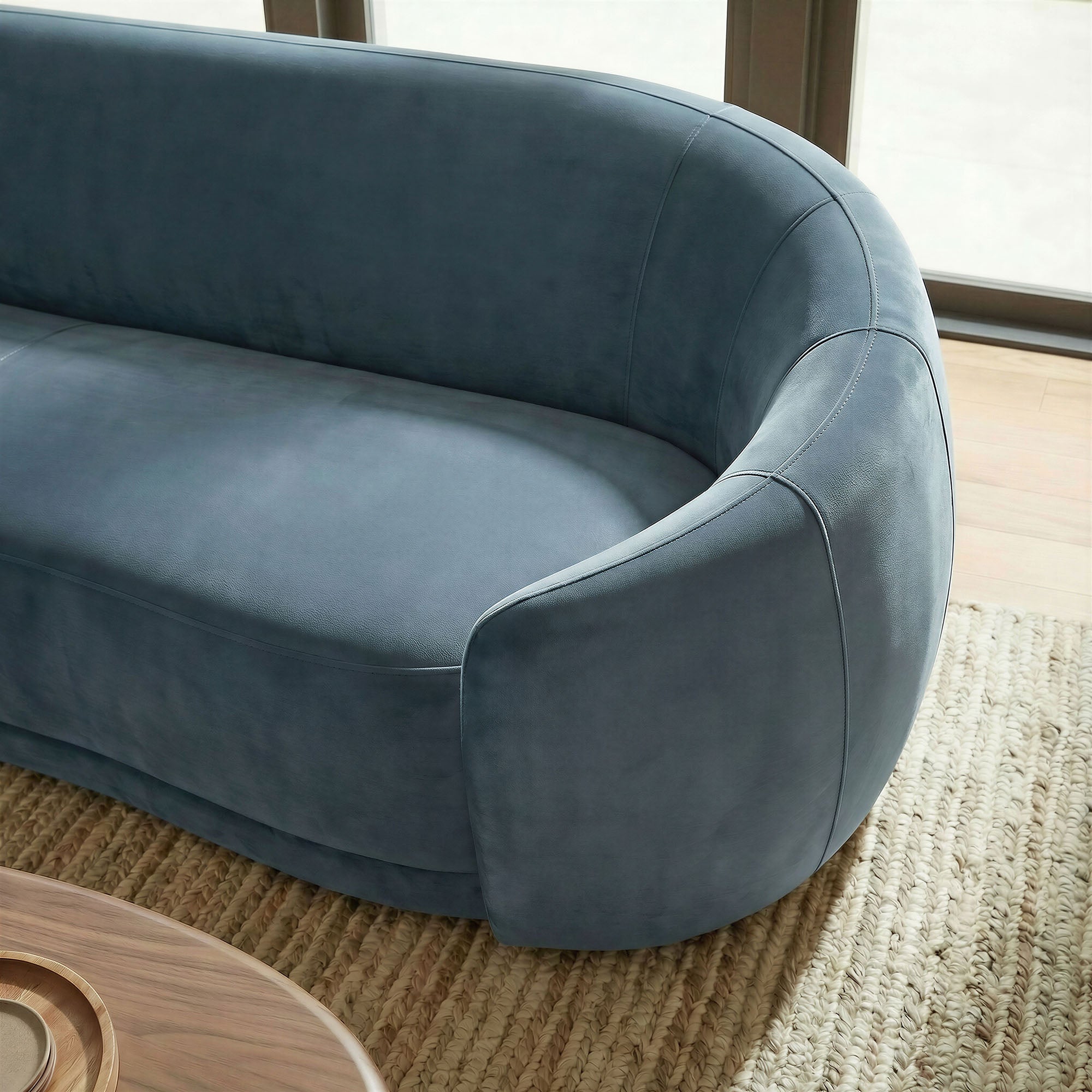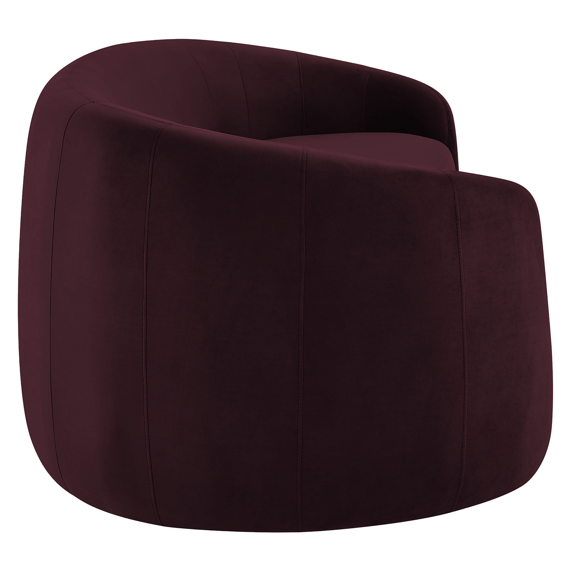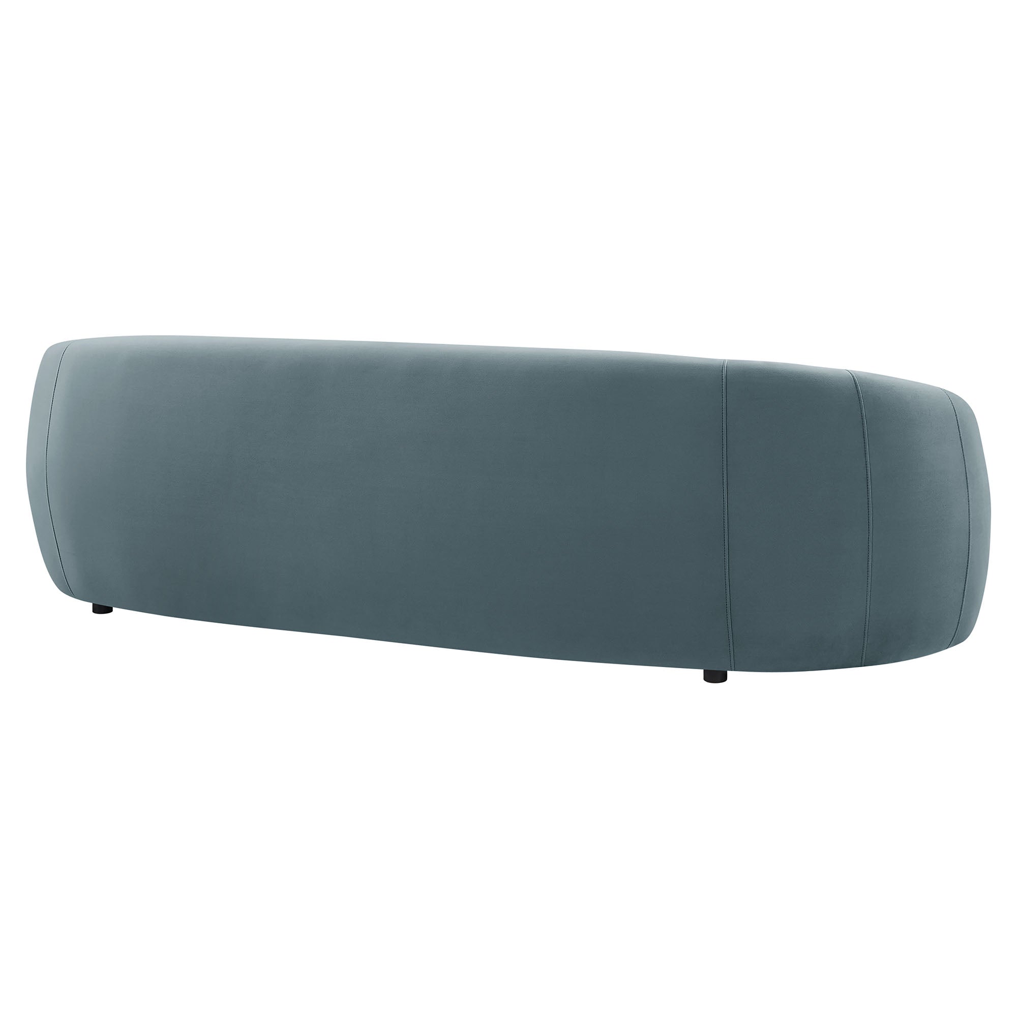 Designed as a sculptural centerpiece for modern interiors, the Contessa Curved Back Sofa brings a refined, lounge-forward look to everyday living. This modern curved back performance velvet sofa features a wrapped tight-back silhouette that flows into rounded sides, accented with tailored seam detailing that adds depth and structure from every angle. Upholstered in stain-resistant, performance velvet fabric, Contessa delivers a soft velvet finish with a clean, elevated feel that suits contemporary, minimalist, and apartment-friendly spaces. With its low profile curved sofa design and padded, supportive seating, this upholstered 3-seat couch is made for relaxed living room seating without overwhelming the room. Assembly required. Weight Capacity: 801 lbs.