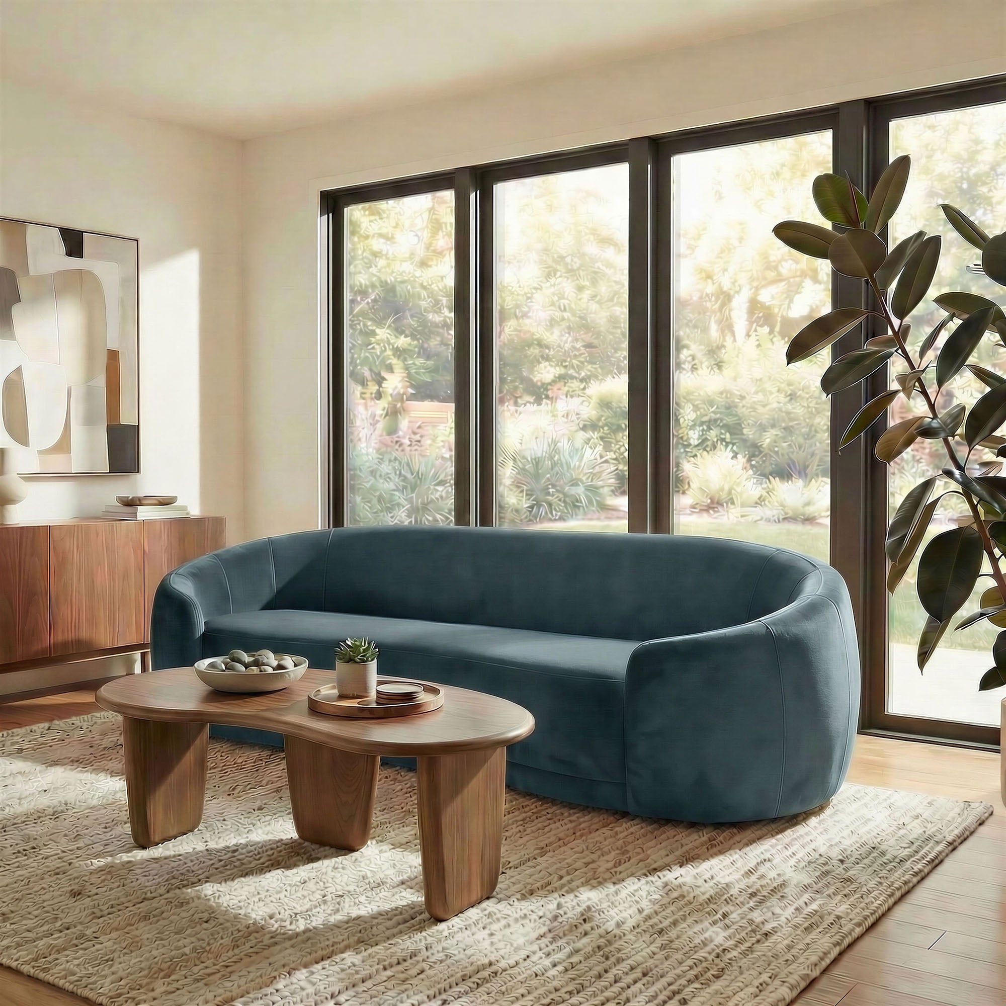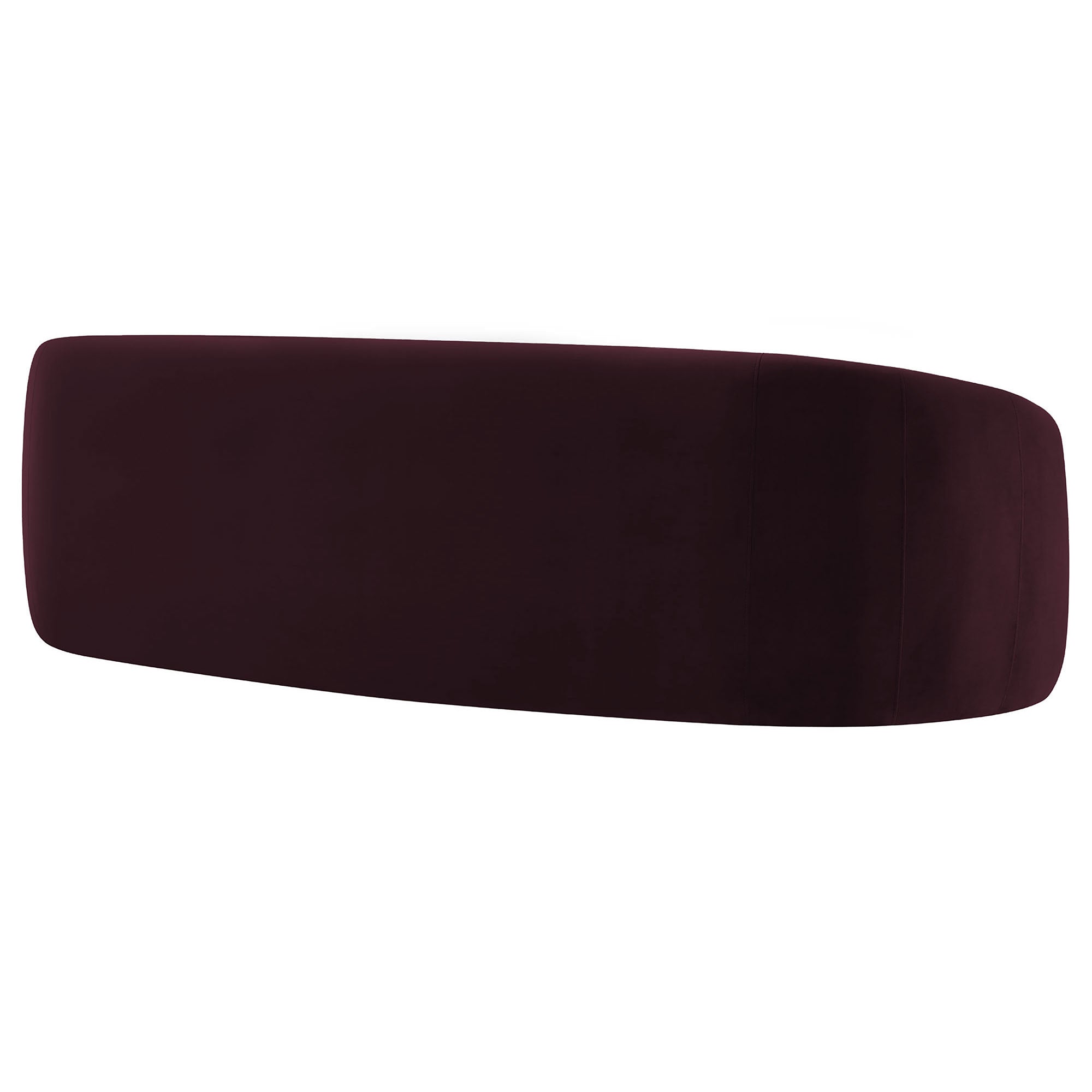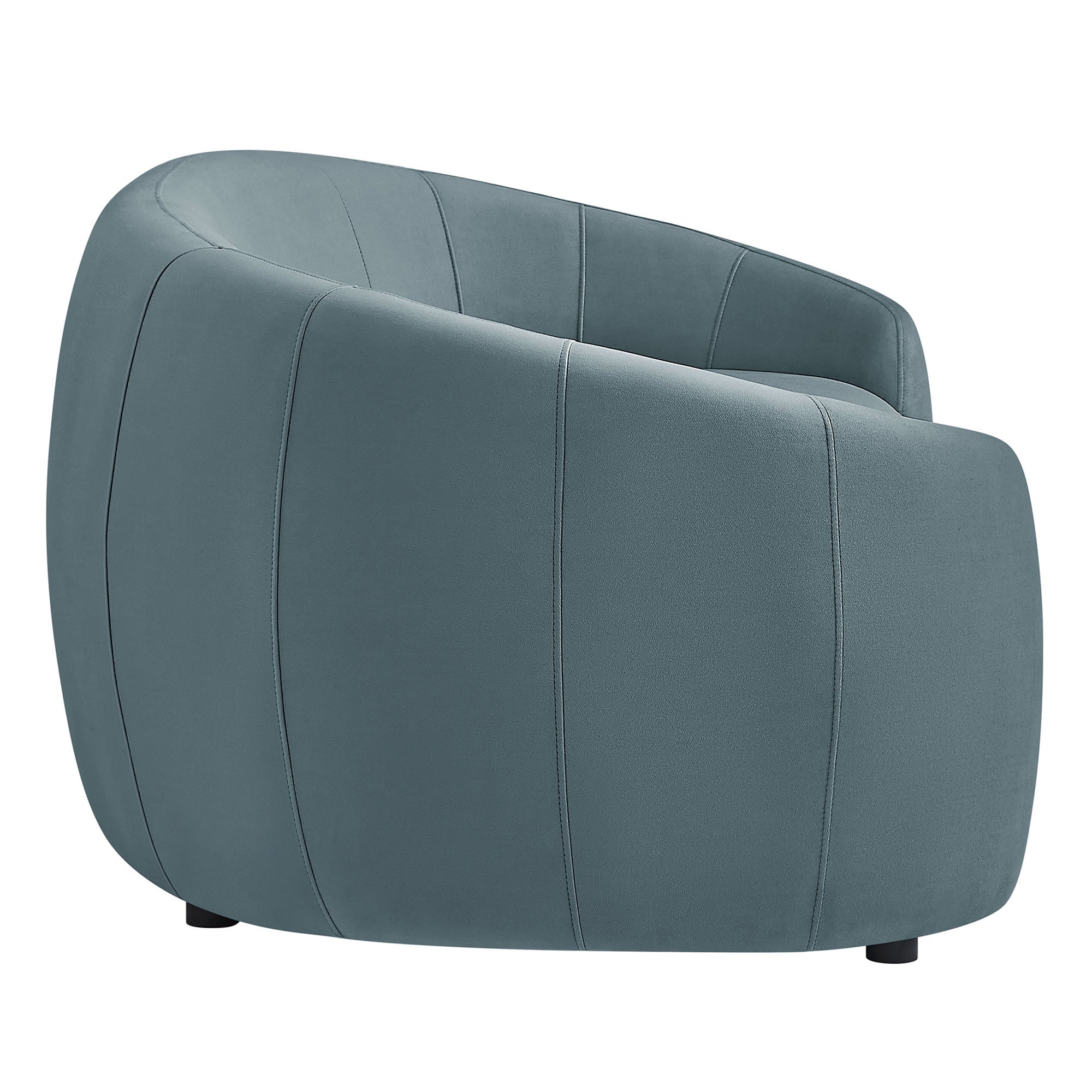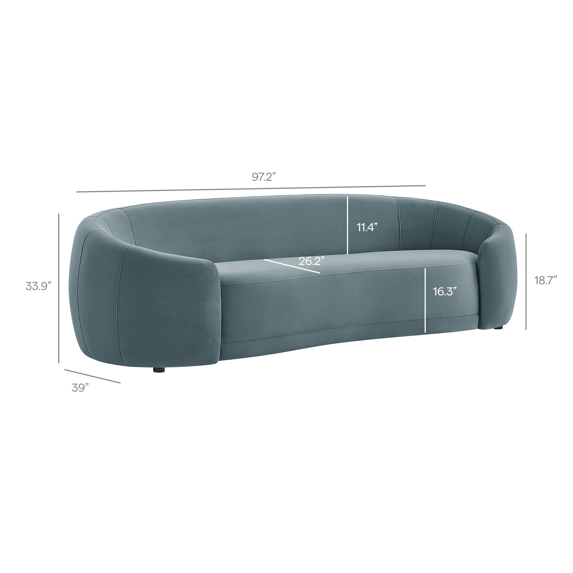 Designed as a sculptural centerpiece for modern interiors, the Contessa Curved Back Sofa brings a refined, lounge-forward look to everyday living. This modern curved back performance velvet sofa features a wrapped tight-back silhouette that flows into rounded sides, accented with tailored seam detailing that adds depth and structure from every angle. Upholstered in stain-resistant, performance velvet fabric, Contessa delivers a soft velvet finish with a clean, elevated feel that suits contemporary, minimalist, and apartment-friendly spaces. With its low profile curved sofa design and padded, supportive seating, this upholstered 3-seat couch is made for relaxed living room seating without overwhelming the room. Assembly required. Weight Capacity: 801 lbs.