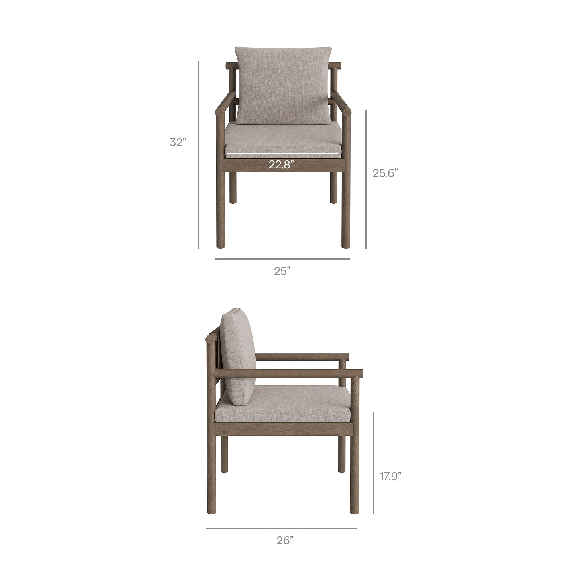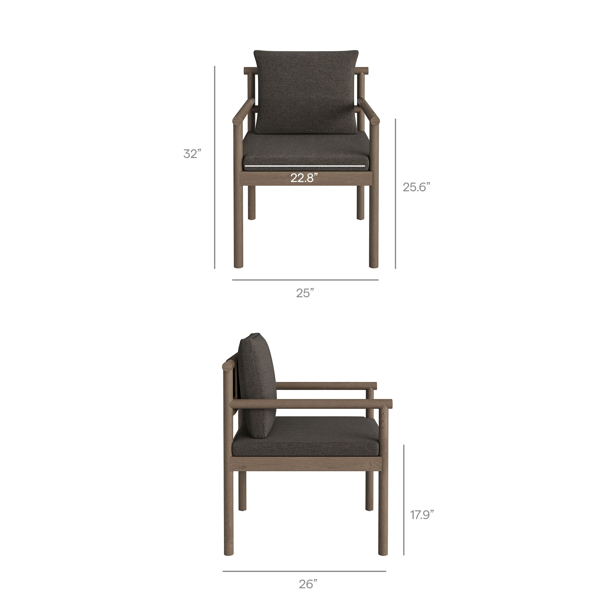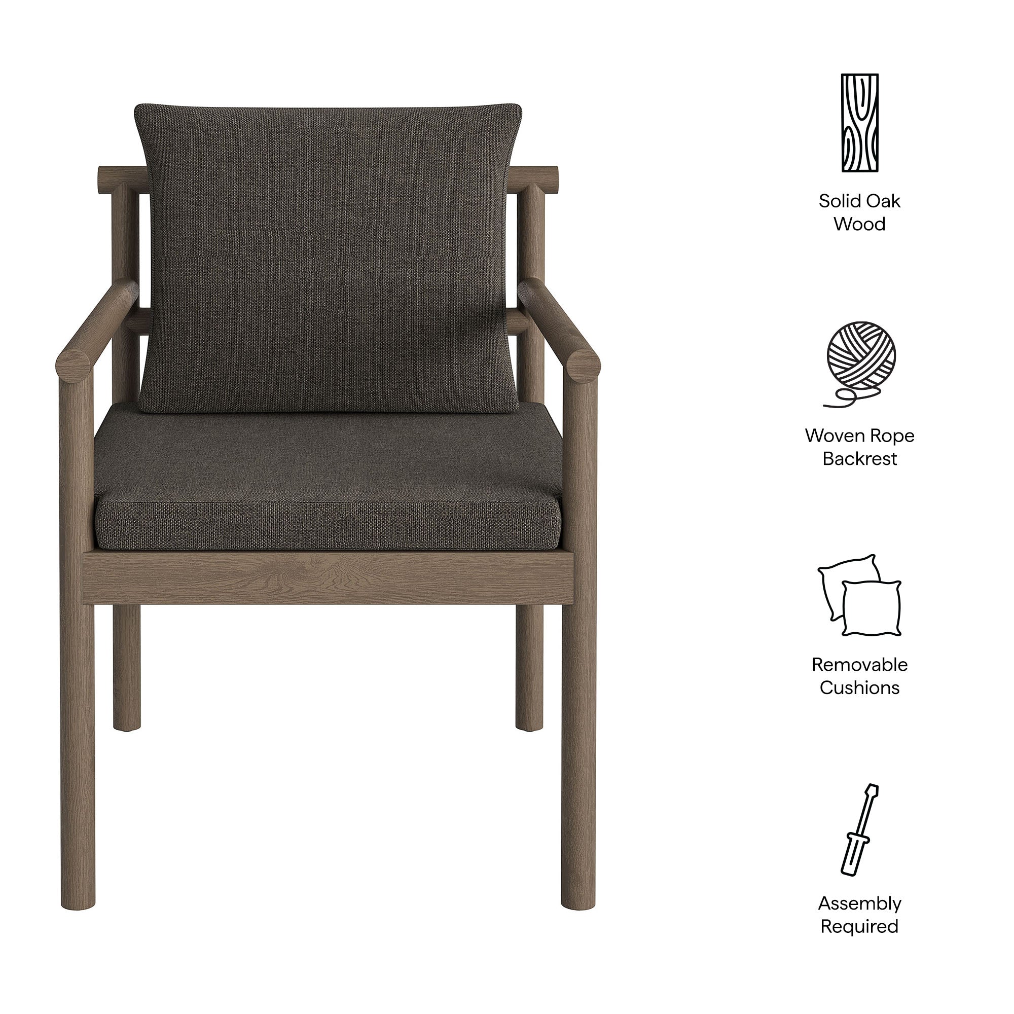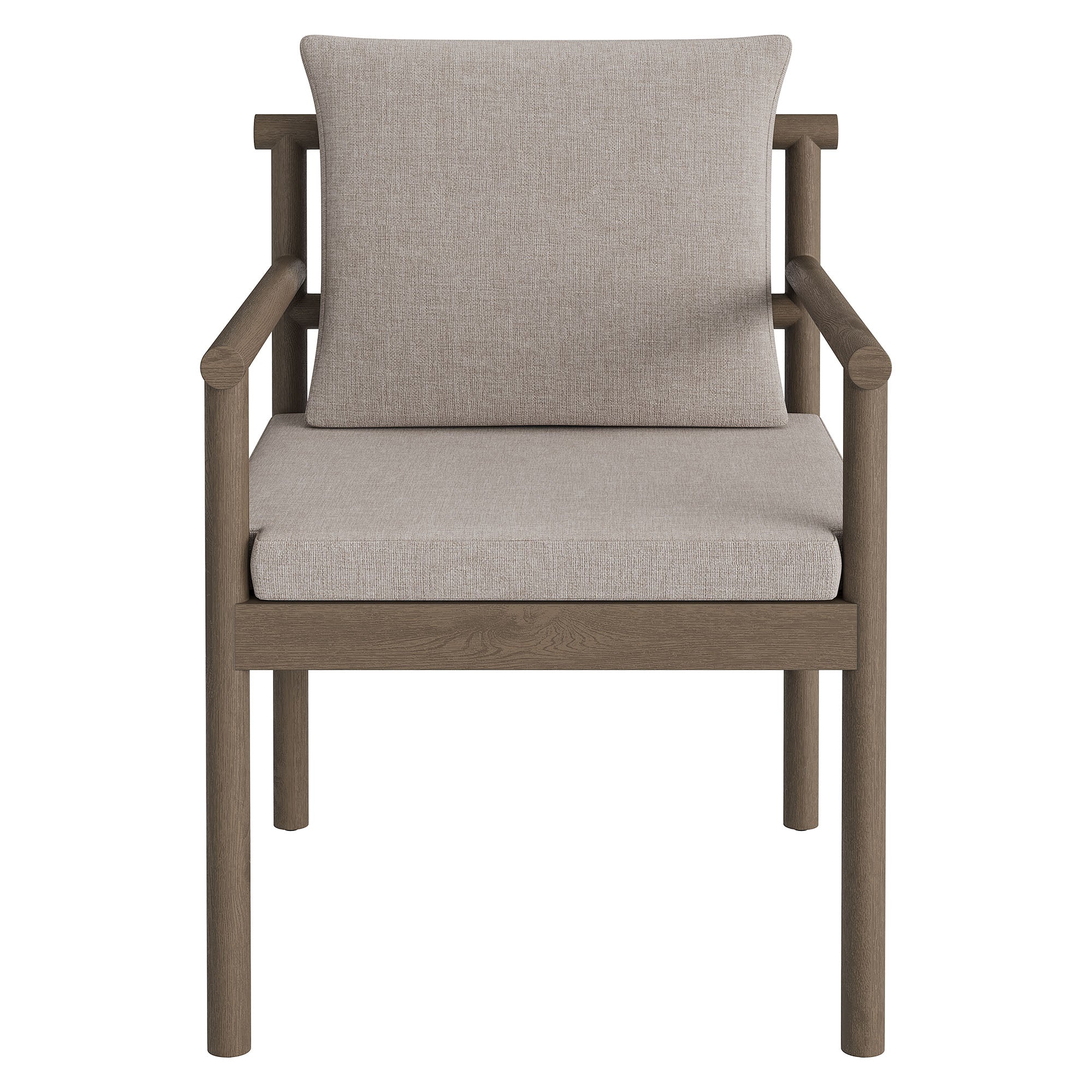 Made for open-air meals, the Eleni Outdoor Teak Wood Dining Chair brings a warm coastal presence to outdoor dining. Built on a solid teak frame that showcases the wood’s natural grain, this patio dining chair keeps you comfortable from first course to last. A woven rope accent at the top of the backrest adds airy comfort and a touch of flex, while the upholstered seat and back cushions keep their shape through sun and showers. Fixed arms and a slatted seat promote airflow, and non-marking foot caps help protect decking and stone. Simple assembly required. Weight Capacity: 500 lbs.