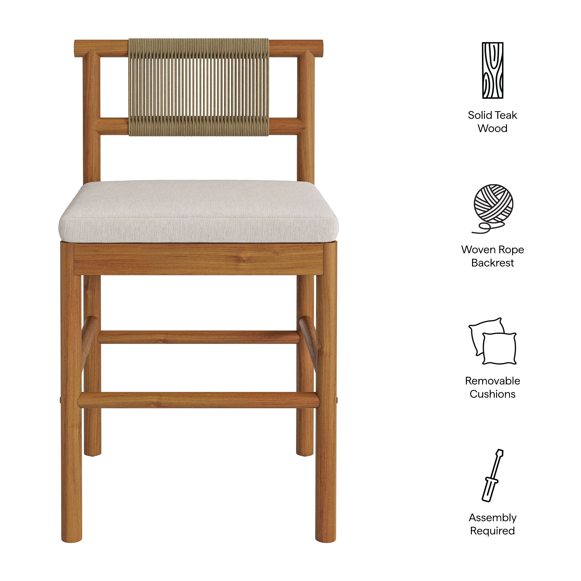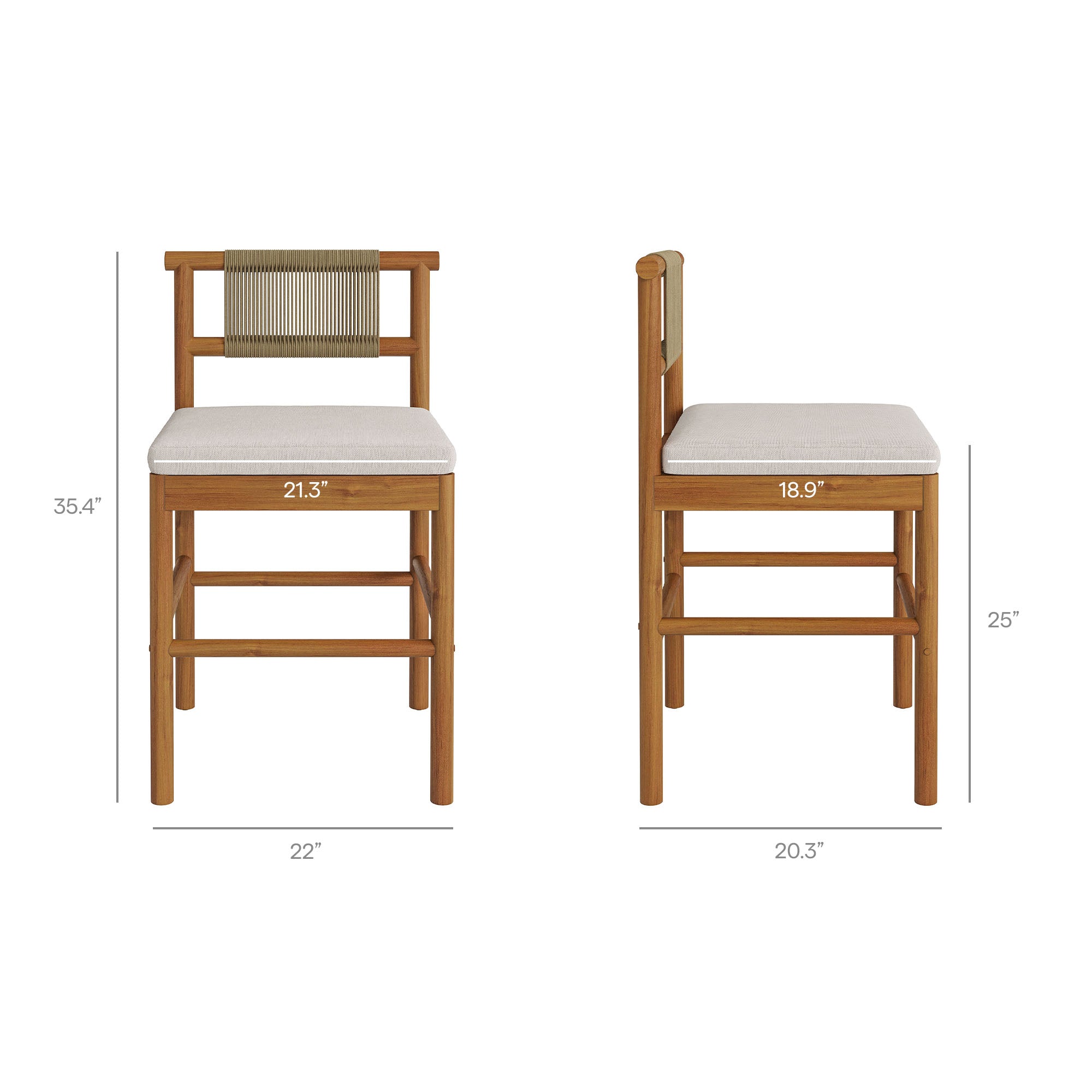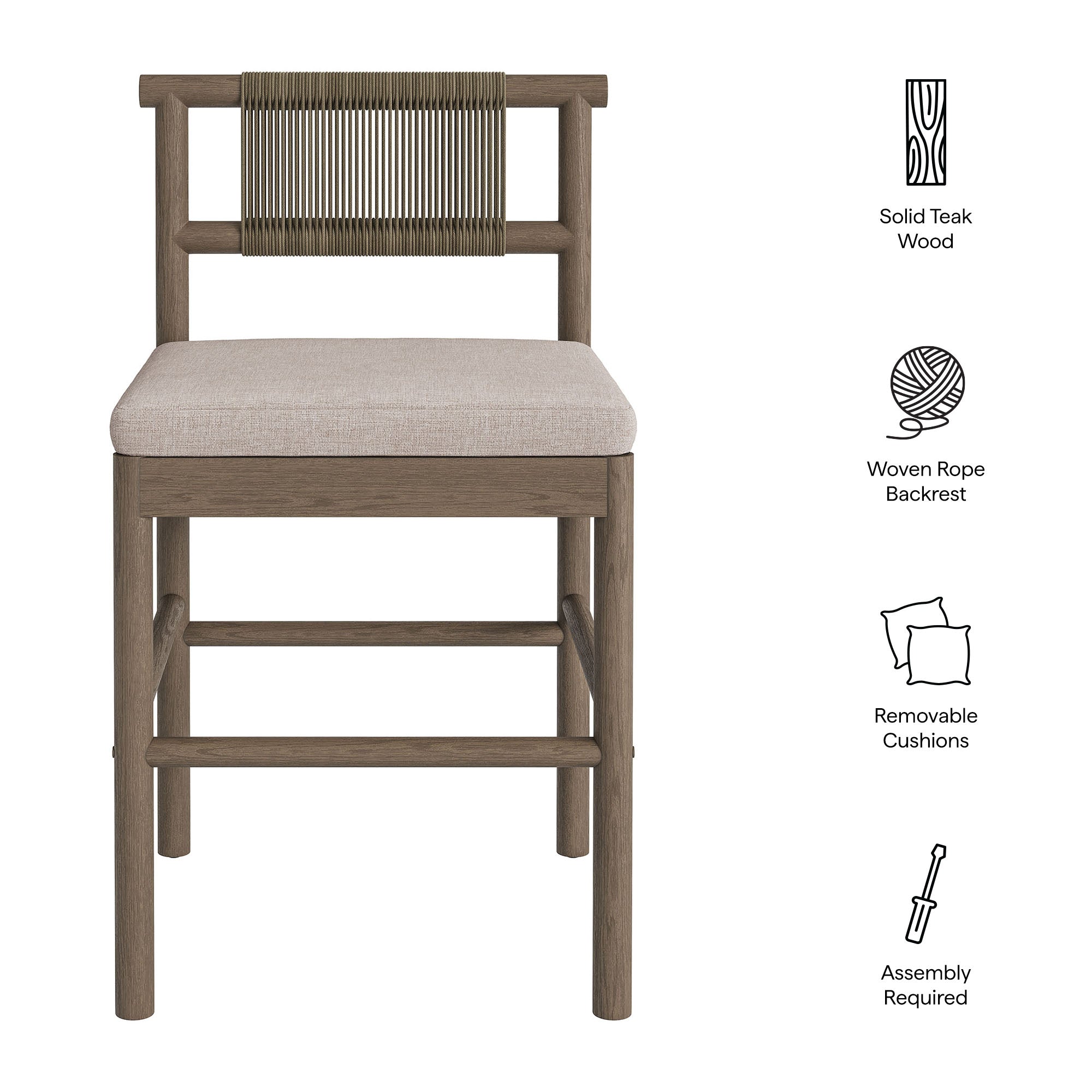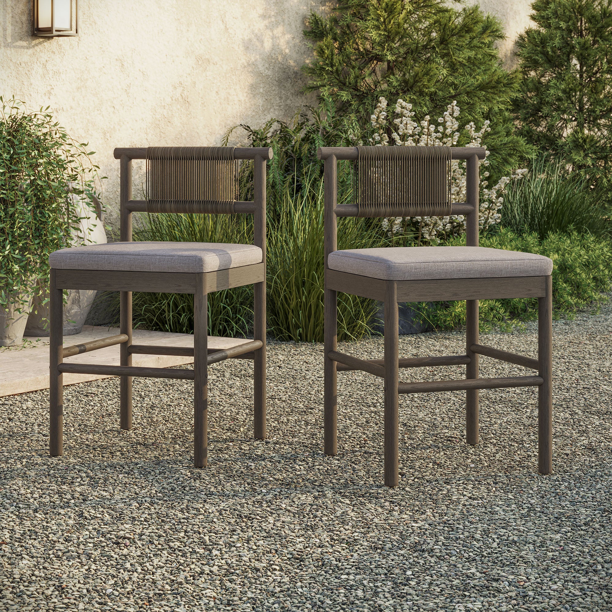 Made for open-air meals and casual drinks, the Eleni Set of 2 Wood Counter Stools adds warm coastal style to outdoor patios. Built on solid teak frames that showcase the wood’s natural grain, these patio counter height chairs keep you comfortable from the first bite to the last. A woven rope accent at the top of each backrest adds airy comfort and a touch of flex, while the removable seat cushions keep their shape through sun and showers. With an armless design that tucks neatly under counter height tables, these wood counter stools feature slatted seats for airflow and non-marking foot caps to help protect decking and stone. Simple assembly required. Weight Capacity: 374 lbs each.