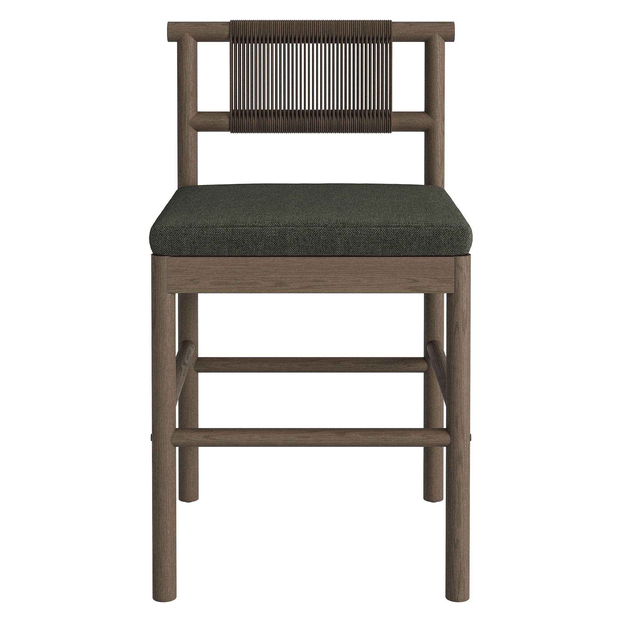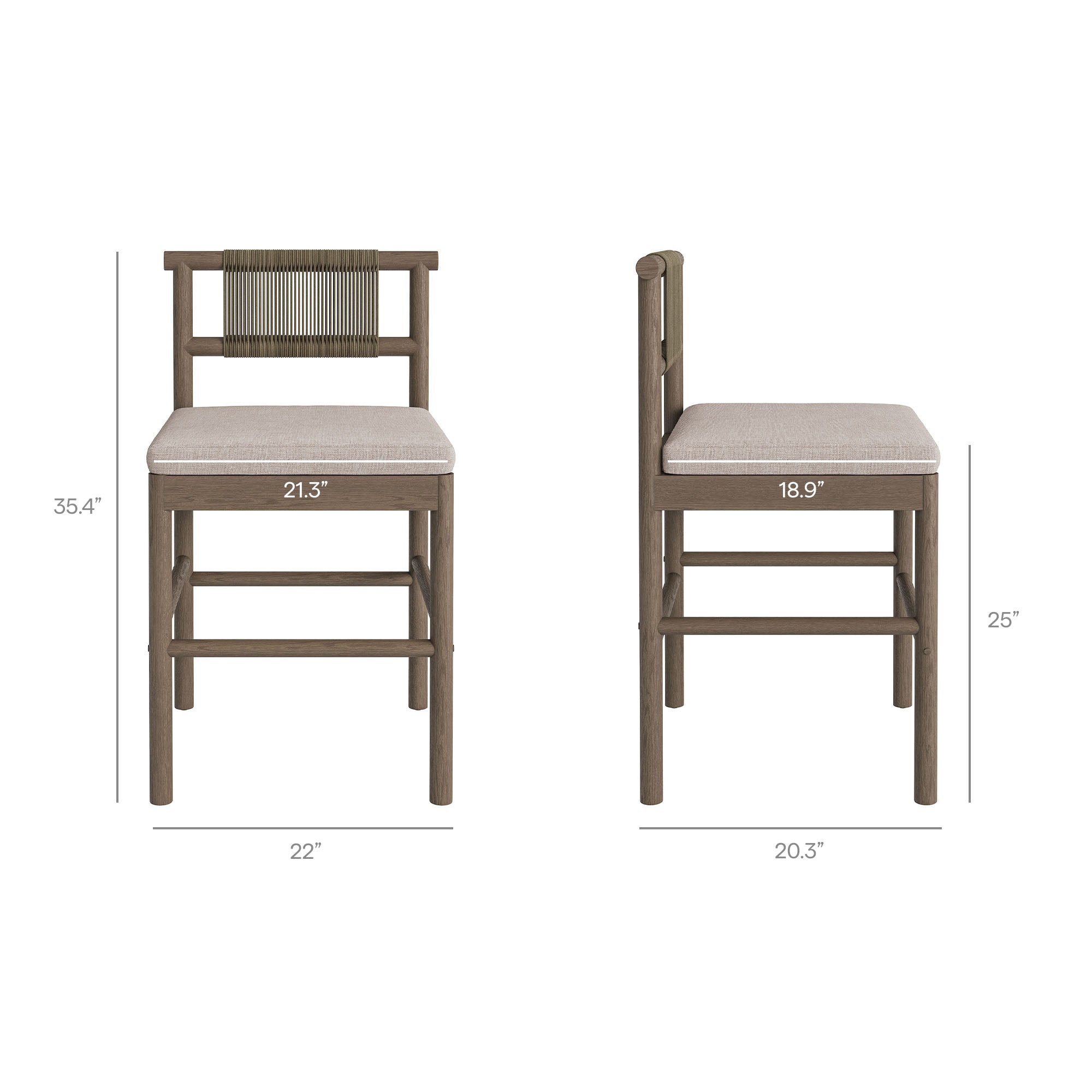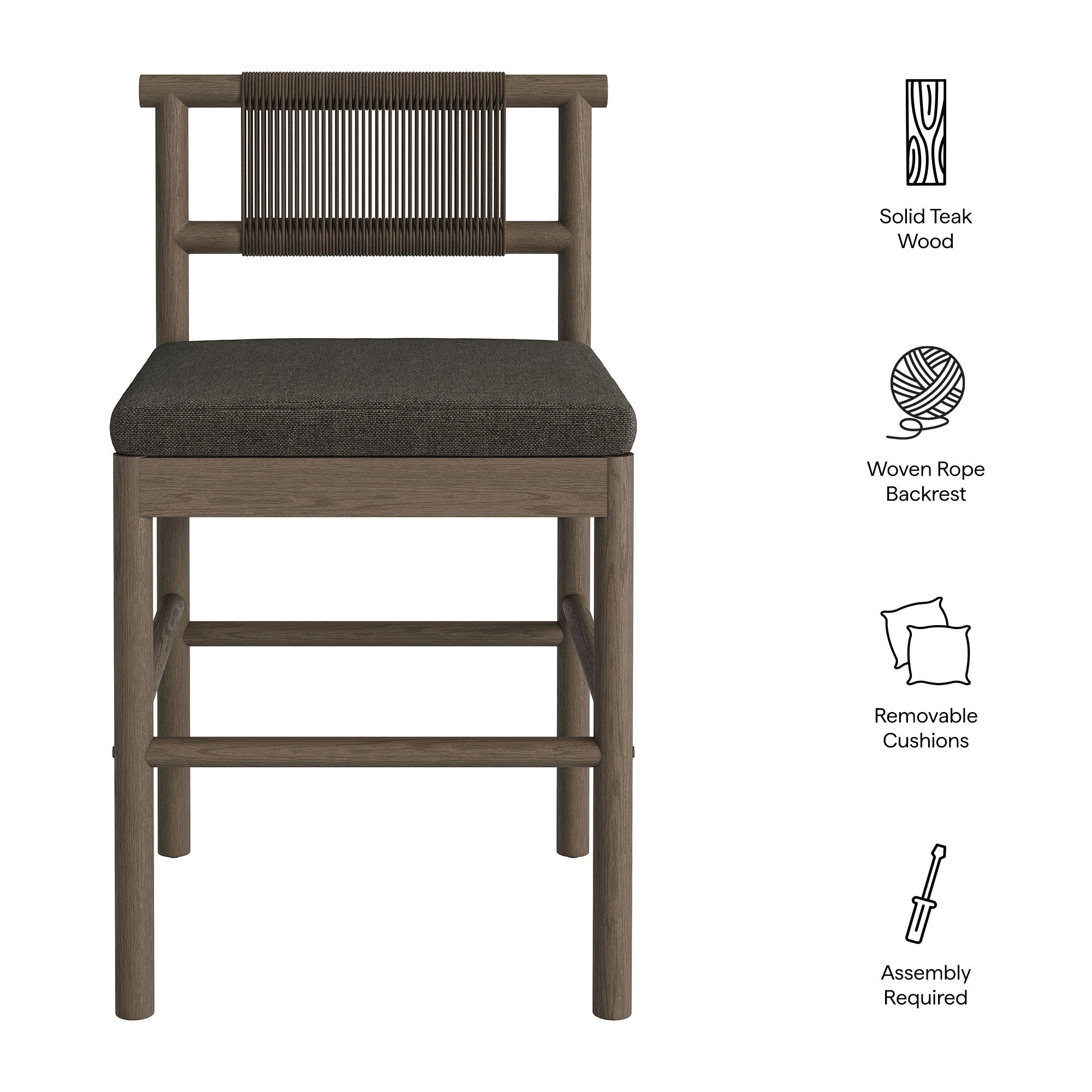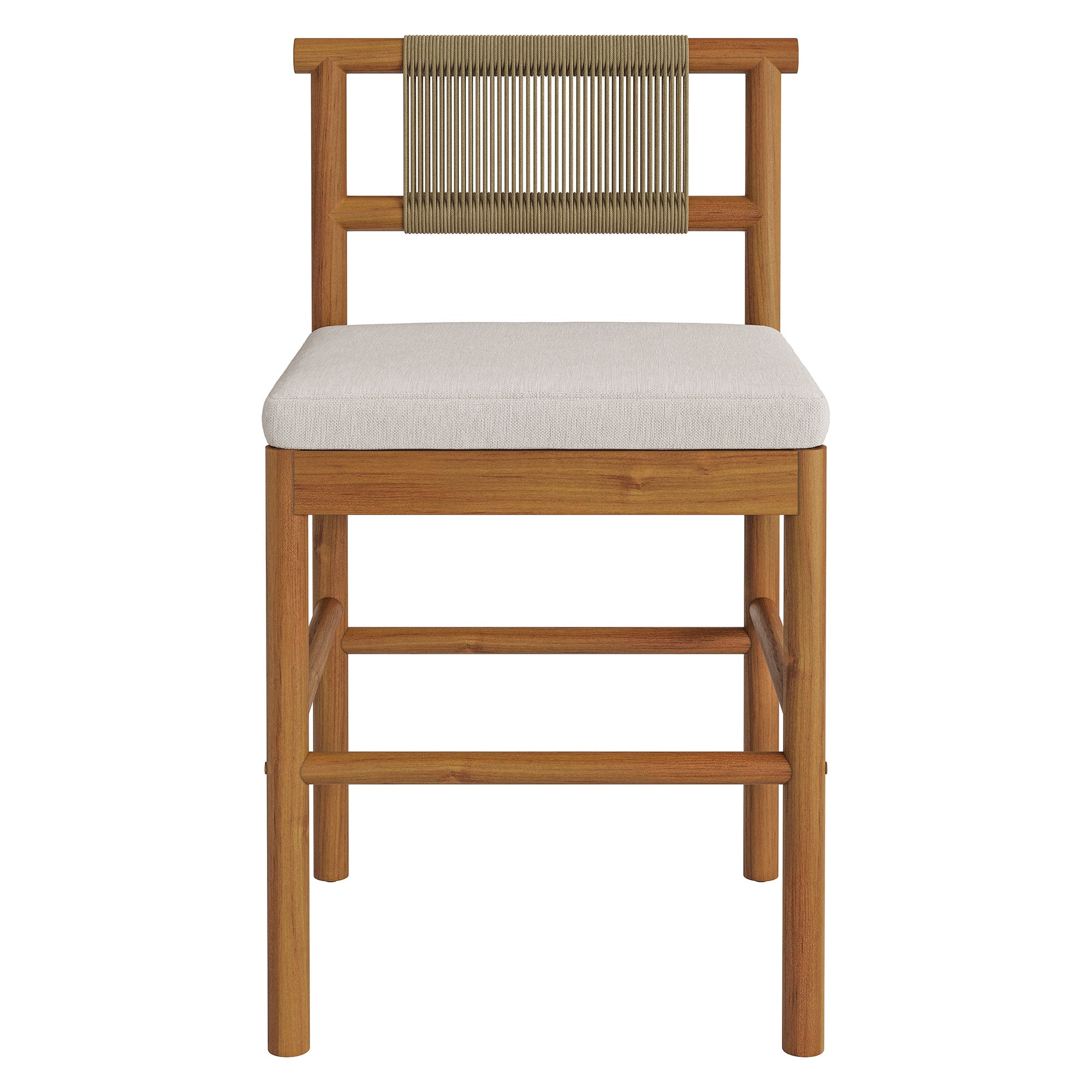 Made for open-air meals and casual drinks, the Eleni Set of 2 Wood Counter Stools adds warm coastal style to outdoor patios. Built on solid teak frames that showcase the wood’s natural grain, these patio counter height chairs keep you comfortable from the first bite to the last. A woven rope accent at the top of each backrest adds airy comfort and a touch of flex, while the removable seat cushions keep their shape through sun and showers. With an armless design that tucks neatly under counter height tables, these wood counter stools feature slatted seats for airflow and non-marking foot caps to help protect decking and stone. Simple assembly required. Weight Capacity: 374 lbs each.