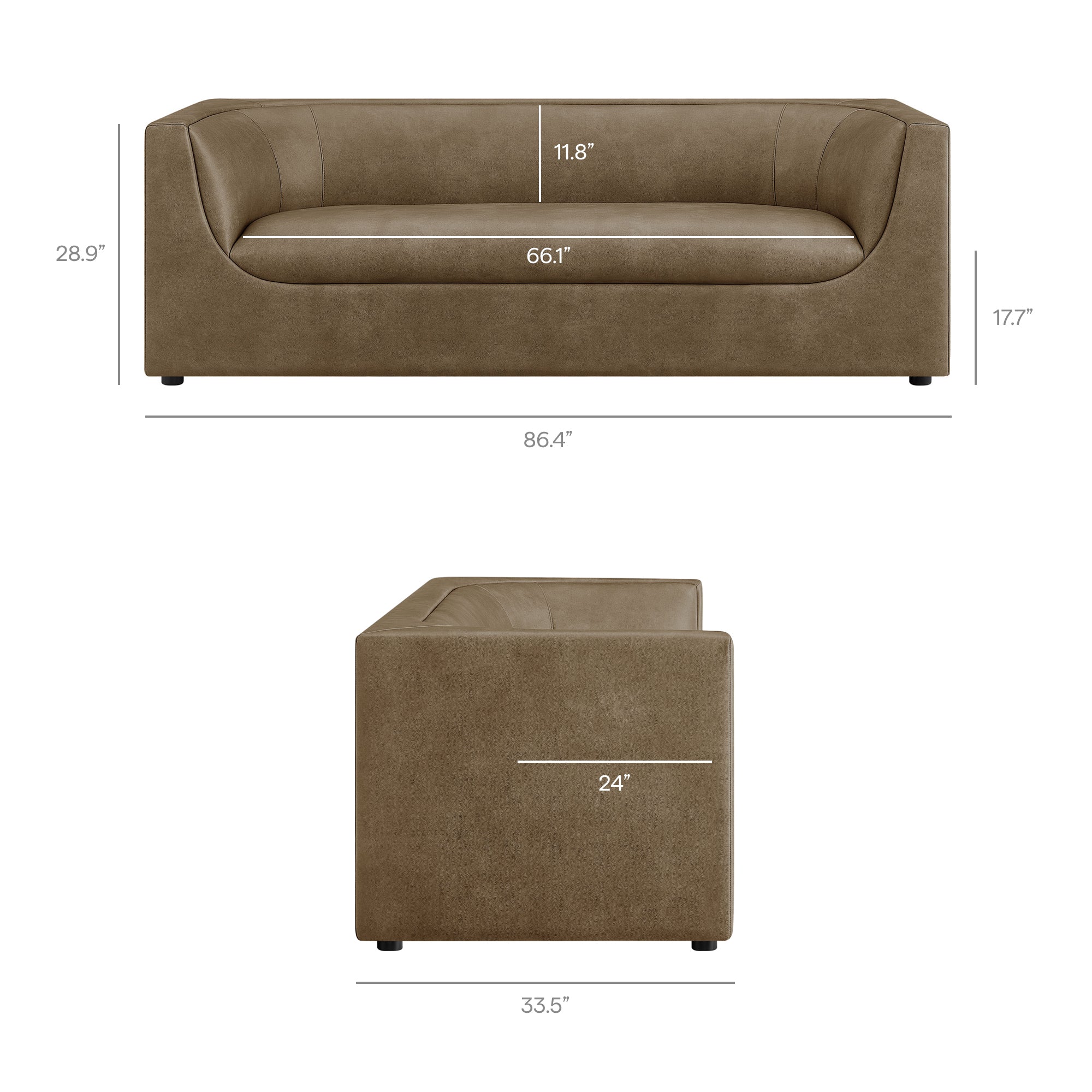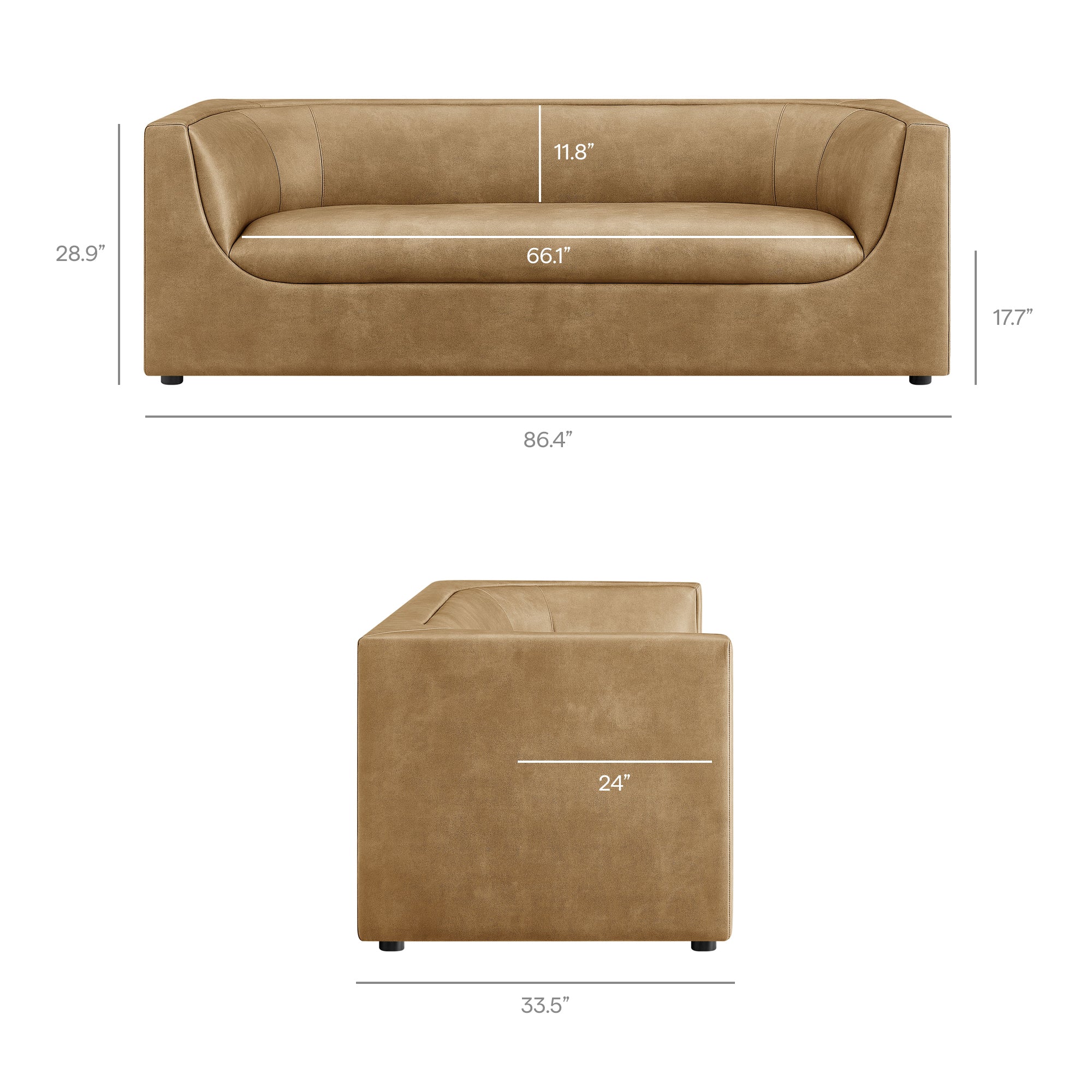 Bring a sculptural, lounge-forward look to your space with the Hilda Curved Back Sofa. Designed as a luxury modern faux leather sofa, Hilda features a wrapped, continuous back that flows into gently curved arms, creating a refined silhouette that feels polished from every angle. Upholstered in premium pebbled vegan leather, this modern sofa delivers a smooth, leather-look finish and an elevated texture that works beautifully in contemporary and minimalist interiors. As an 86 inch sofa, Hilda offers comfortable, relaxed seating for everyday living—an inviting upholstered 3-seat couch for living room use, apartments, and small-space layouts that still want statement style. With its low-profile presence and clean-lined form, this modern upholstered sofa anchors living room seating without overwhelming the room. Easy assembly required. Weight Capacaity: 752 lbs.