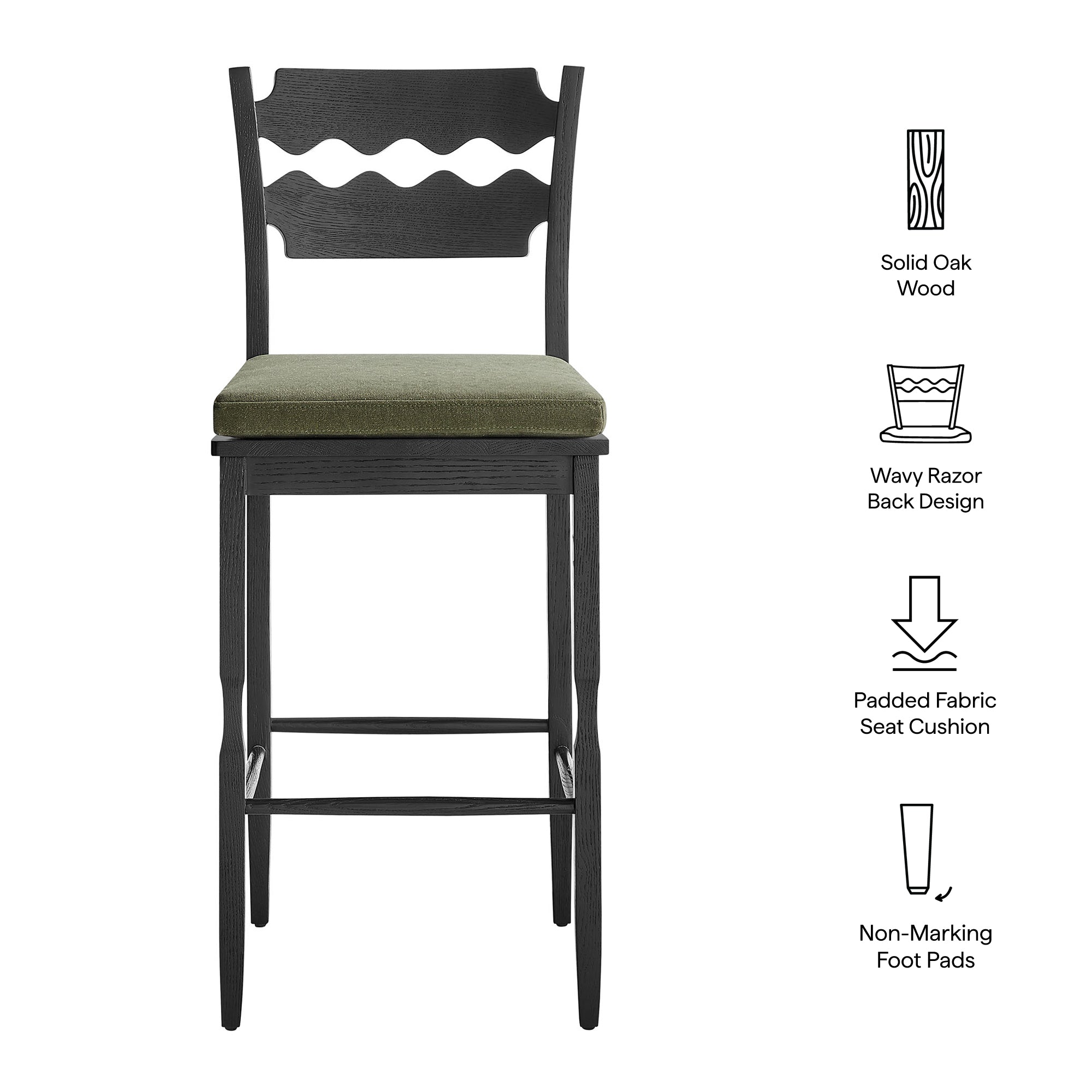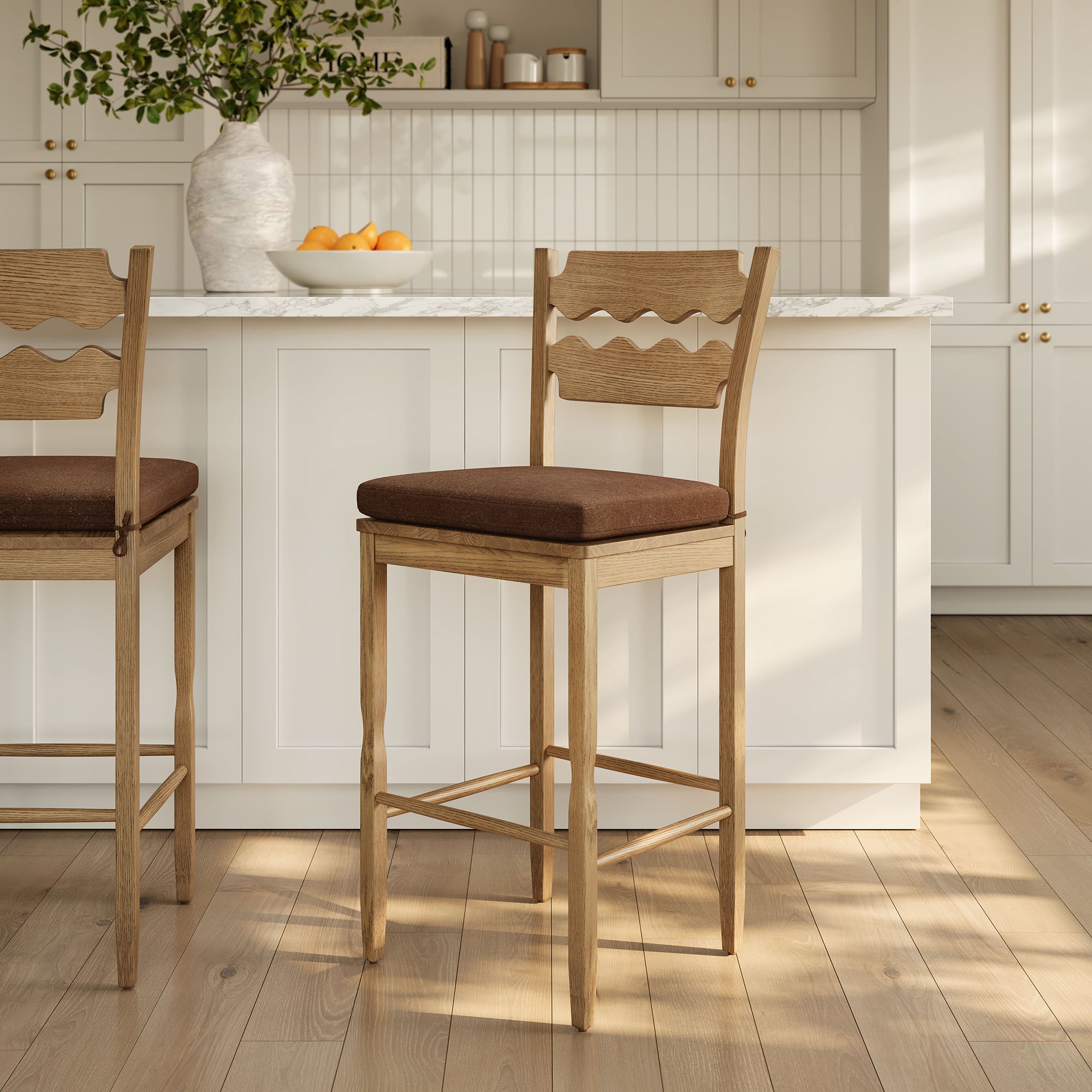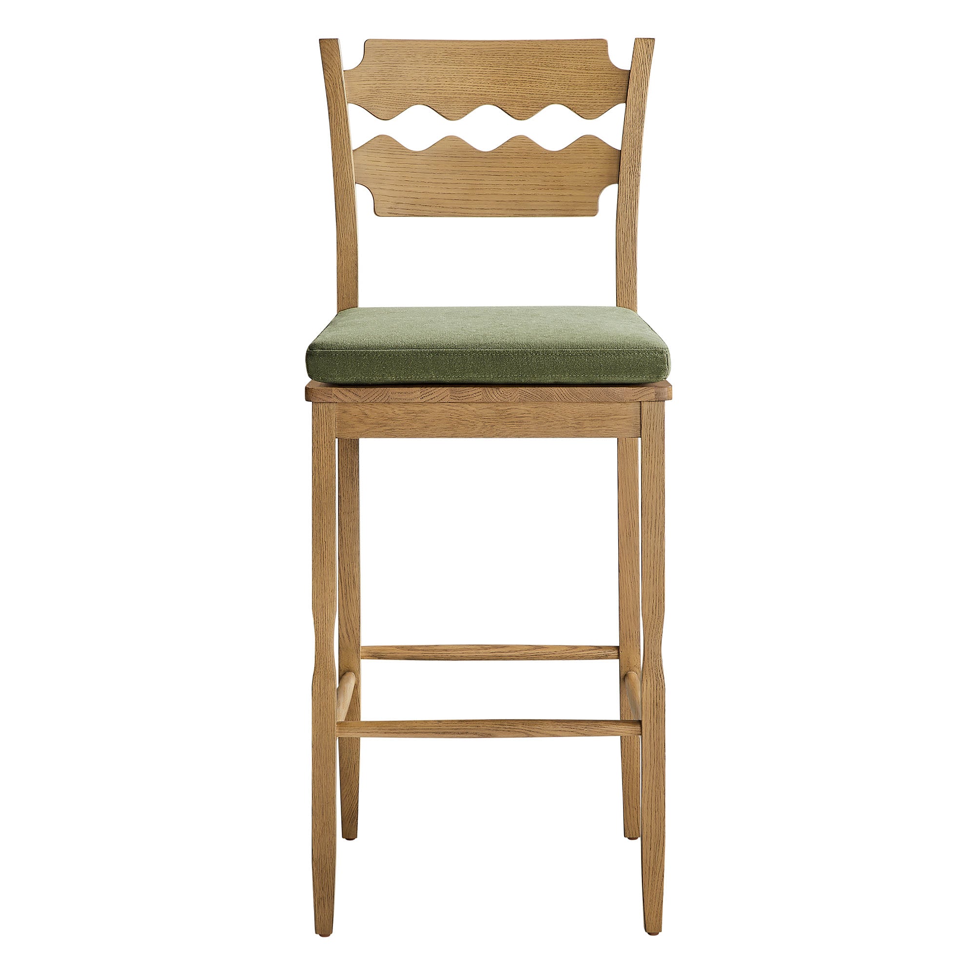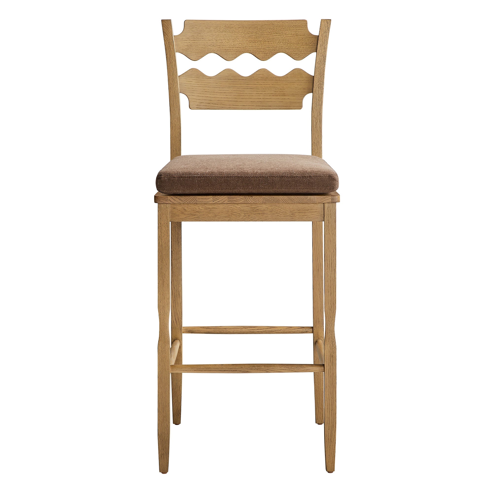 Jax Oak Wood Bar Stool With Wavy Razor Back and Cushion in Weathered Oak Linen