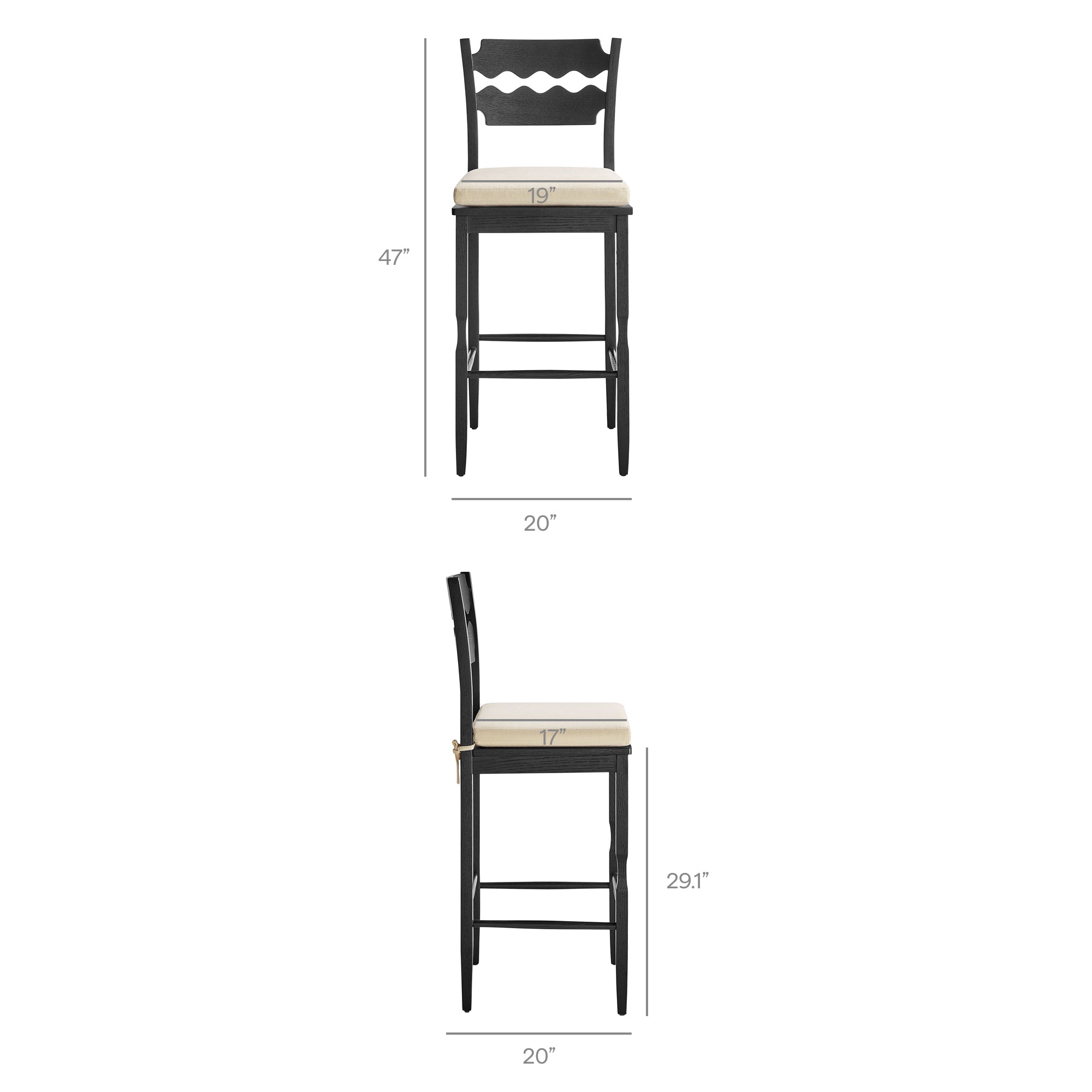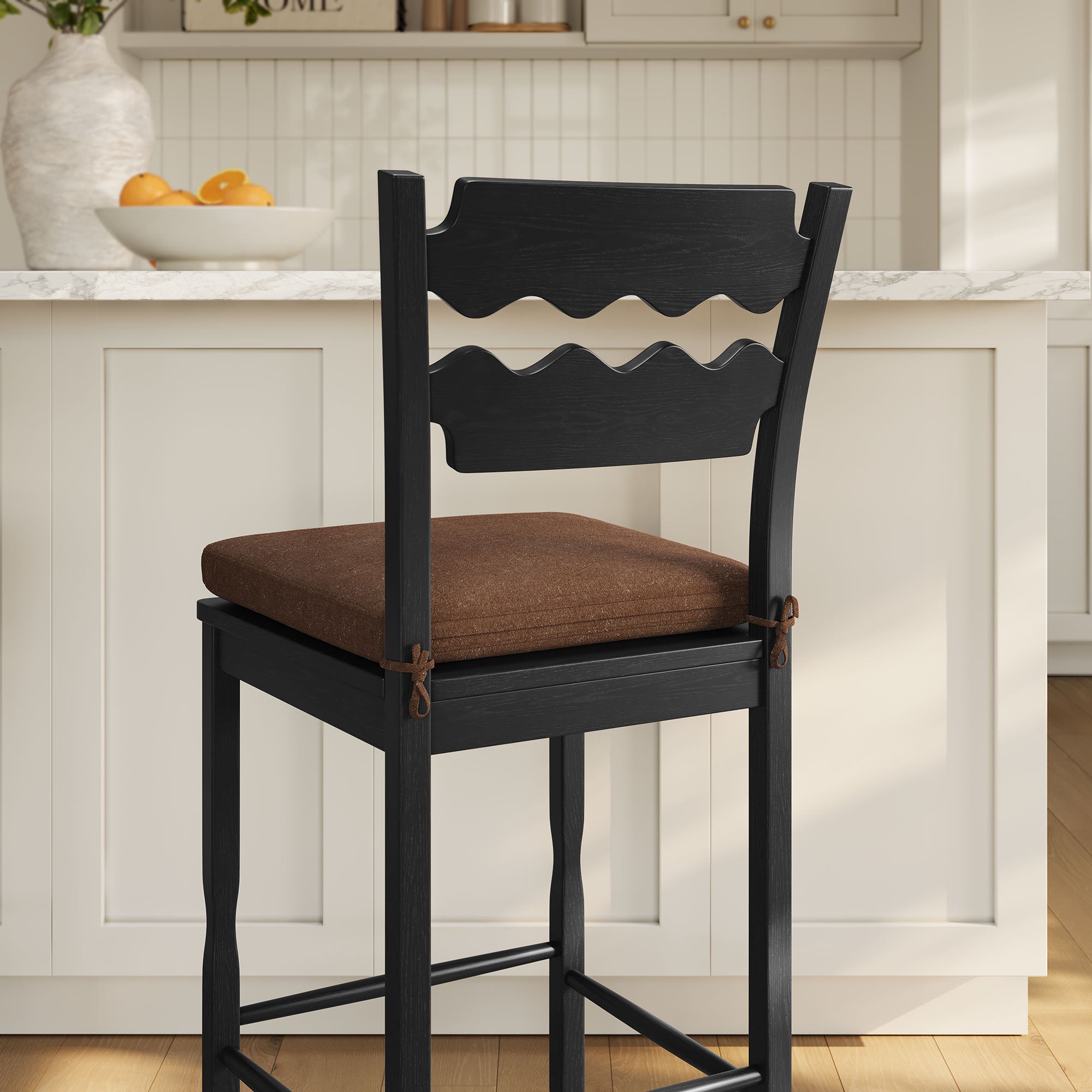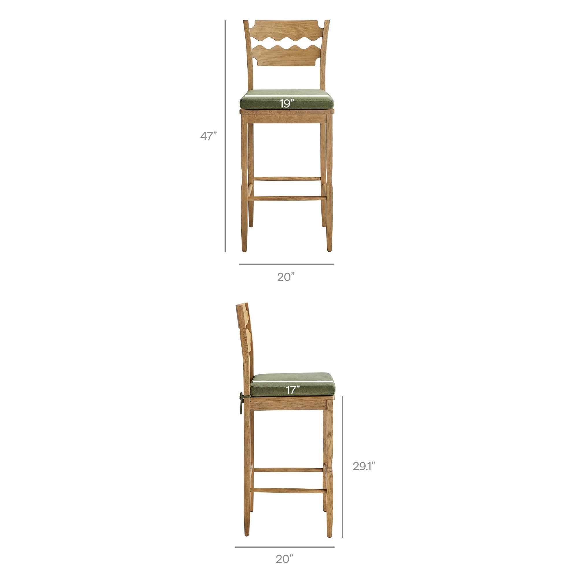 The Jax Single Oak Wood Bar Stool brings a bold, vintage-inspired profile to your space with its unique wavy razor-back. Crafted from solid oak, this wood bar stool stands comfortably at a 29 inch seat height, with the distinct back design giving a quiet nod to vintage bistro barstools. Featuring a fabric seat cushion that ties onto the frame to stay in place, this barstool also rests on a four-sided stretcher base so it feels sturdy and comfortable for everyday use. Jax is a natural fit as a bar height stool for a home bar or as an extra perch around the house. Arriving fully assembled, it comes with non-marking foot pads to help protect your floors. Weight Capacity: 300lbs.