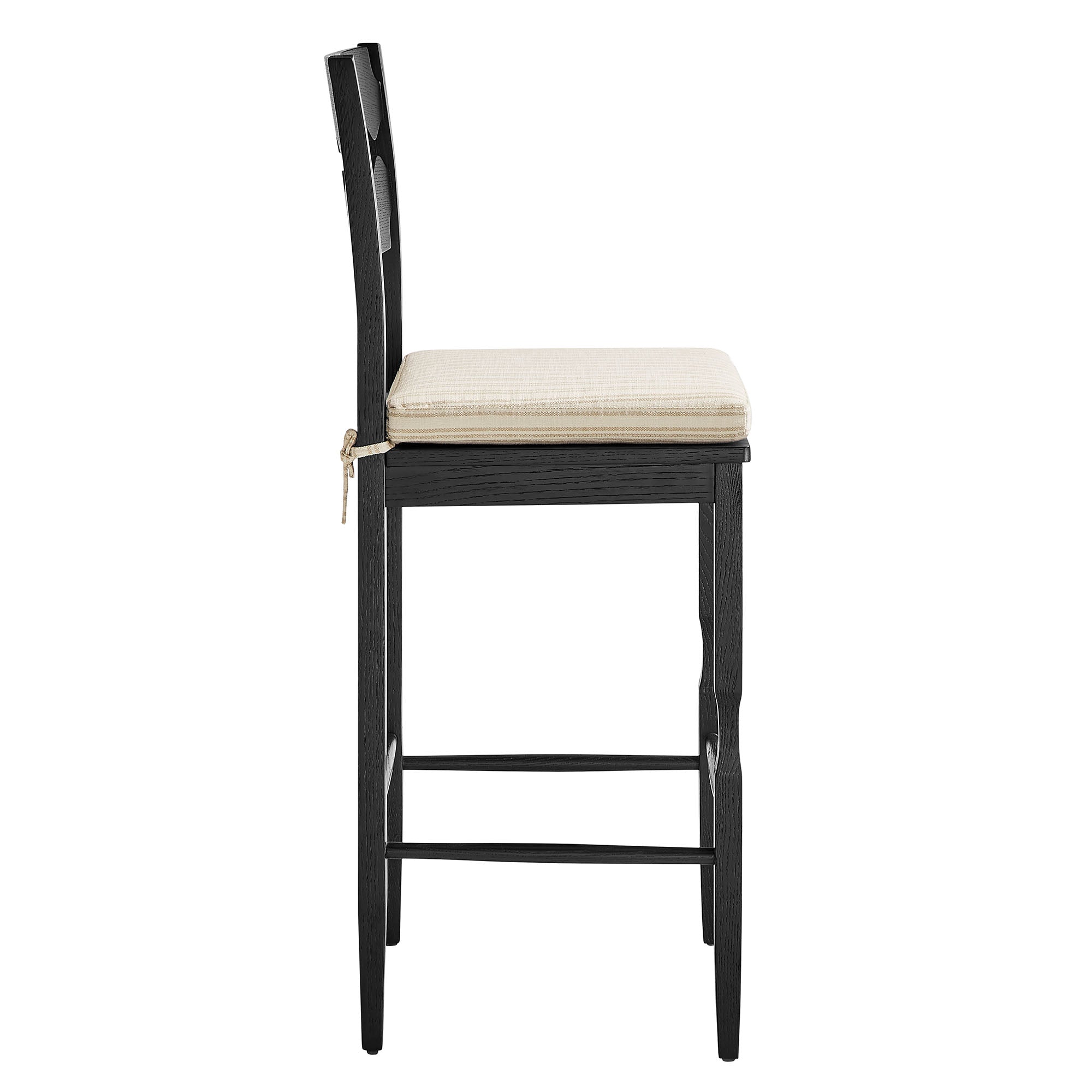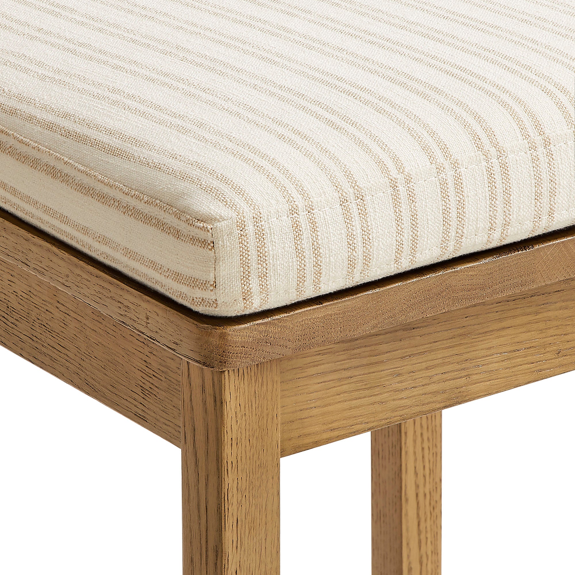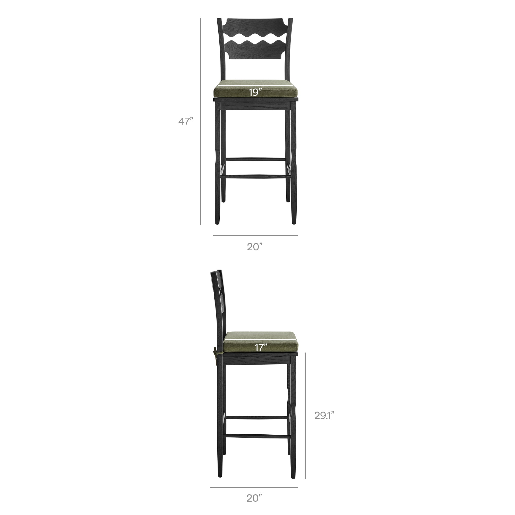 The Jax Single Oak Wood Bar Stool brings a bold, vintage-inspired profile to your space with its unique wavy razor-back. Crafted from solid oak, this wood bar stool stands comfortably at a 29 inch seat height, with the distinct back design giving a quiet nod to vintage bistro barstools. Featuring a fabric seat cushion that ties onto the frame to stay in place, this barstool also rests on a four-sided stretcher base so it feels sturdy and comfortable for everyday use. Jax is a natural fit as a bar height stool for a home bar or as an extra perch around the house. Arriving fully assembled, it comes with non-marking foot pads to help protect your floors. Weight Capacity: 300lbs.