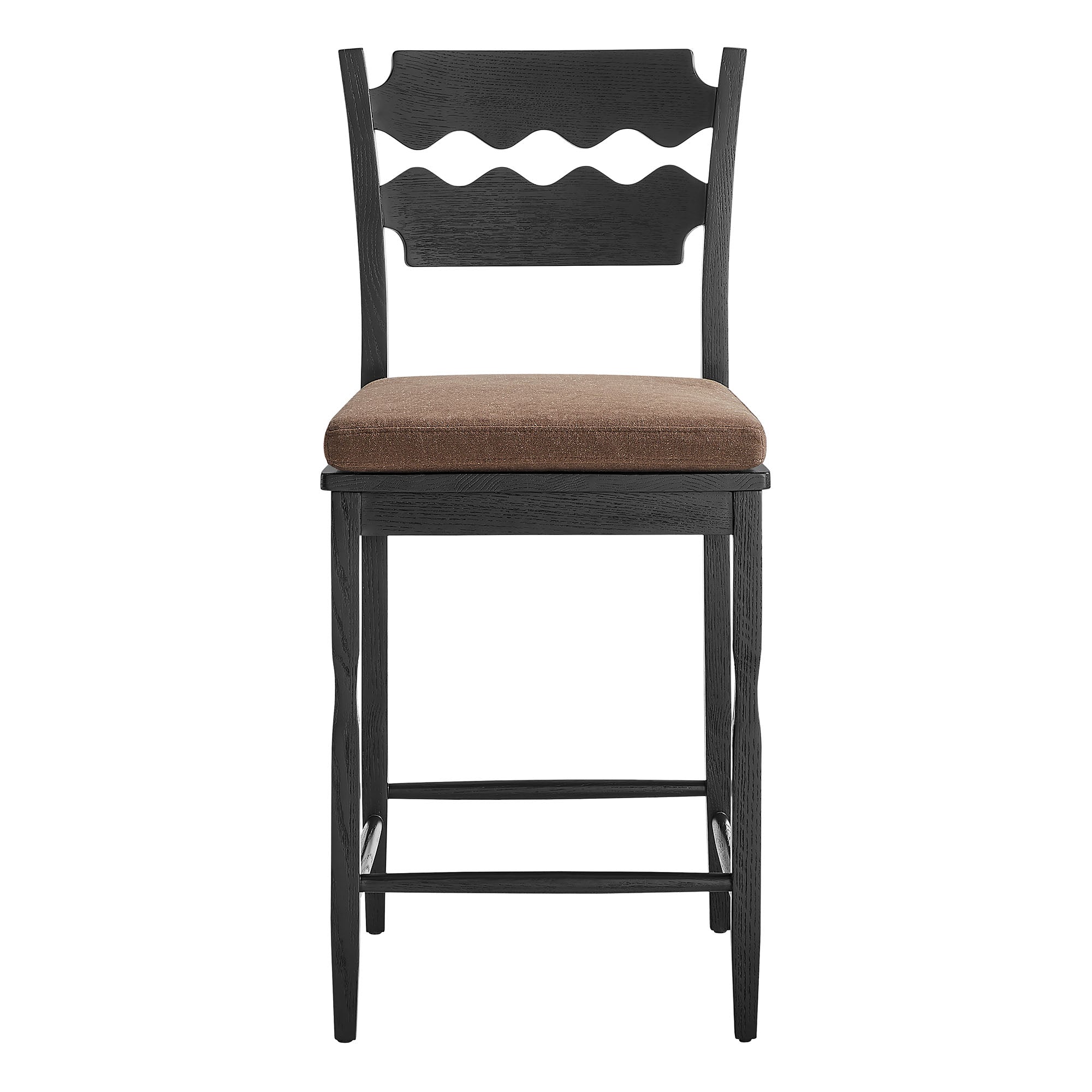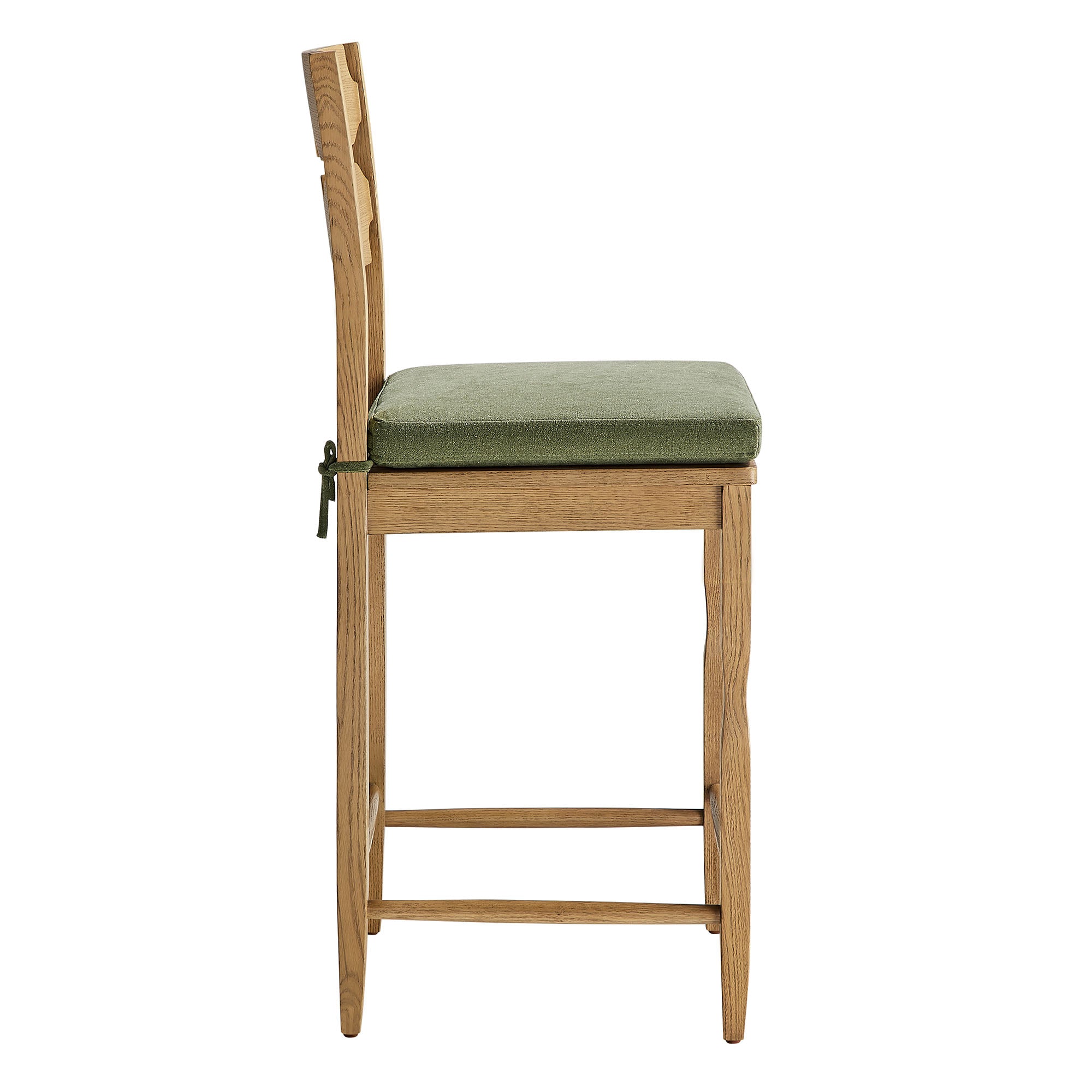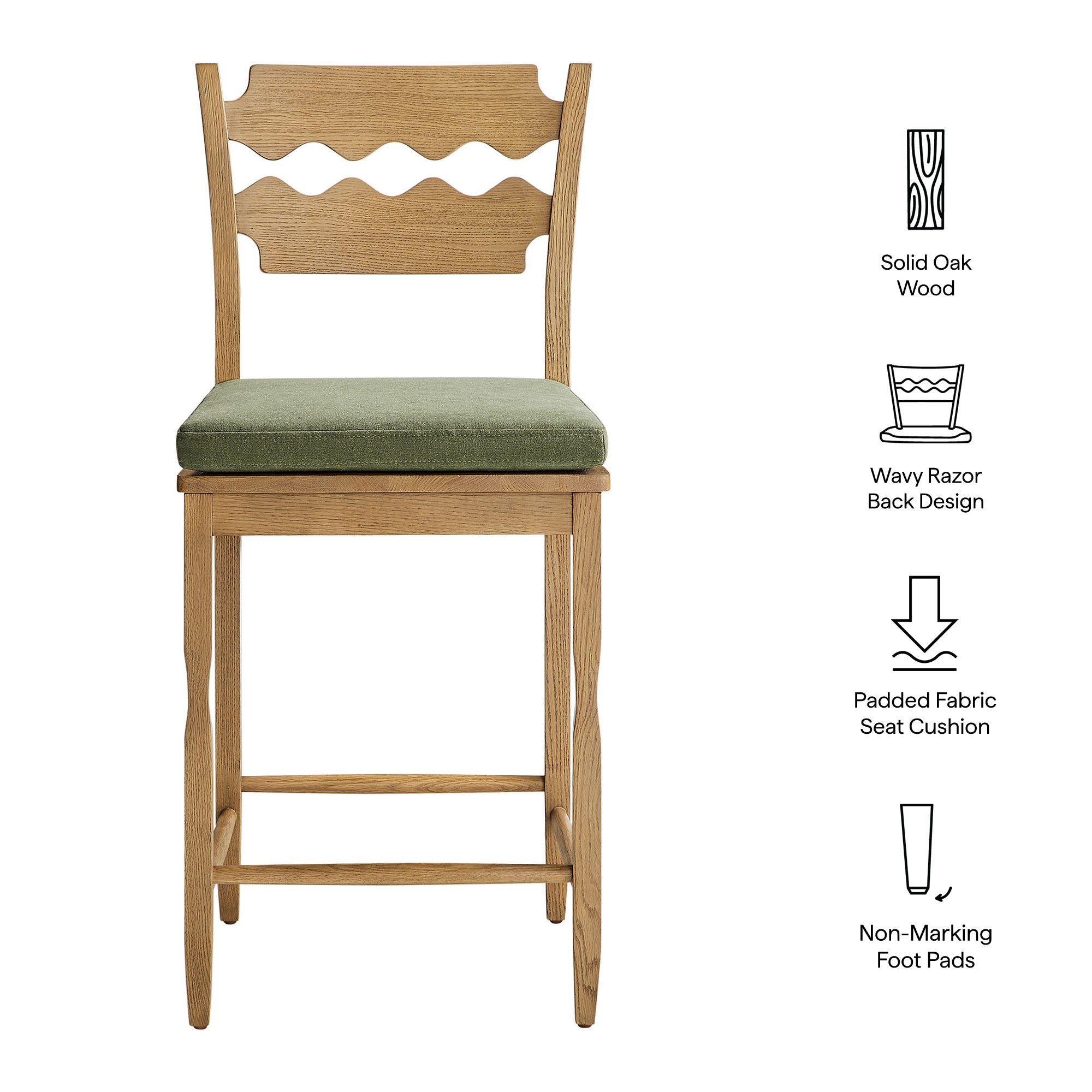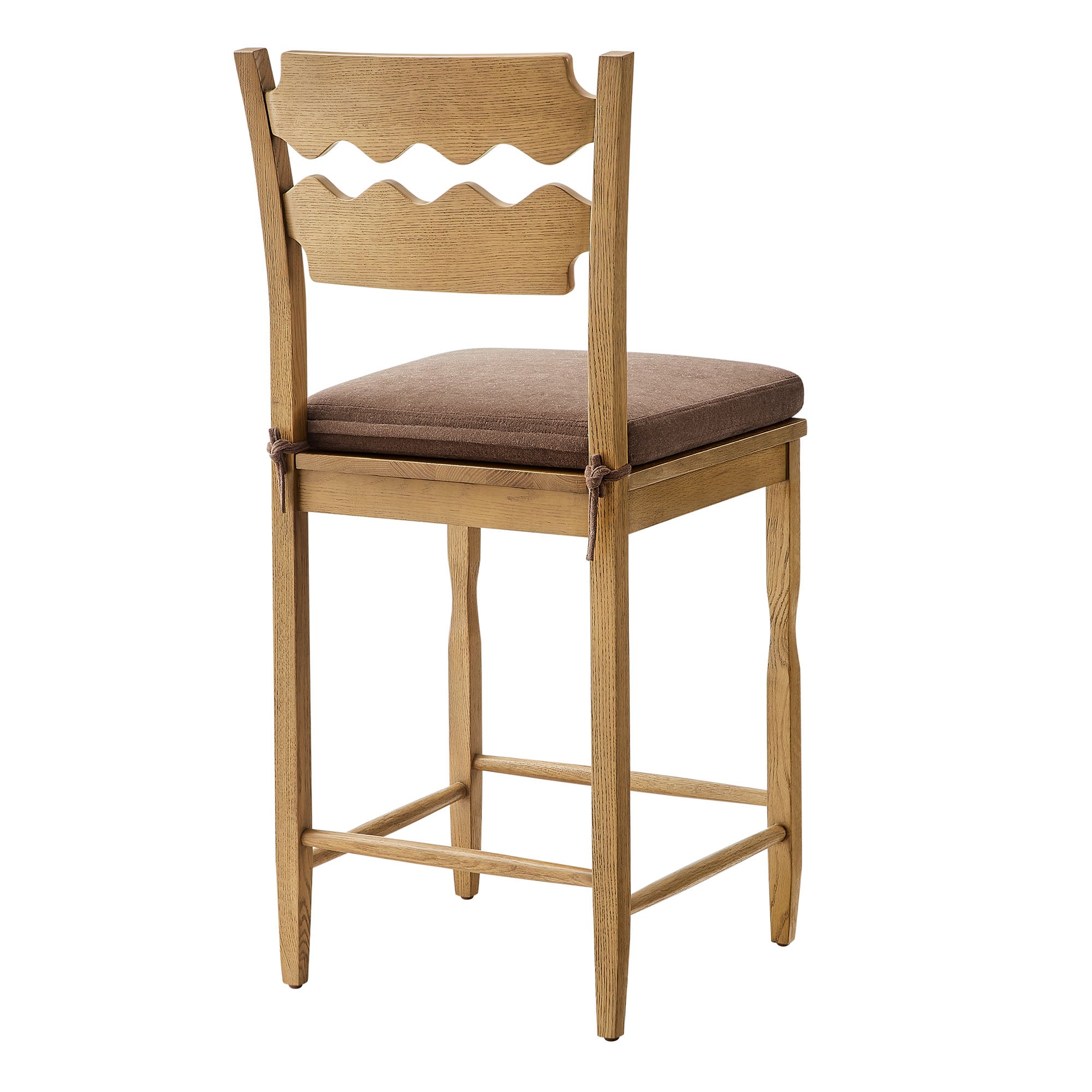 Jax Oak Wood Counter Stool With Wavy Razor Back and Cushion in Weathered Oak Linen