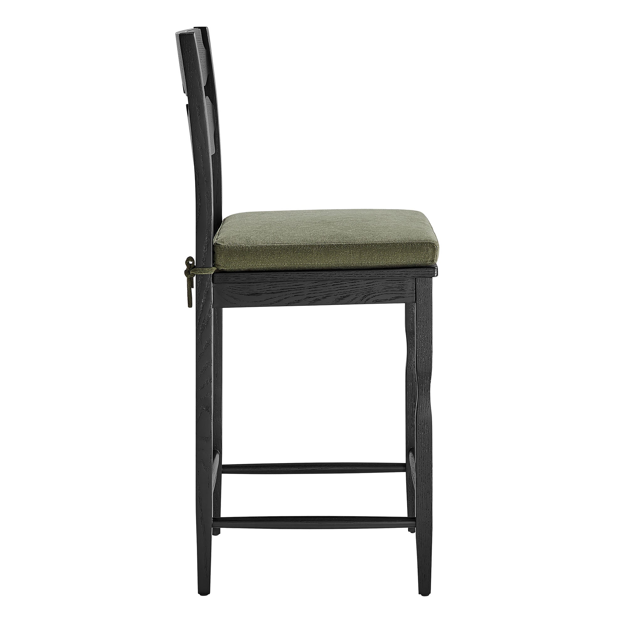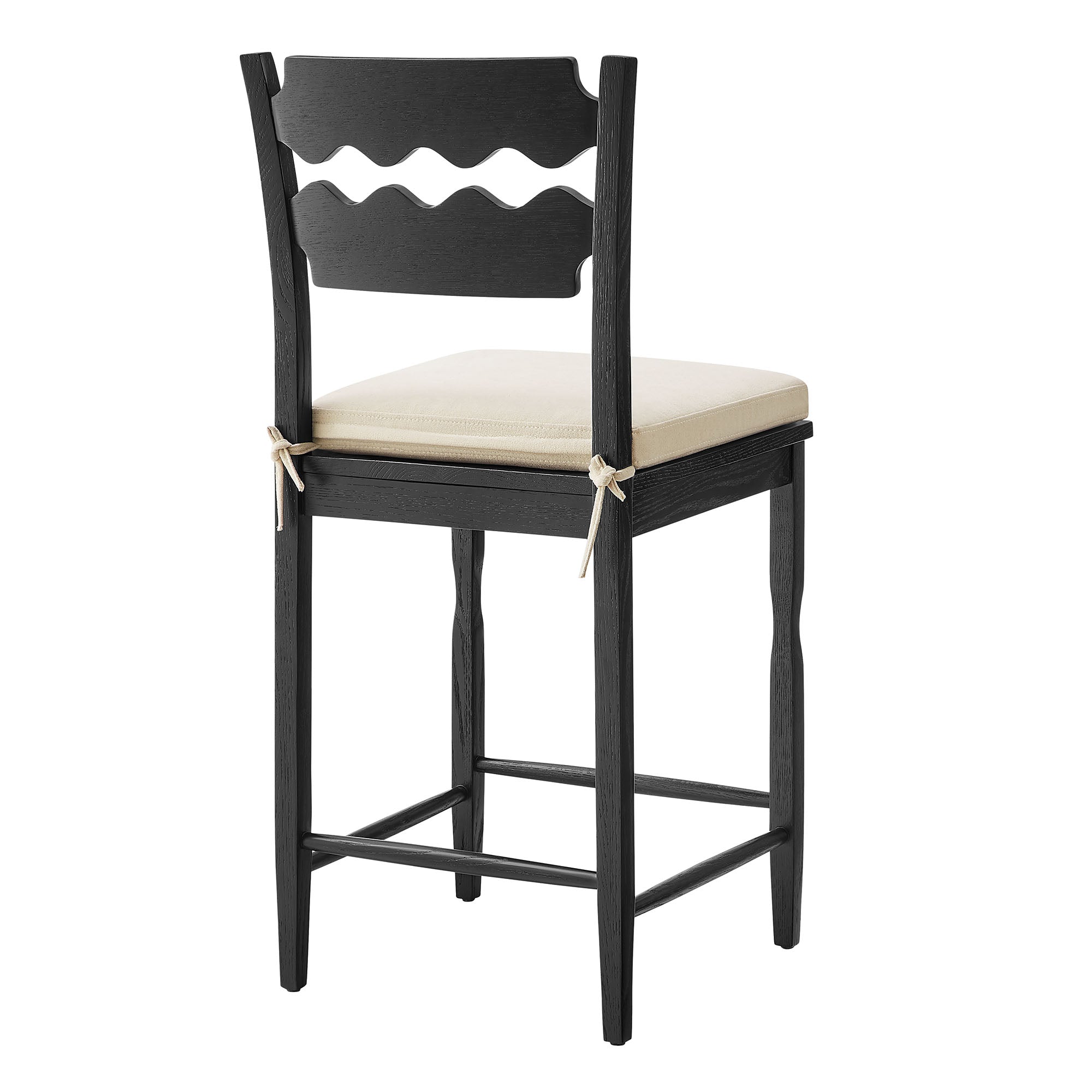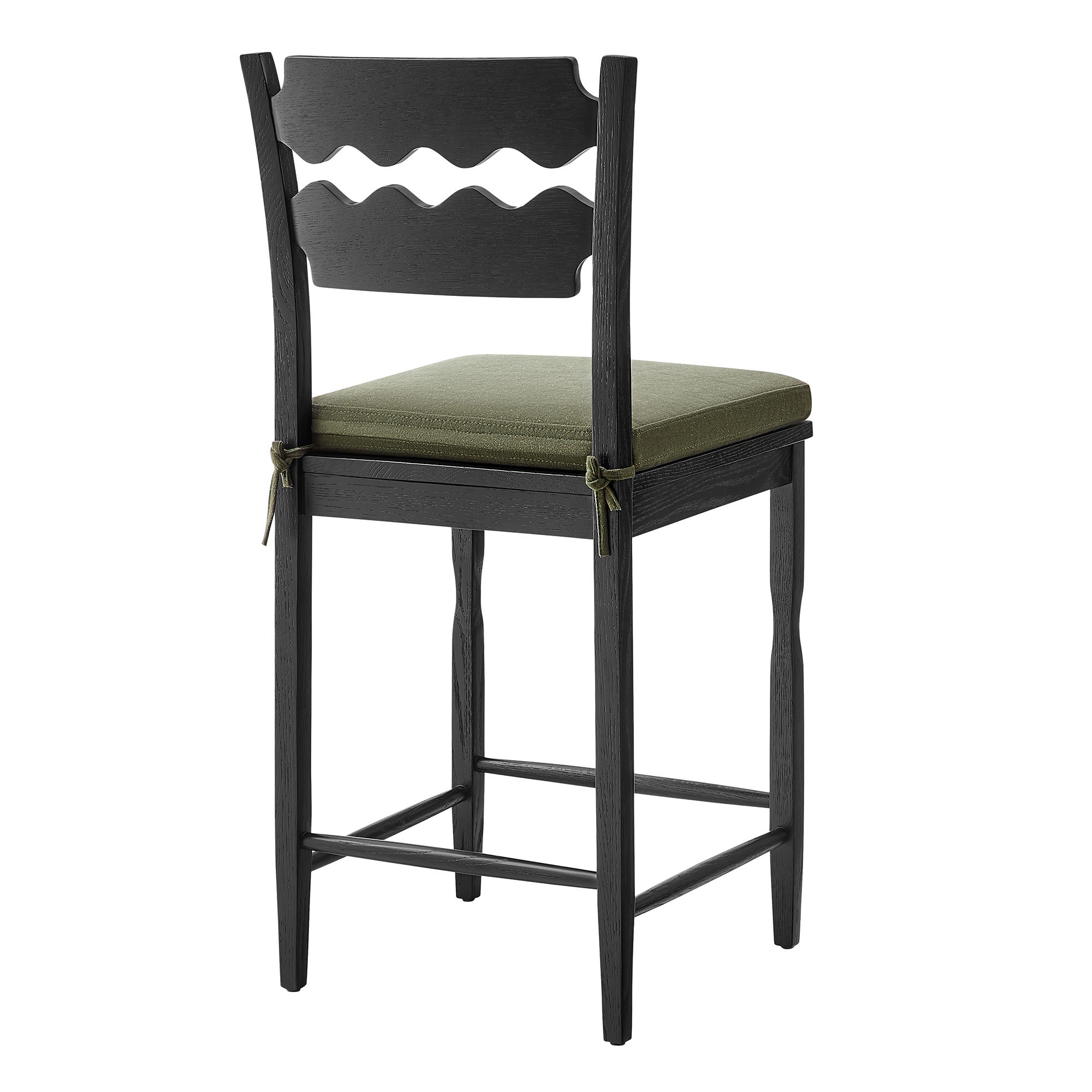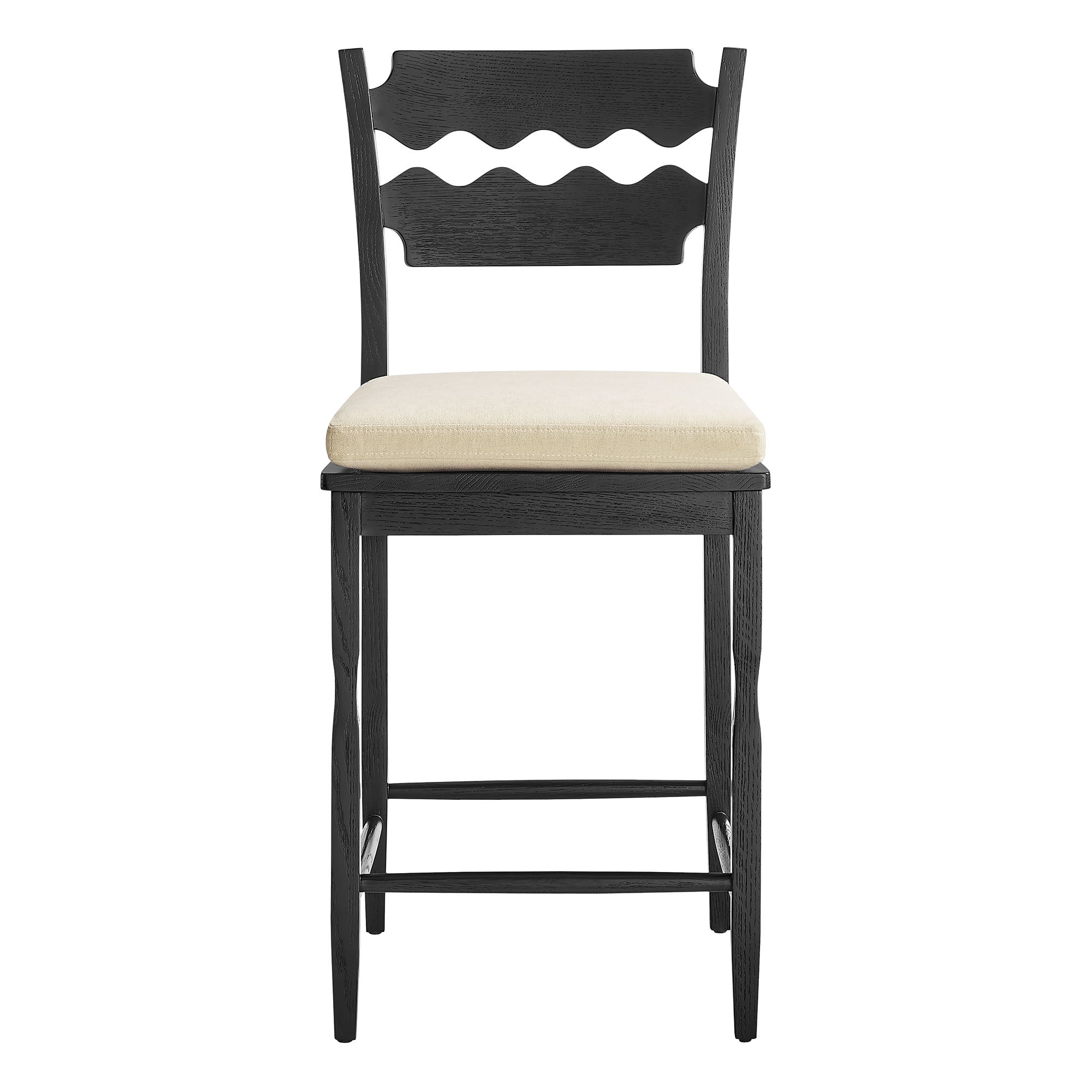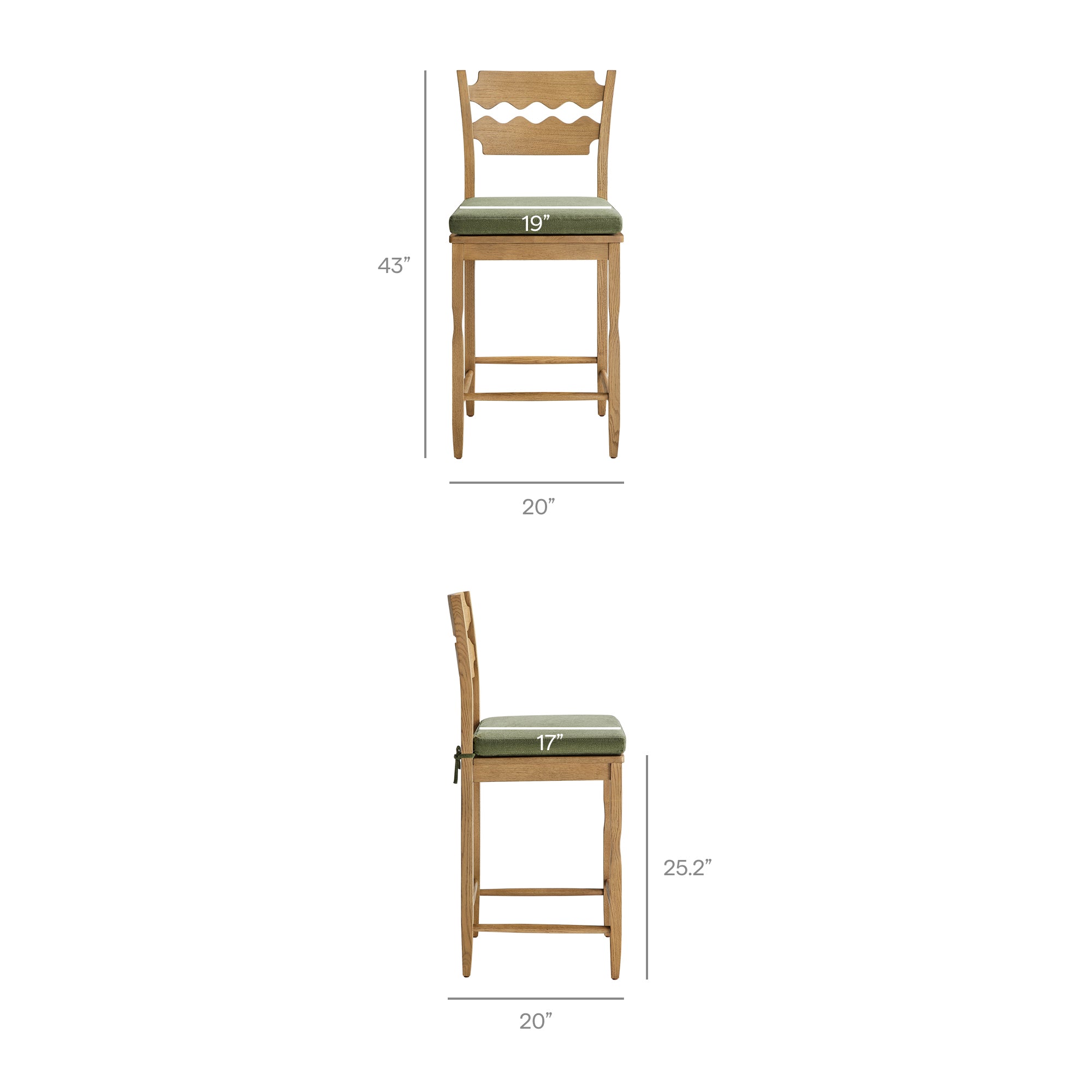 Jax Oak Wood Counter Stool With Wavy Razor Back and Cushion in Weathered Oak Linen