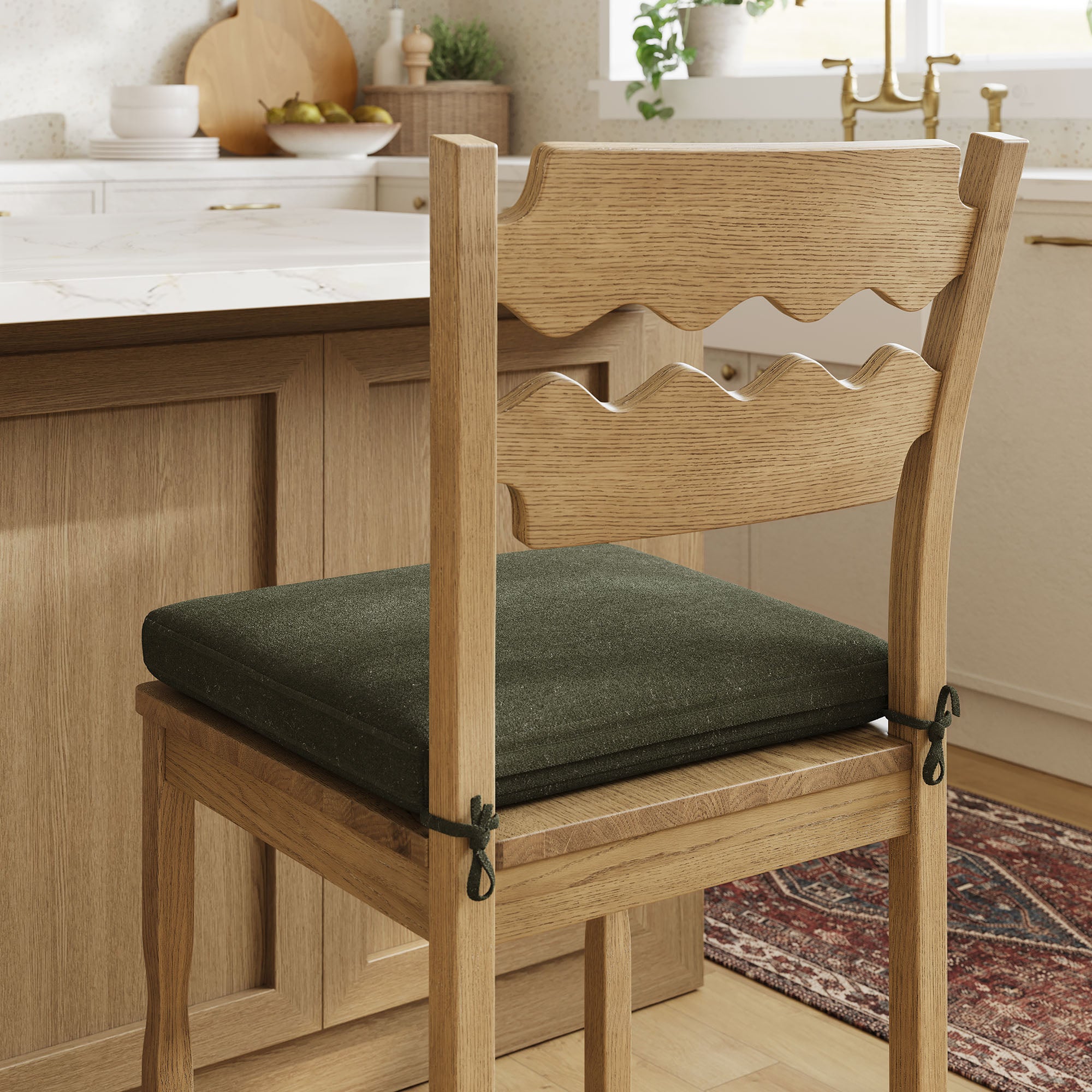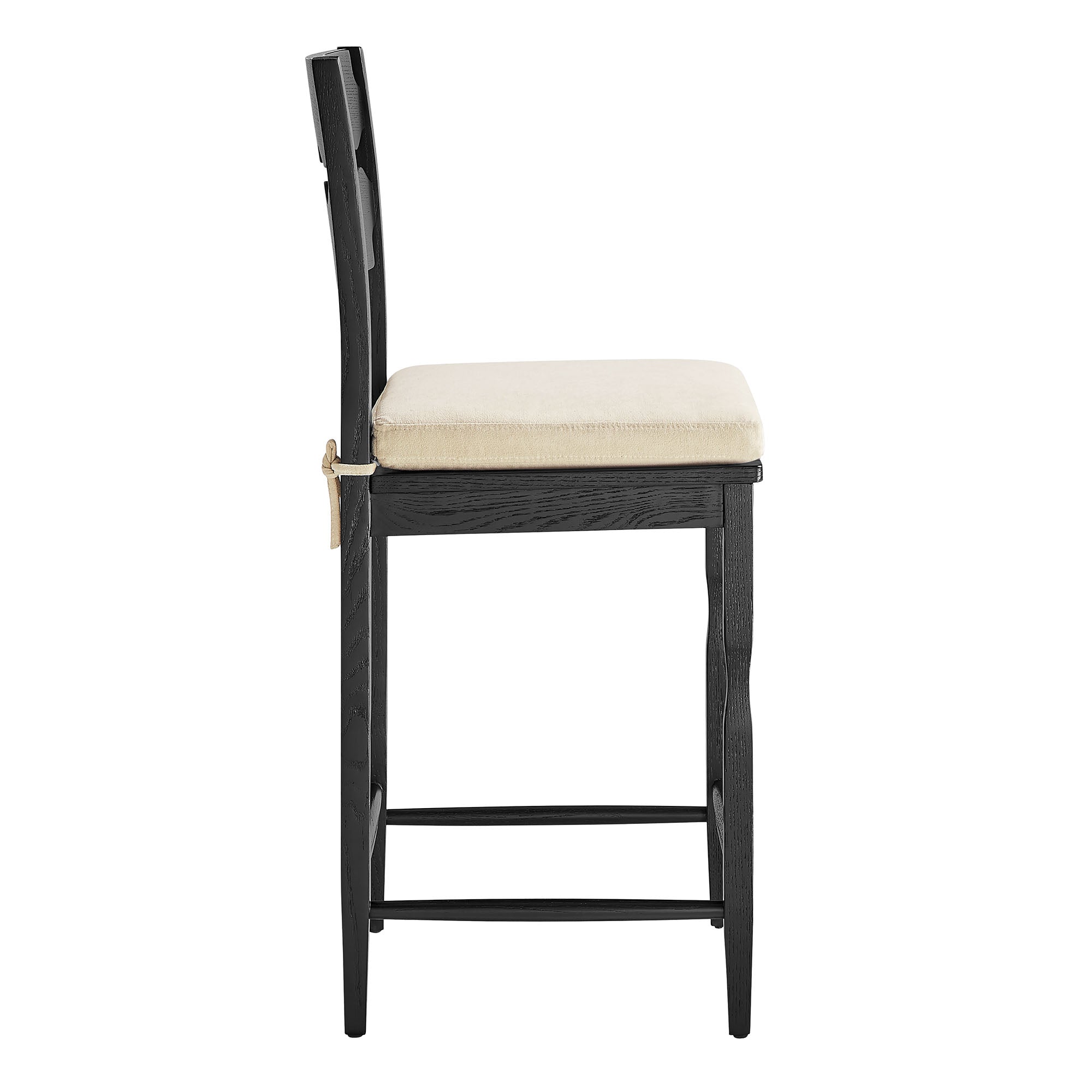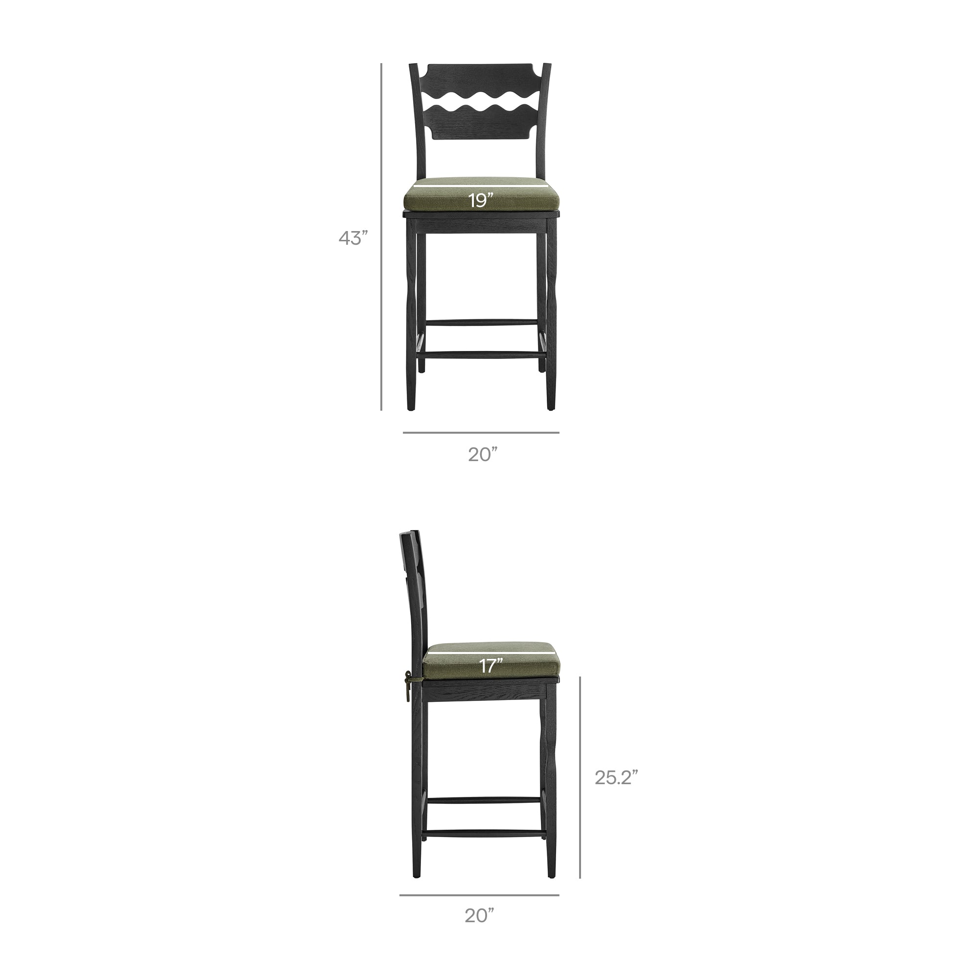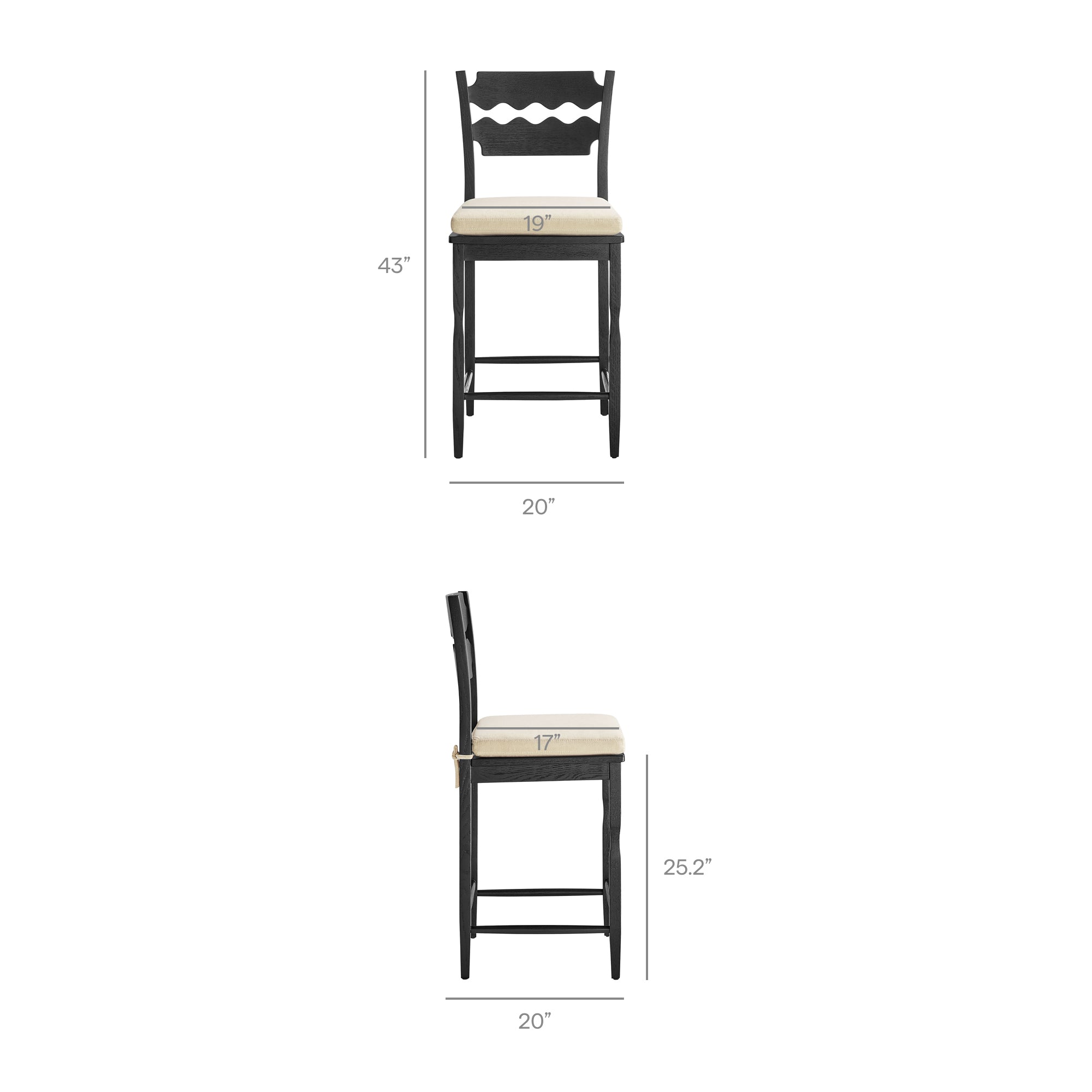 The Jax Single Oak Wood Counter Stool brings a bold, vintage-inspired profile to your space with its unique wavy razor-back. Crafted from solid oak, this wood counter stool sits comfortably a 25 inch seat height, with the distinct back design giving a quiet nod to classic café stools. Featuring a fabric seat cushion that ties onto the frame to stay in place, this counter stool also rests on a four-sided stretcher base so it feels sturdy and comfortable for everyday use. Jax is a natural fit as a counter stool for kitchen island seating, a counter chair at a breakfast bar, or extra perch around the home. Arriving fully assembled, it comes with non-marking foot pads to help protect your floors. Weight Capacity: 300lbs.