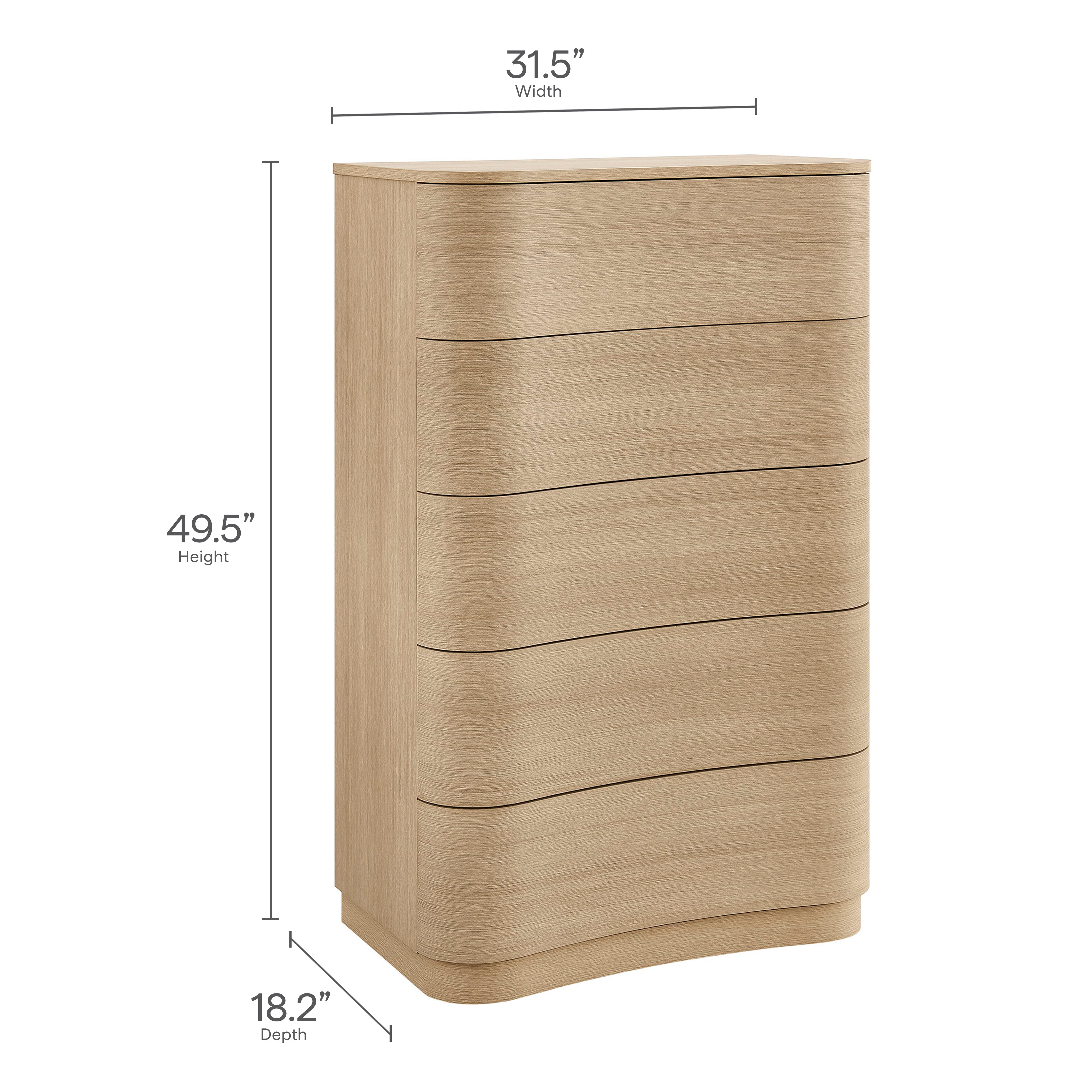 Sculptural lines and vertical storage make the Mirae 5-Drawer Dresser Chest a standout piece for the modern bedroom. Designed with a tall frame and gracefully curved drawer fronts, this upright vertical dresser brings soft edges and visual flow to any space. Smooth wood grain laminate highlights the natural form, while five spacious deep drawers offer plenty of room for clothing, linens, or everyday essentials. Whether styled as a tall dresser in the bedroom, a closet cabinet, or a vertical accent chest in a hallway or guest room, Mirae blends beauty and functionality in a streamlined profile. Assembly required.
