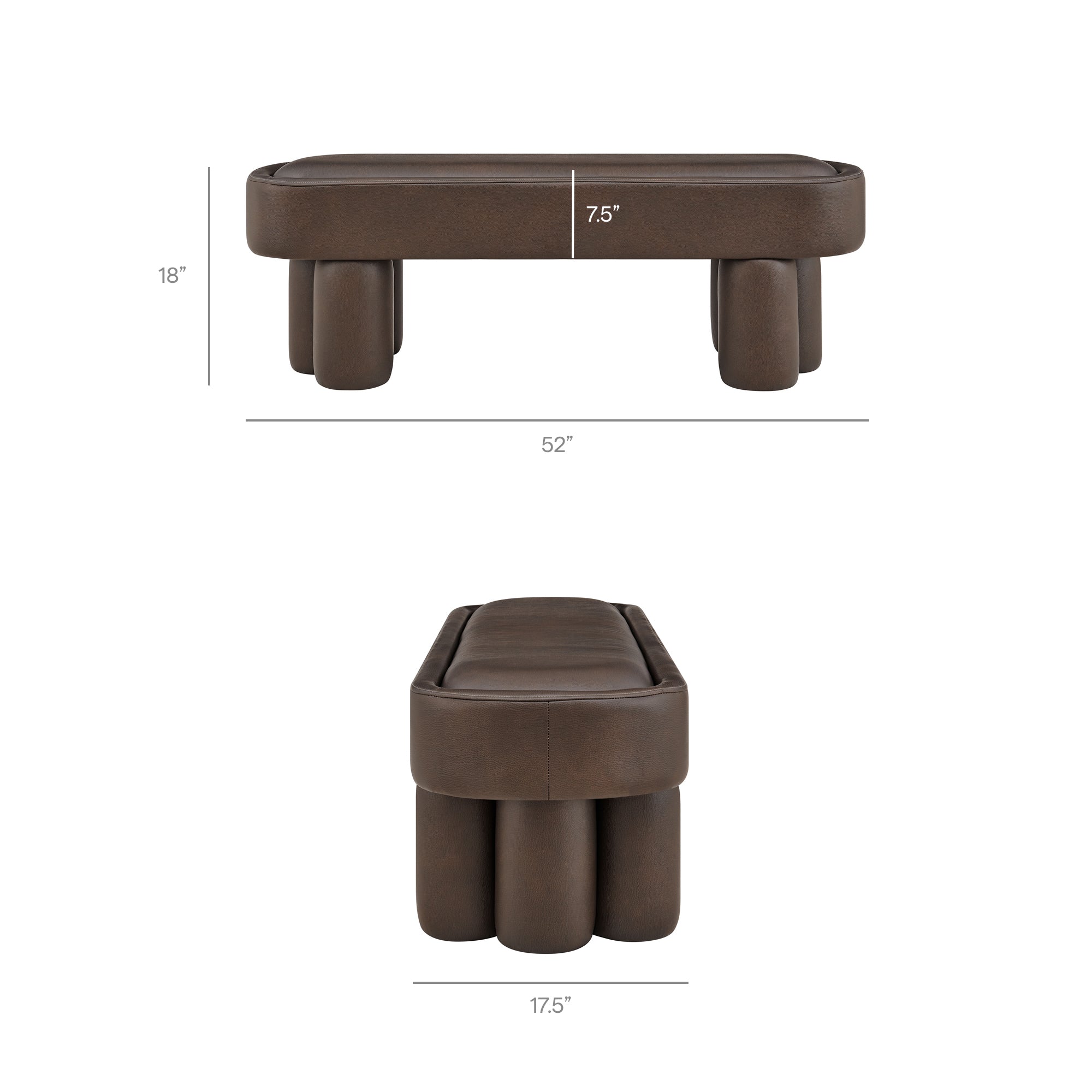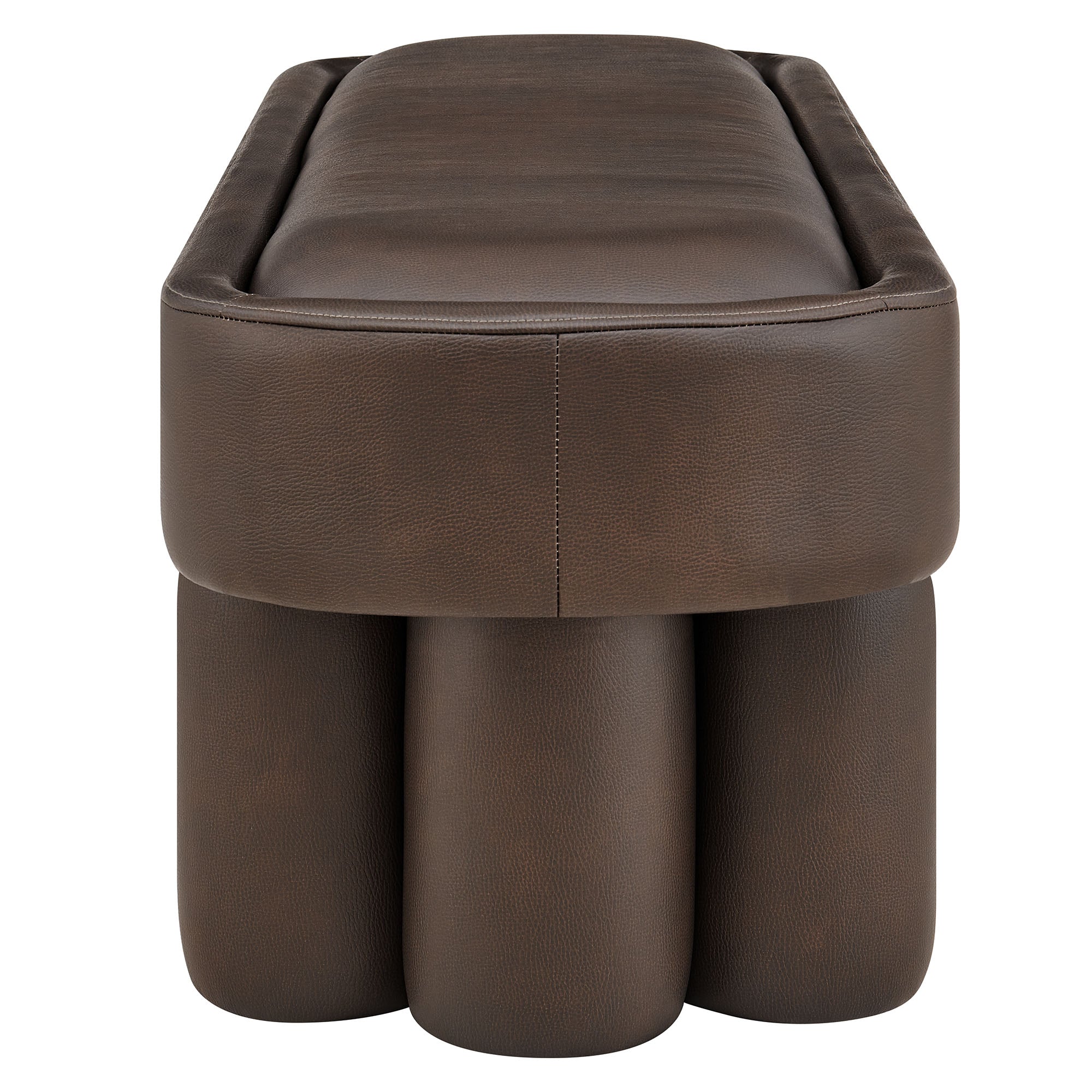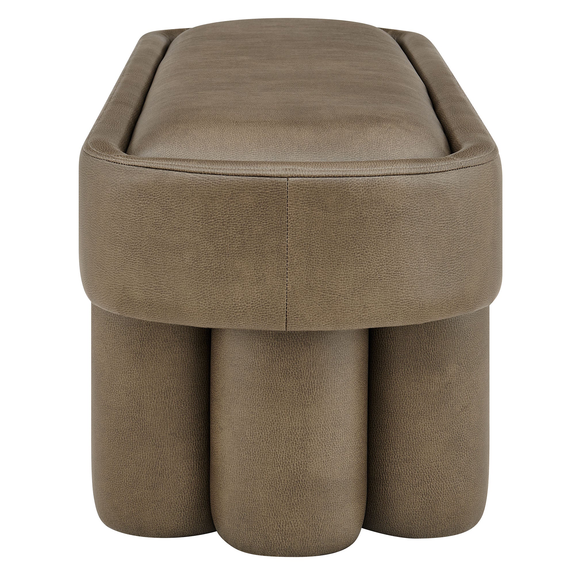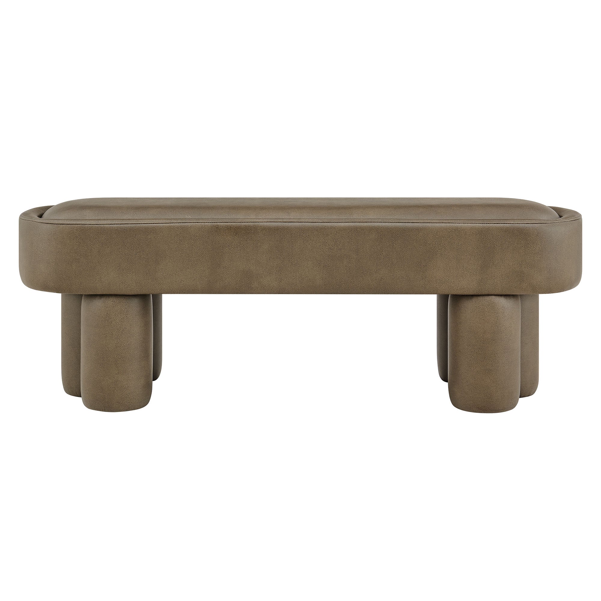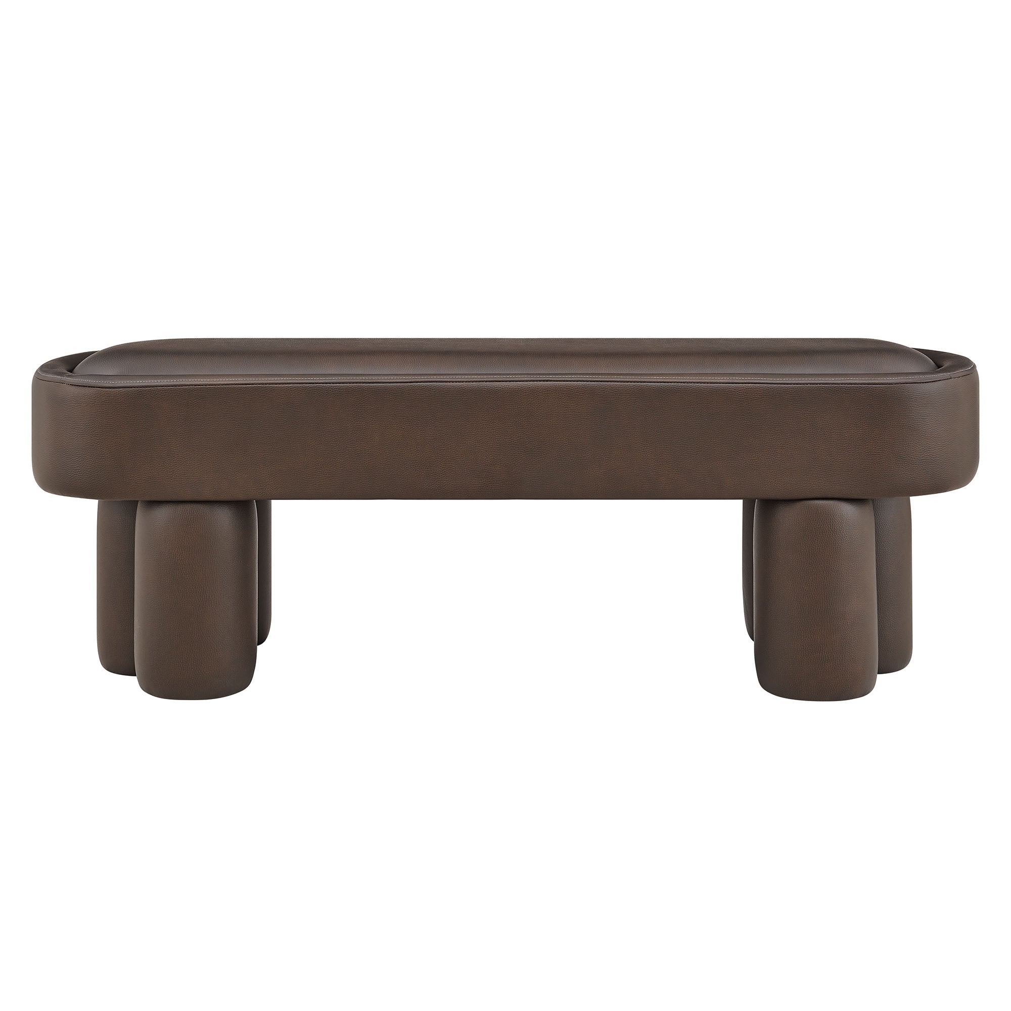 Soft curves and bold geometry define the Mossi Vegan Leather Bench, a modern accent piece with sculptural appeal. Upholstered in vegan leather, this 52-inch oval bench has a smooth, tailored look and an inset seat cushion for added comfort. Resting on cylindrical legs resembling a clover-like base, Mossi makes a striking design statement while providing sturdy support. Whether styled at the end of a bed, in an entryway, or as a lounge bench in the living room, this faux leather bench combines practicality with contemporary artistry. Weight Capacity: 300 lbs.