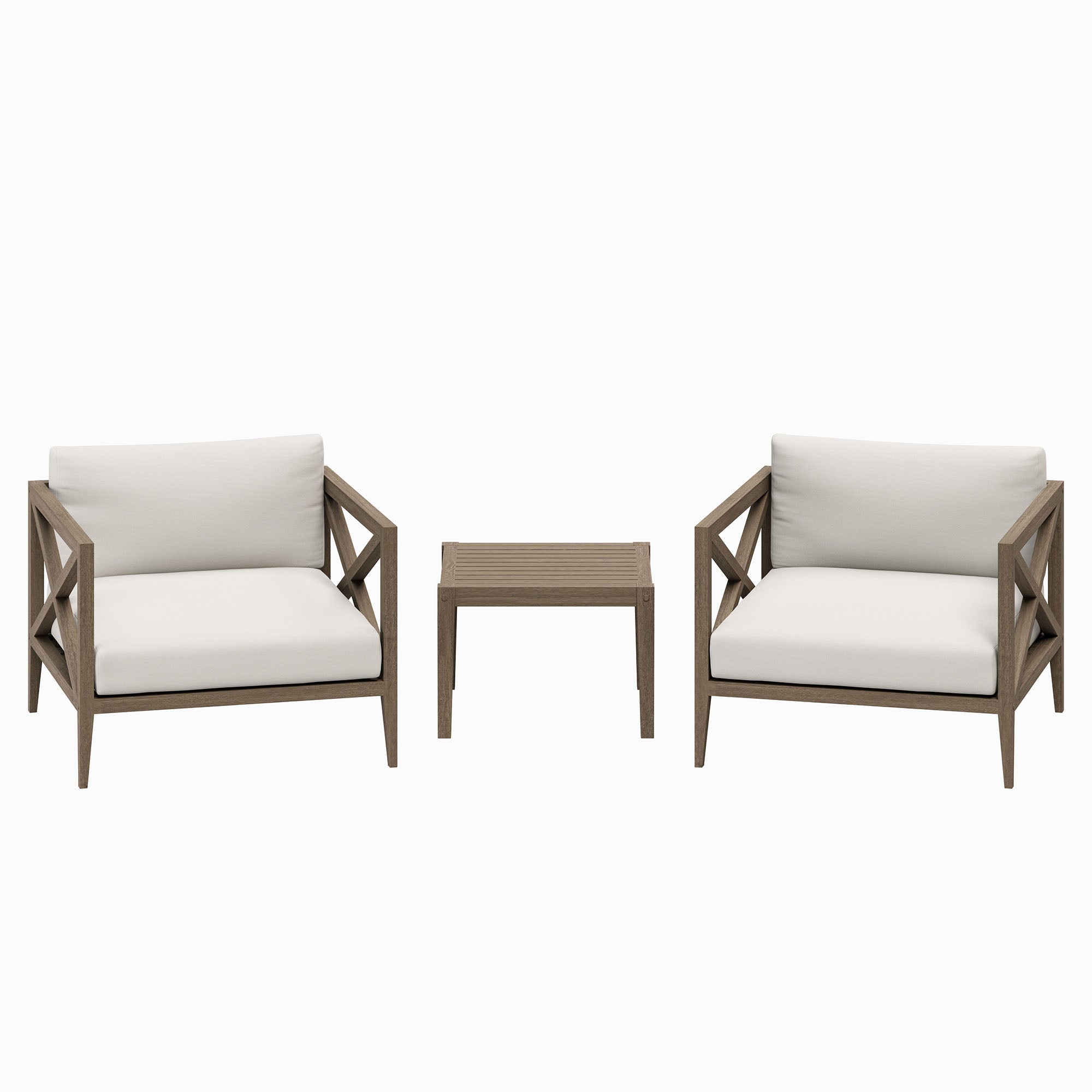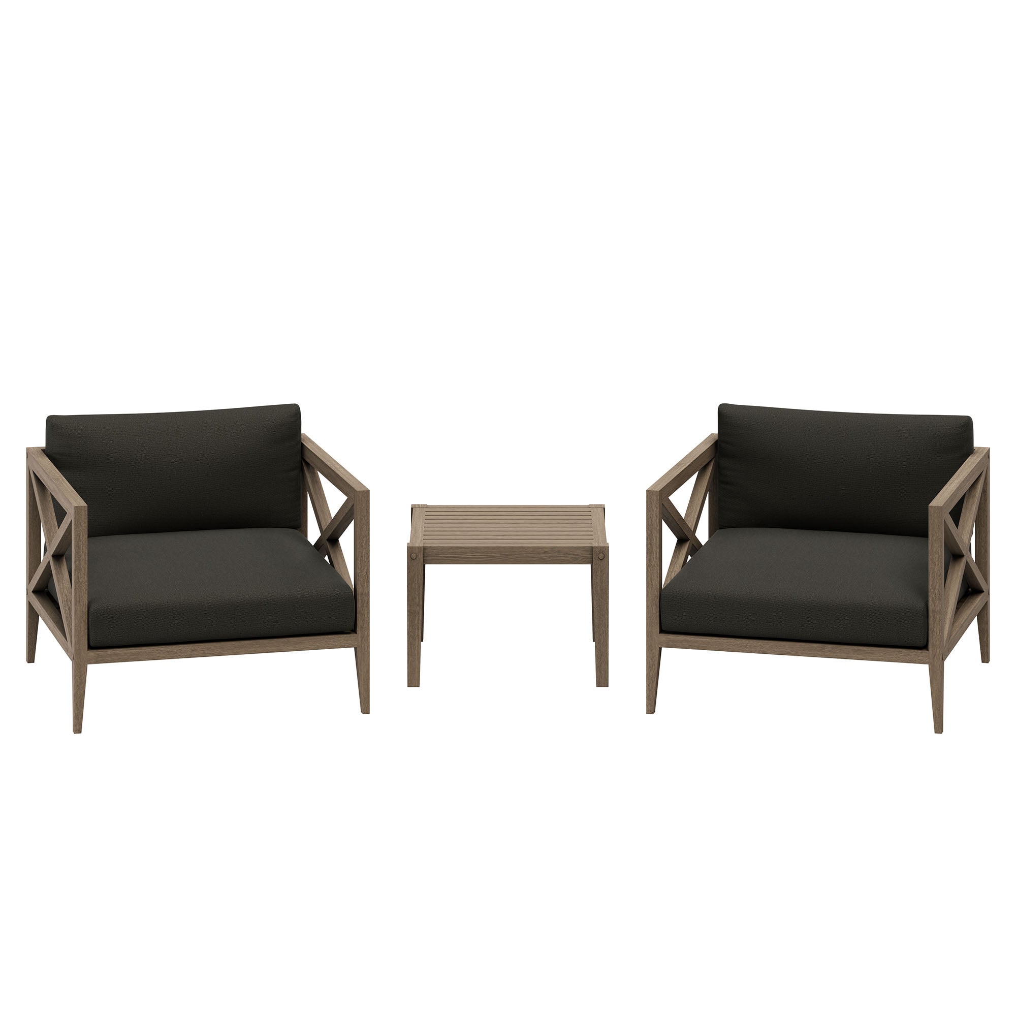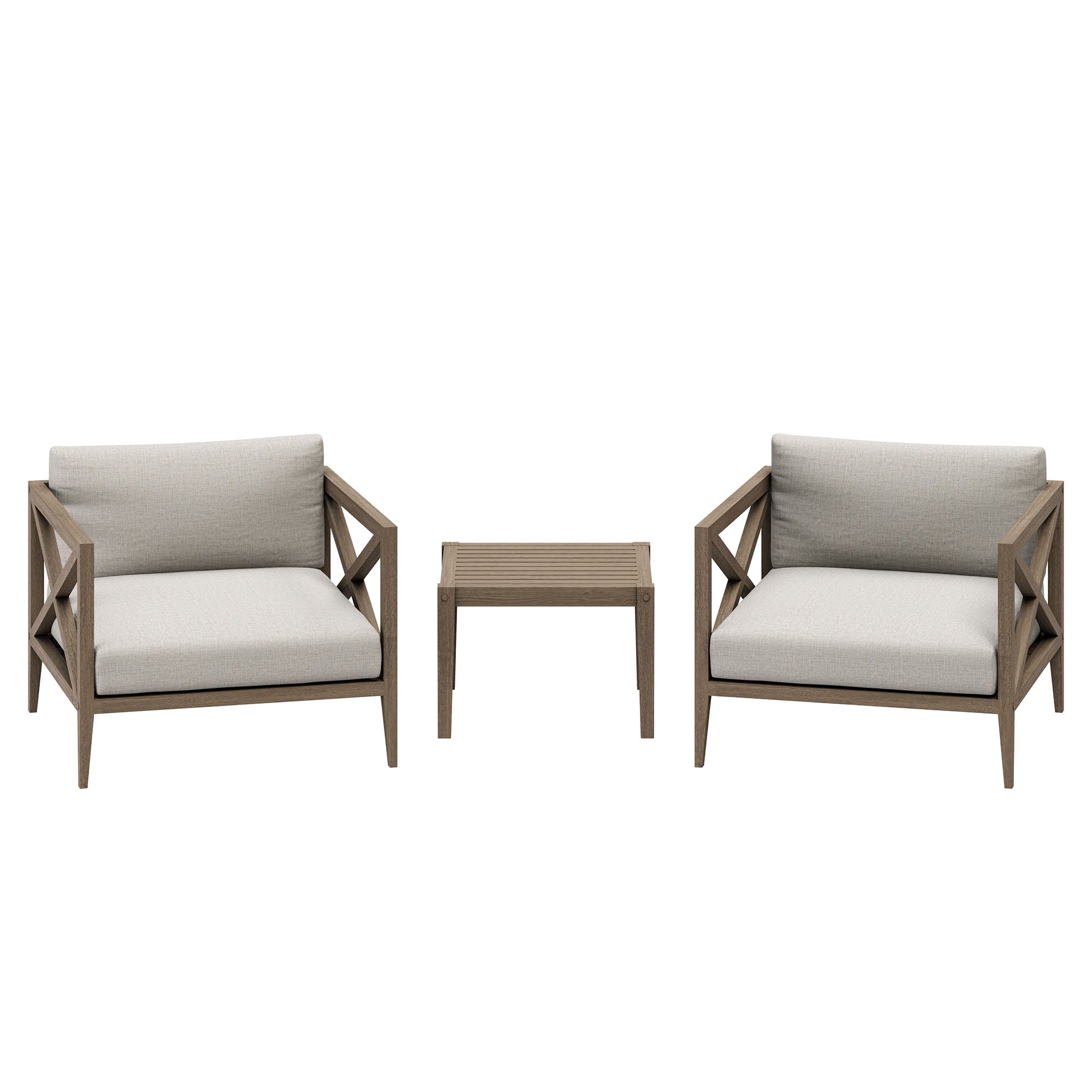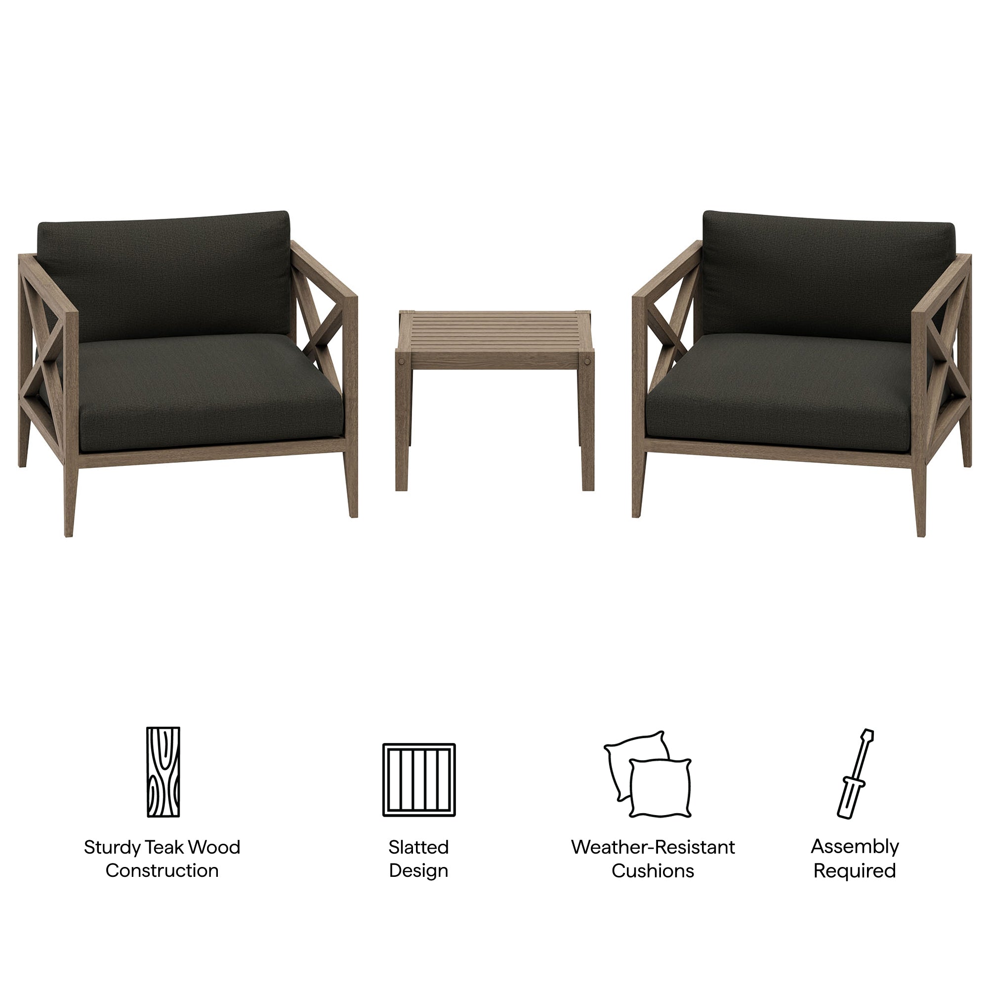 Soak in nature’s beauty with the Northlake 3-Piece Outdoor Furniture Set, featuring stylish lounge armchairs and matching side table. These pieces are crafted from durable teak wood, making them ideal for outdoor use. The wide armchairs showcase a distinctive cross-back frame for added support and a refined aesthetic. A slatted seat base encourages airflow and lasting comfort, while plush, all-weather cushions are water-resistant, fade-resistant, and quick-drying for use through every season. The coordinating square side table is designed with a smooth, slatted top for quick drainage, providing a convenient surface for drinks, decor, or outdoor essentials. Perfect for patios, porches, balconies, and garden lounges, this set blends timeless craftsmanship with modern outdoor luxury. Includes non-marking floor glides for added protection. Assembly required.