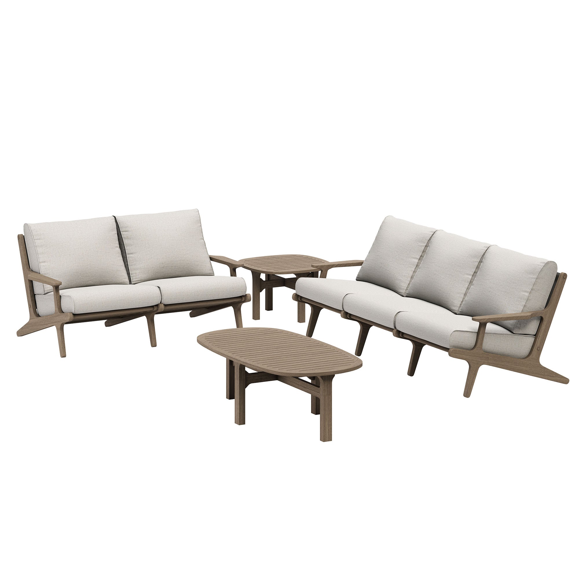 Refresh your outdoor space with the Saratoga 4-Piece Patio Furniture Set. Expertly crafted from durable teak wood with a water-based finish that highlights its natural grain, this backyard furniture set includes a sofa, loveseat, side table and coffee table. The sofa and loveseat feature an angular frame with sculpted armrests, slatted seat foundations, and plush seat and back cushions covered in weather-resistant, water-resistant, and stain-resistant fabric for easy maintenance and year-round relaxation. The coffee and side tables boast beautifully slatted tops with intersecting stretcher bases, offering both durability and a refined silhouette. Perfect for patios, and outdoor lounge areas, the Saratoga 4 Piece Patio Set blends modern design with timeless craftsmanship. Assembly required.