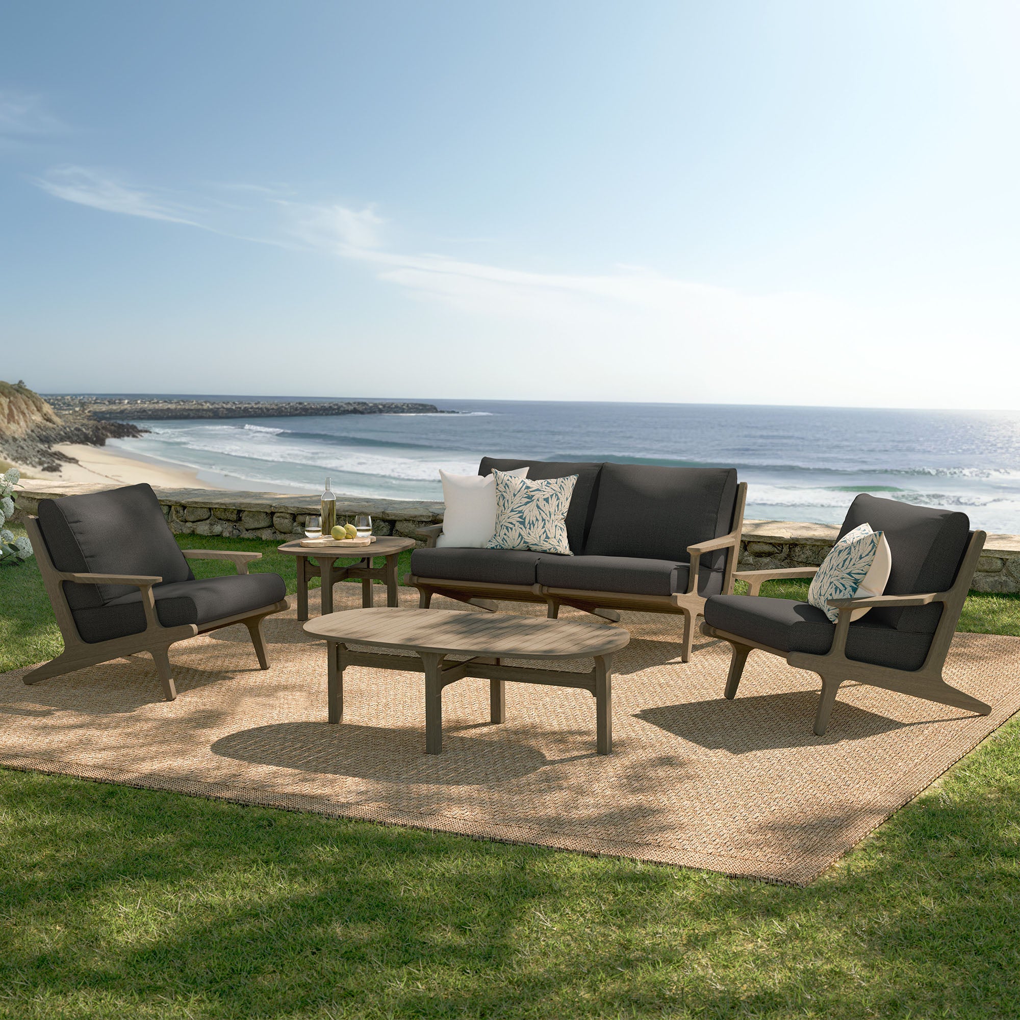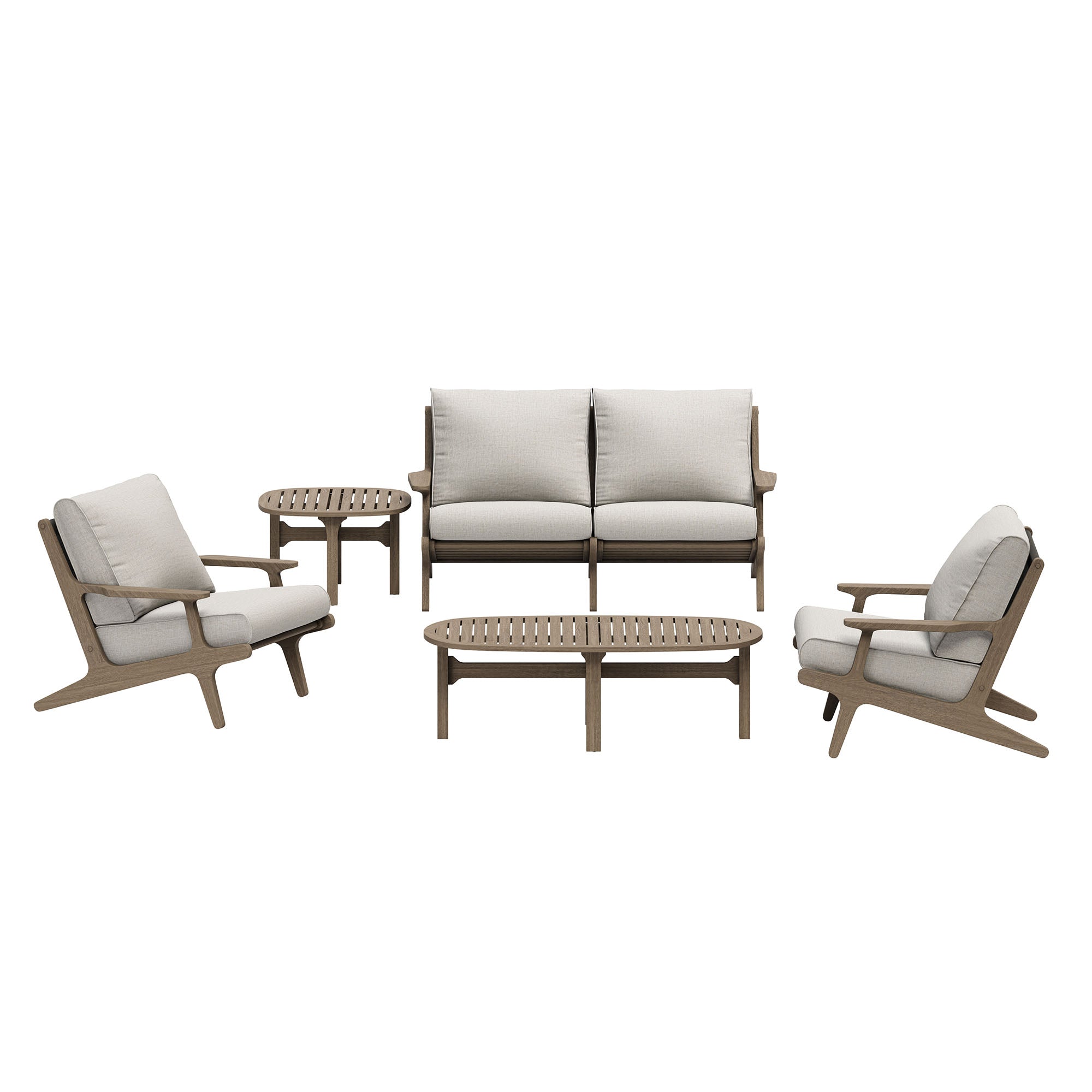 Refresh your outdoor space with the Saratoga 5-Piece Patio Furniture Set. Expertly crafted from durable teak wood with a water-based finish that highlights its natural grain, this backyard furniture set includes a loveseat, two lounge chairs, a coffee table, and a side table. The loveseat and lounge chairs feature an angular frame with sculpted armrests, slatted seat foundations, and plush seat and back cushions covered in weather-resistant, water-resistant, and stain-resistant fabric for easy maintenance and year-round relaxation. The coffee and side tables boast a beautifully slatted top with an intersecting stretcher base, offering both durability and a refined silhouette. Perfect for patios, porches, and outdoor lounge areas, the Saratoga 5 Piece Patio Set blends modern design with timeless craftsmanship. Assembly required.