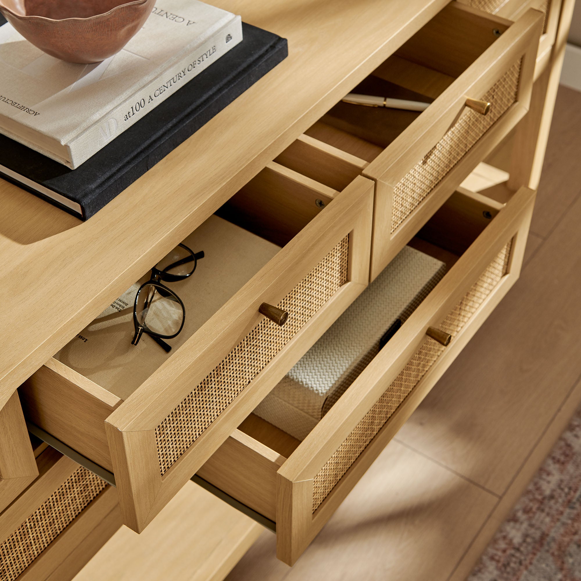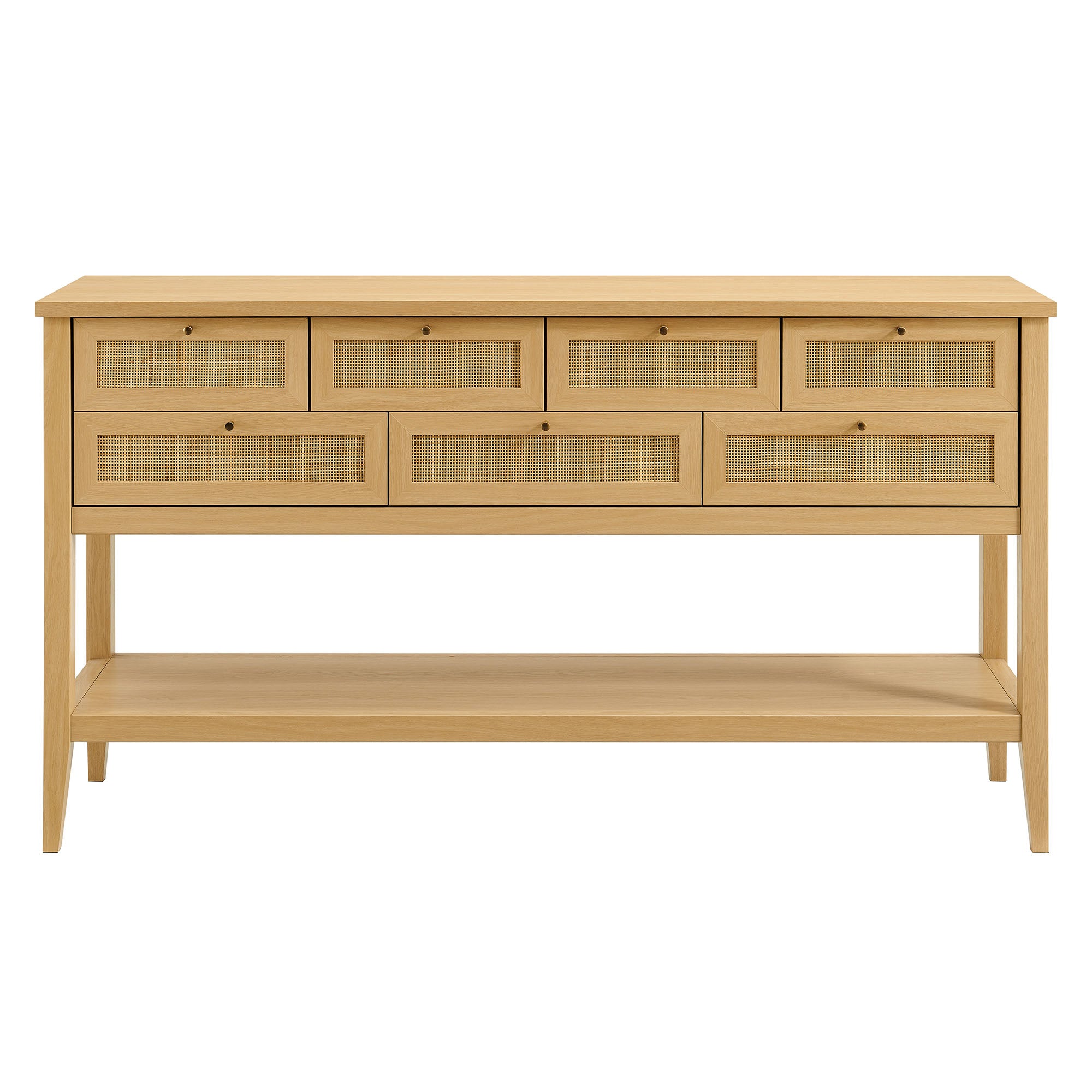 Introduce refreshing style to your living space with the Soma 62 inch Console Table. Showcasing a beautiful synthetic rattan weave on the drawer fronts, this narrow console works well as an entry console table, a console table behind the couch, or a small hallway table. Made from a laminated wood blend with a natural wood grain design, Soma features seven drawers—four across the top row and three across the bottom—great for tucking everyday items away. Meanwhile, the open lower shelf offers a place for baskets, shoes, or a few favorite accents. Includes non-marking foot pads to help protect flooring. Weight Capacity: Distributed: 194lbs, Upper Drawer : 11lbs x 4, Lower Drawer : 11lbs x 3, Bottom : 154lbs.