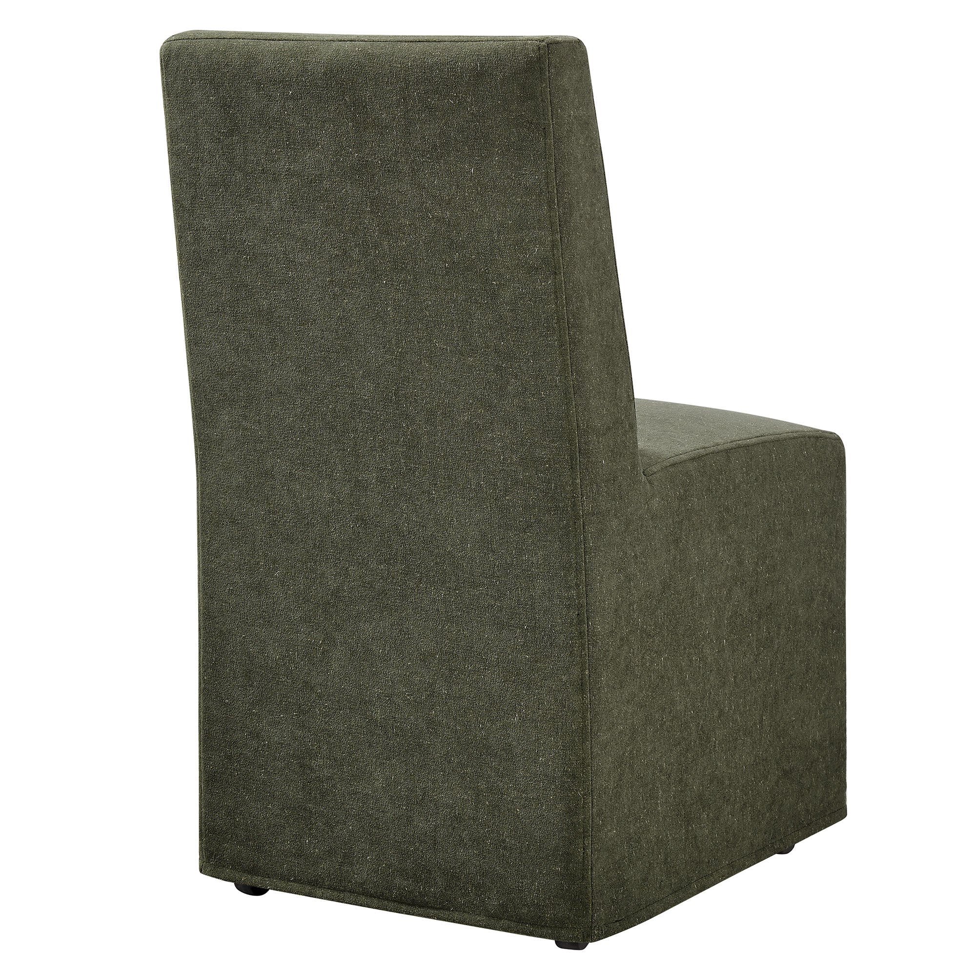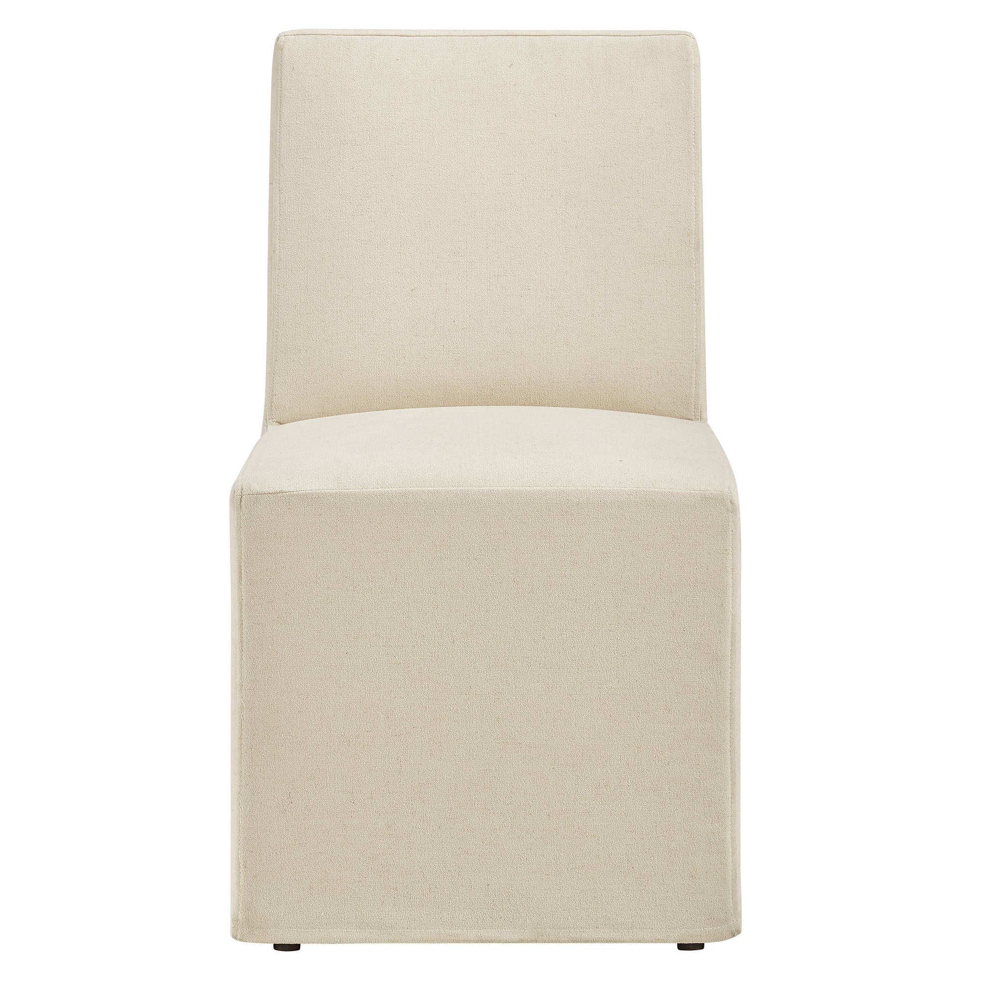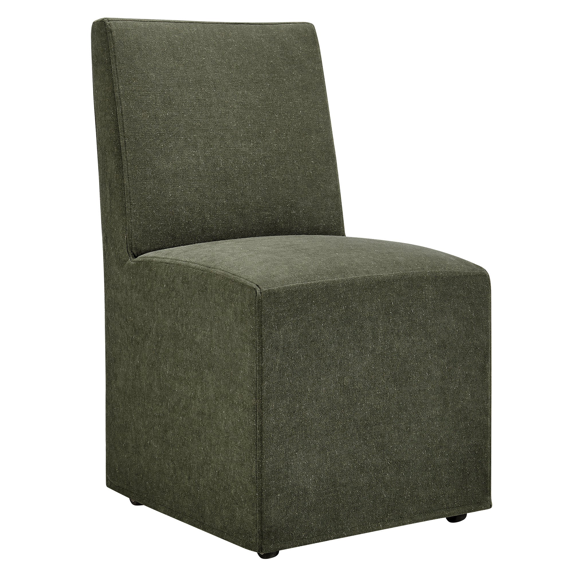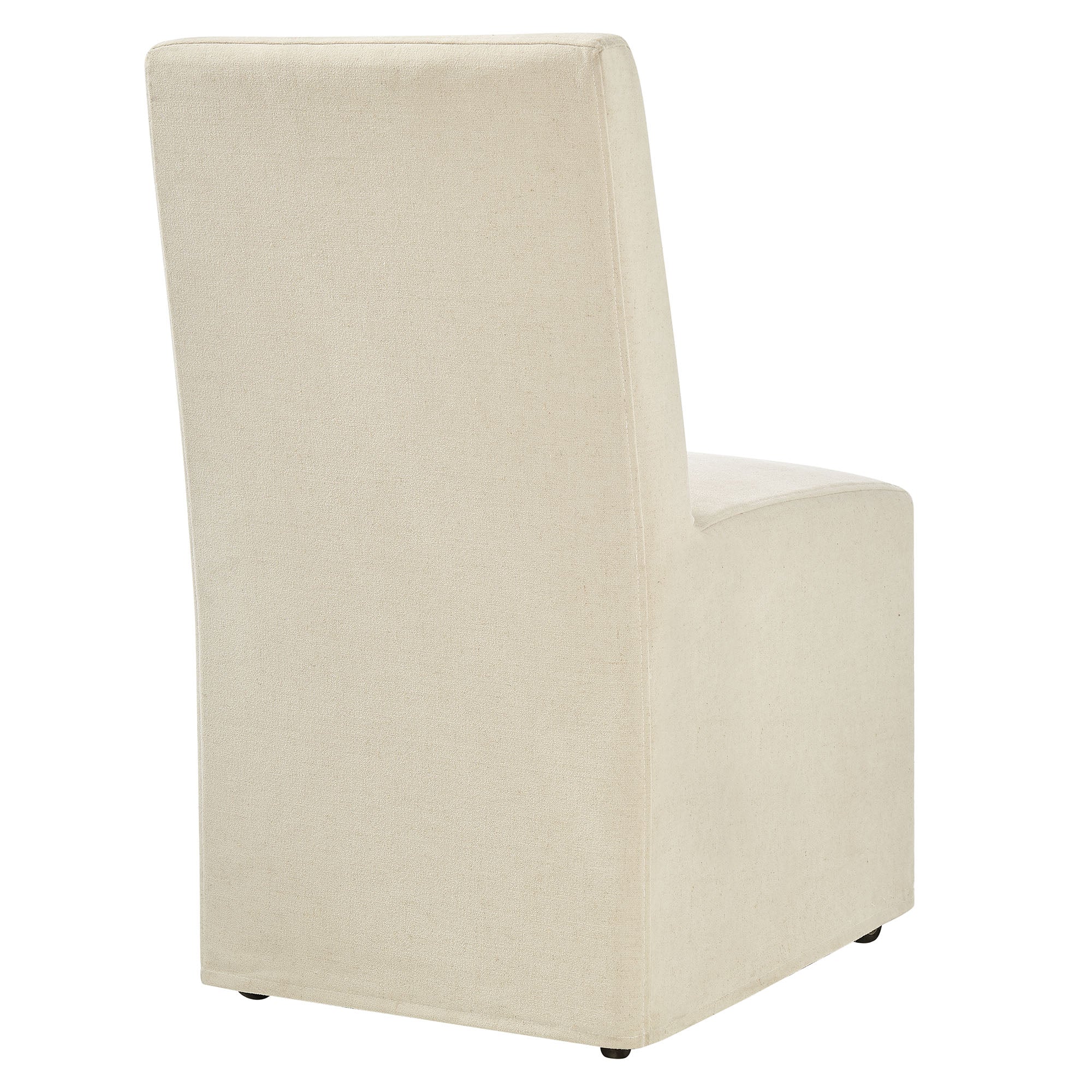 The Tessera Slipcovered Dining Side Chair adds an easy, relaxed feel to everyday dining. Upholstered in a linen-blend fabric, this upholstered dining chair features a tailored removable slipcover for a clean, put-together look. The padded seat and tall backrest provide supportive comfort, while the simple silhouette works well in a dining room, kitchen, or entryway. Set on a kiln-dried wood frame, this slipcovered chair is built for regular use. Hidden casters underneath offer smooth movement, making it easy to roll into place around the table. With its straightforward lines and soft fabric, this single fabric dining chair suits modern farmhouse, coastal, and minimalist spaces. Arrives Fully Assembled.