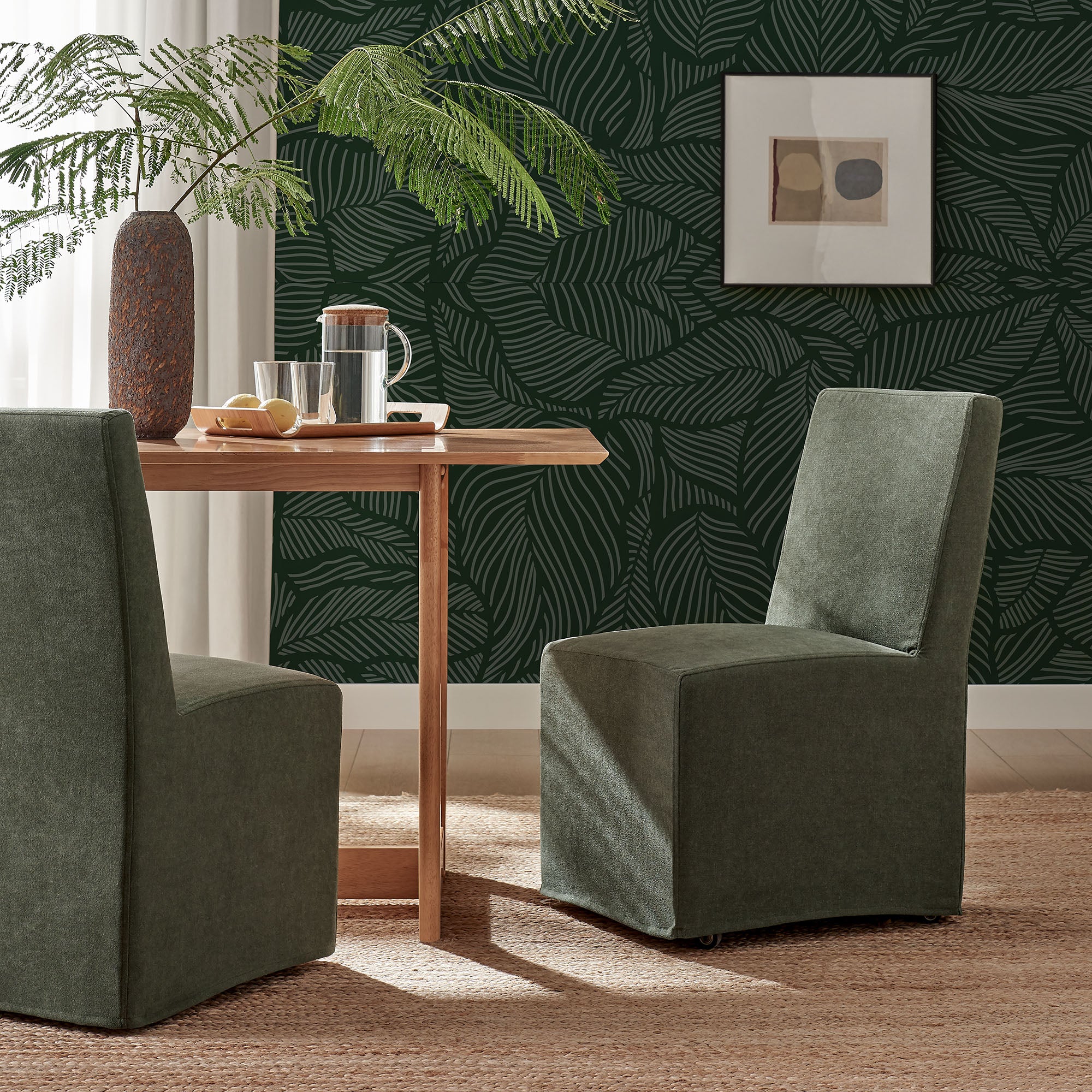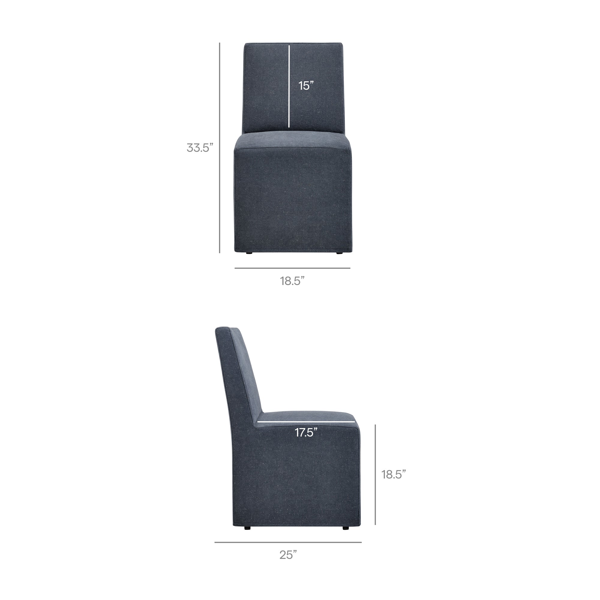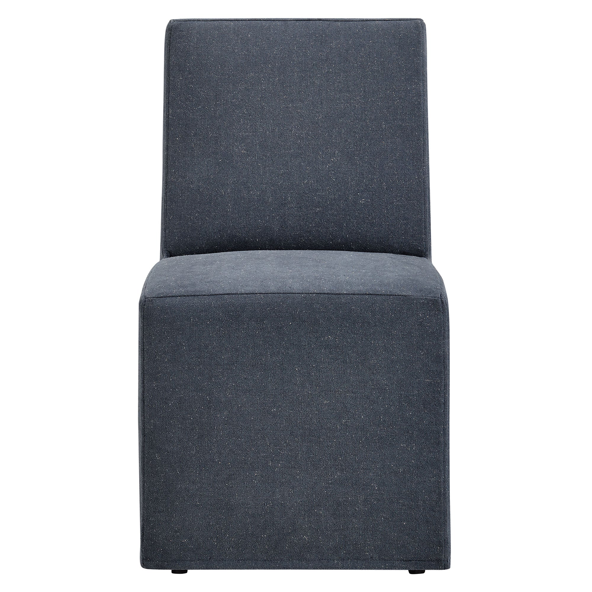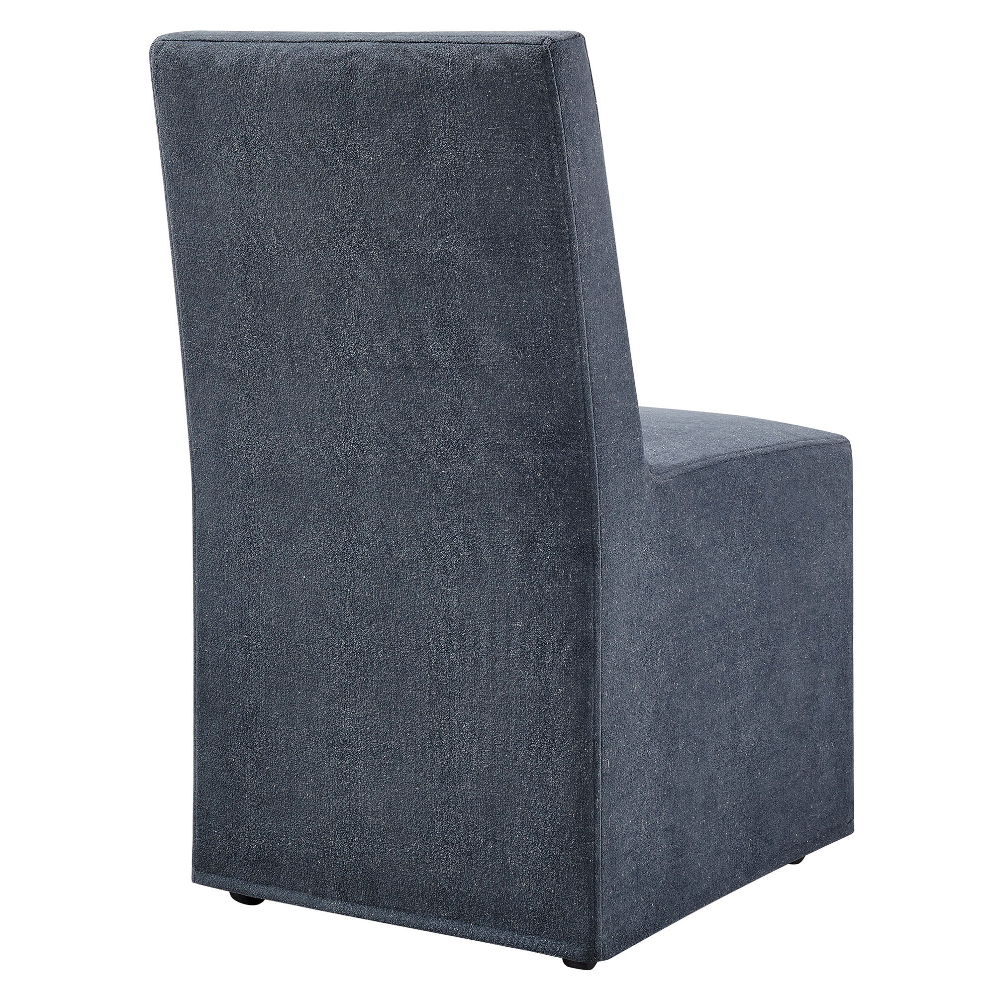 The Tessera Slipcovered Dining Side Chair adds an easy, relaxed feel to everyday dining. Upholstered in a linen-blend fabric, this upholstered dining chair features a tailored removable slipcover for a clean, put-together look. The padded seat and tall backrest provide supportive comfort, while the simple silhouette works well in a dining room, kitchen, or entryway. Set on a kiln-dried wood frame, this slipcovered chair is built for regular use. Hidden casters underneath offer smooth movement, making it easy to roll into place around the table. With its straightforward lines and soft fabric, this single fabric dining chair suits modern farmhouse, coastal, and minimalist spaces. Arrives Fully Assembled.