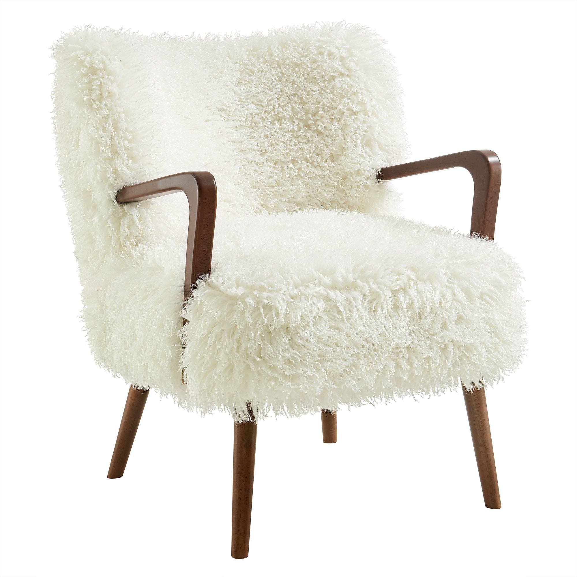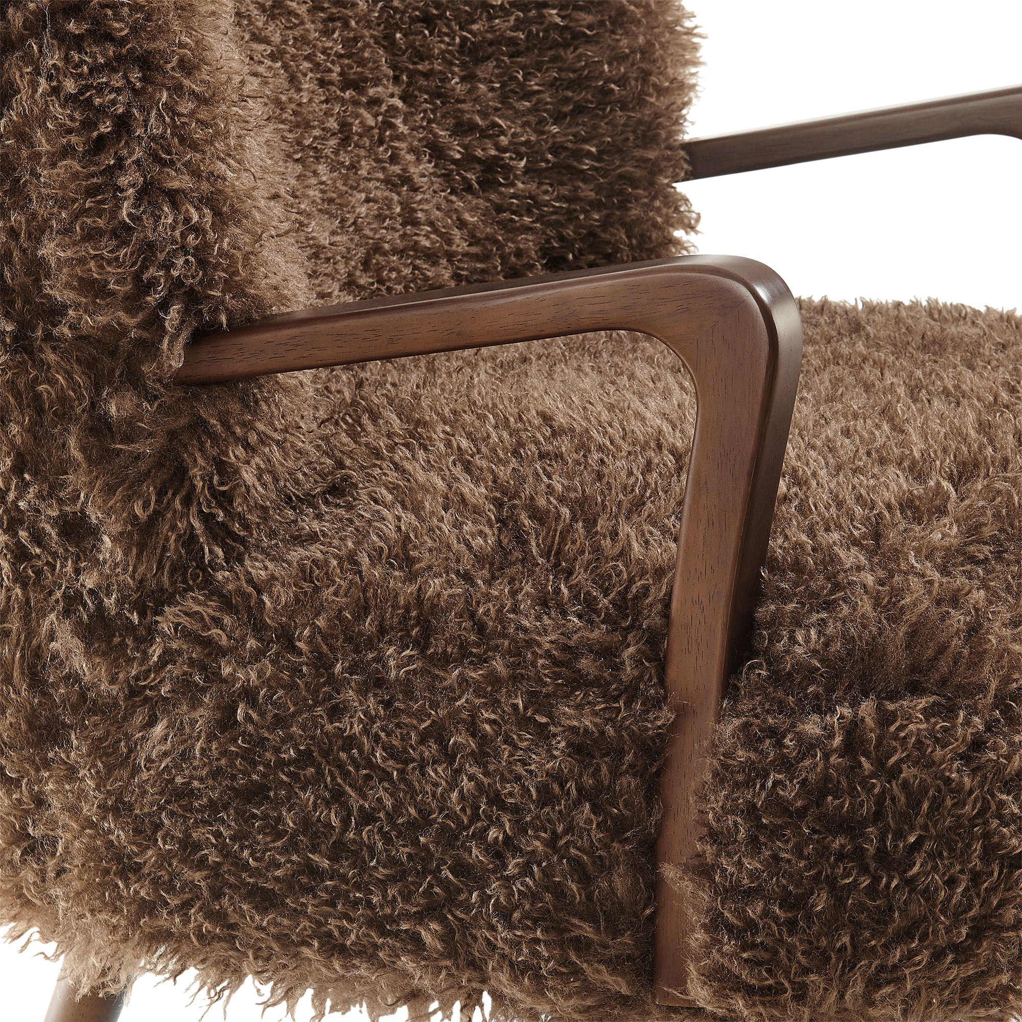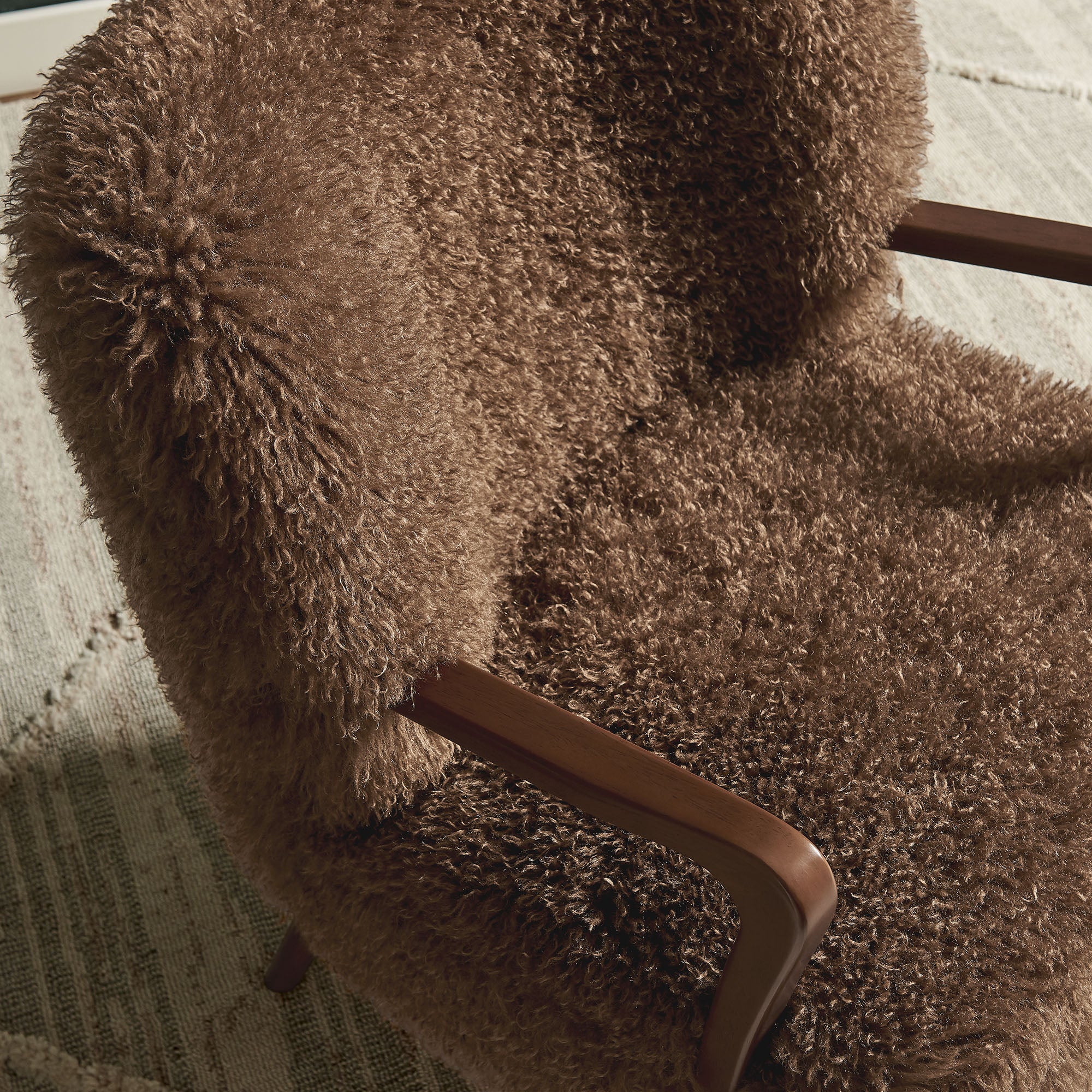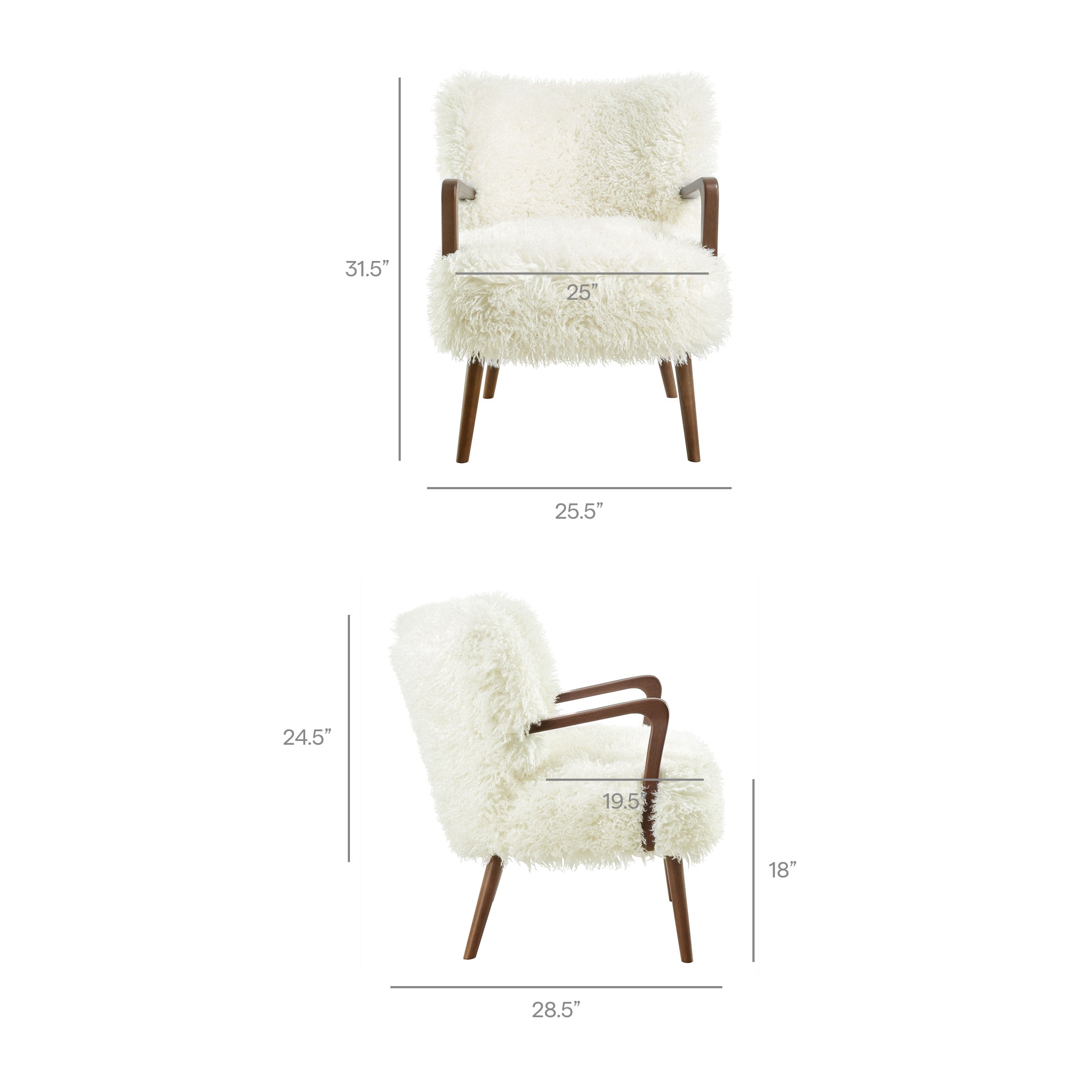 The Zerra Accent Chair brings a playful yet sophisticated statement to modern interiors. Upholstered in soft faux high pile shearling, this shaggy accent chair wraps you in cozy texture while making a bold visual impact. The curved back flows seamlessly into gently sloped sides, creating a sculptural silhouette that is both inviting and stylish. Finished with warm wood armrests and a splayed wood frame, this mid-century modern fuzzy lounge chair balances retro charm with everyday comfort. Perfect as a reading chair in the bedroom, a cozy lounge chair for the living room, or a stylish corner chair, Zerra blends comfort and design in equal measure. Non-marking floor glides protect your surfaces, while straightforward assembly is required. Weight Capacity: 300 lbs.