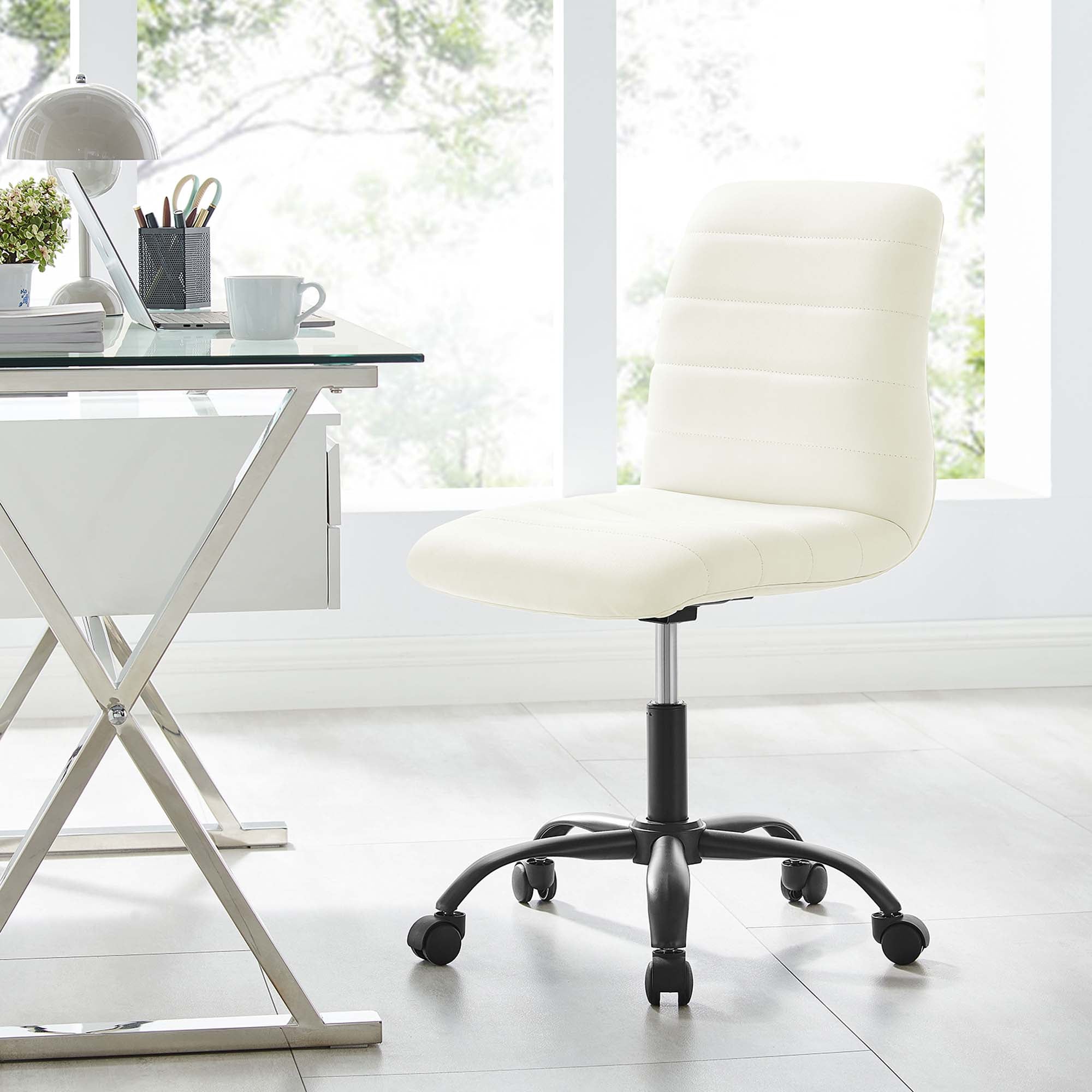 Focus on the task at hand while bringing modern style to your workspace with the Ripple Armless Office Chair. Outfitted with a matte black frame and five dual-wheel casters for easy mobility over hardwood or carpeted surfaces, this padded office chair is upholstered in durably vegan leather and covered in dense foam for added comfort. An ergonomic choice for conference rooms and workstations, this vegan leather office chair features a mid-back design, channel tufting, and fine stitching throughout. This office chair is fully height adjustable with a 360-degree swivel. Assembly required. Weight Capacity: 287 lbs.