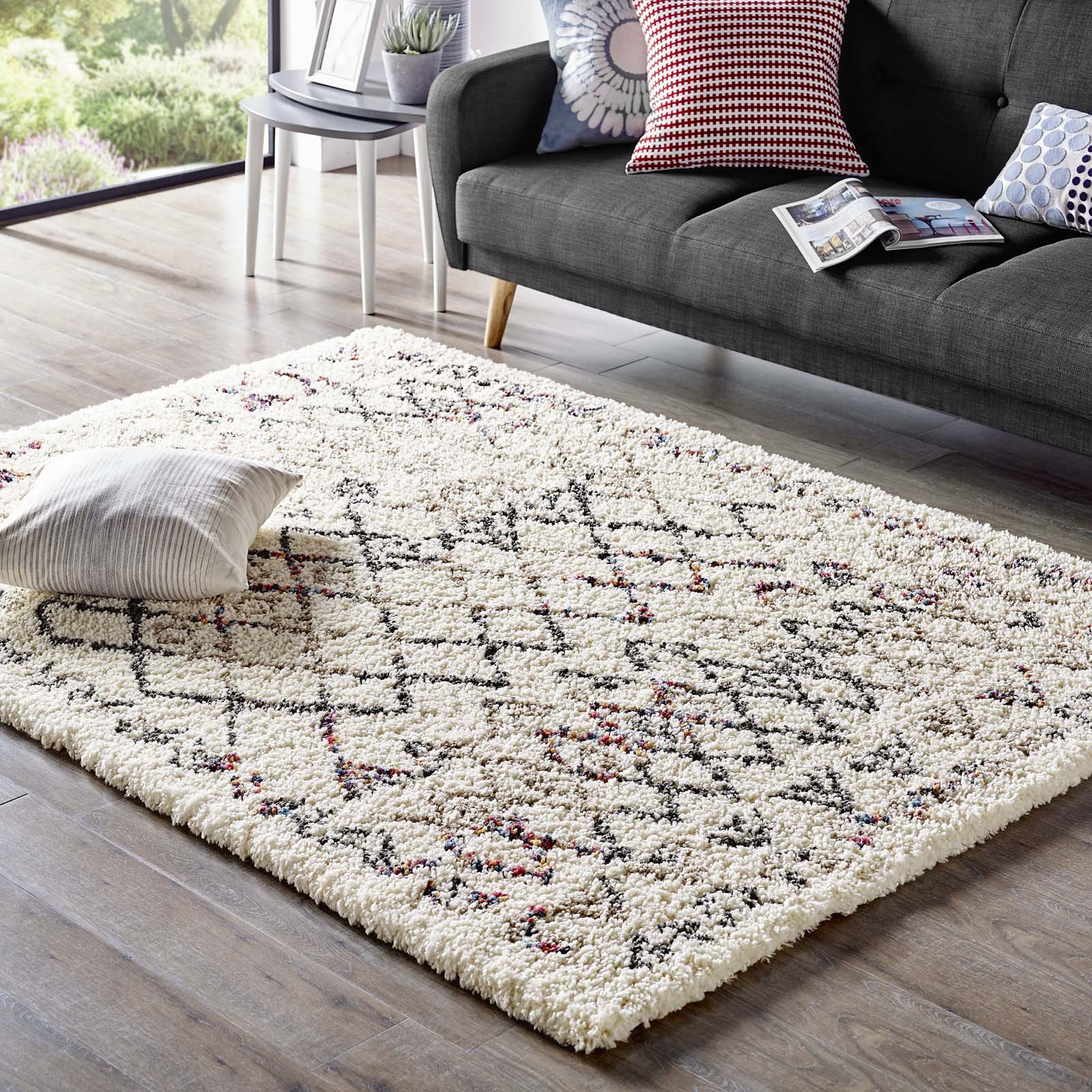 Make a sophisticated statement with the Skadi Rainbow Diamond Shag Area Rug. Patterned with an elegant geometric diamond design, Skadi is a durable machine-woven polypropylene and polyester rug that offers wide-ranging support. Complete with a grooved rubber bottom, Skadi enhances traditional and contemporary modern decors while outlasting everyday use. Featuring a stylish diamond design with a soft shag high pile weave of approximately two inches, this non-shedding, high density area rug is a perfect addition to the living room, bedroom, or family room. Vacuum regularly and spot clean with diluted soap or detergent as needed. Create a comfortable play area for kids and pets while protecting your floor from spills and heavy furniture with this carefree family-friendly area rug for your home.