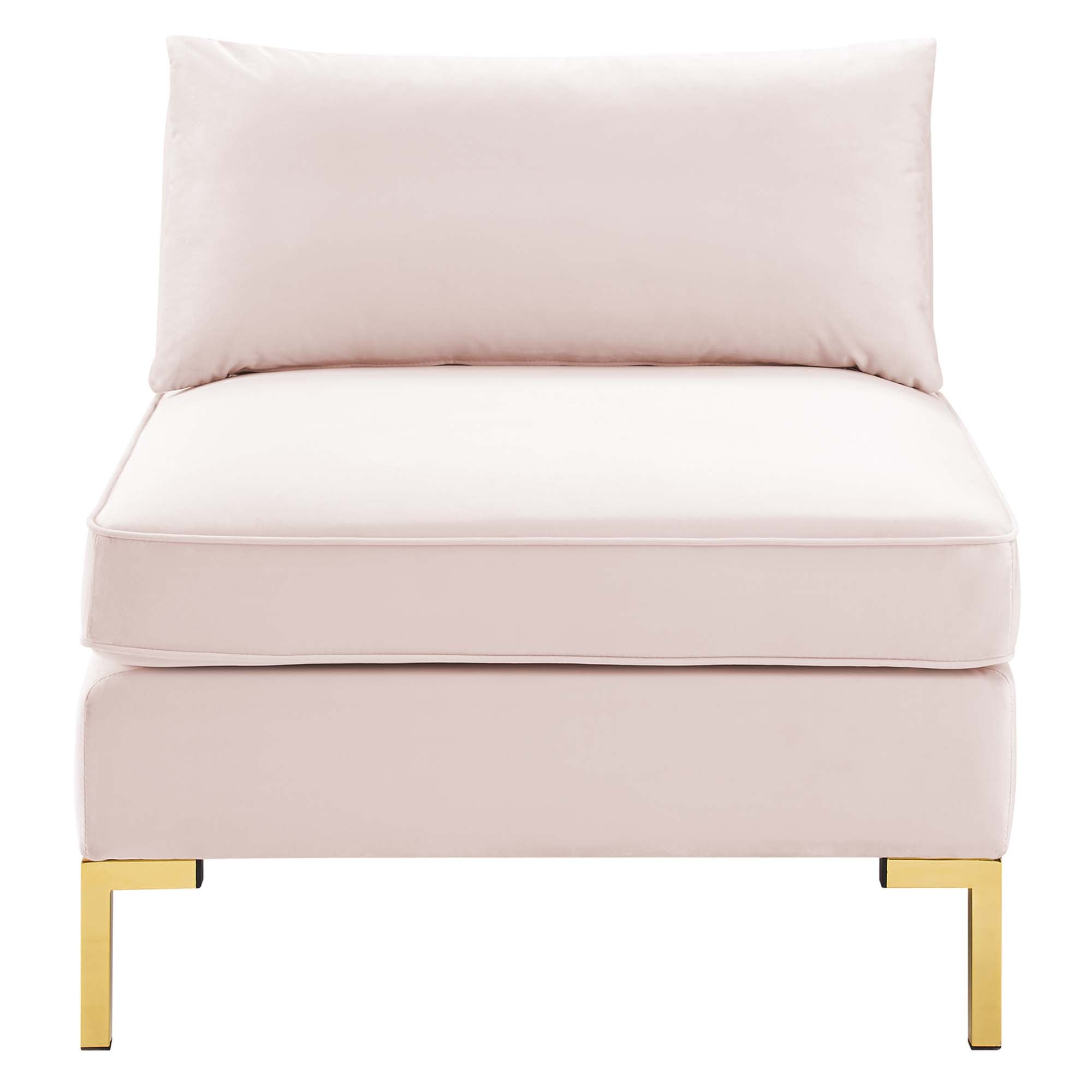 Introduce vintage modern and glam deco styles to your living space with the Ardent Performance Velvet Armless Chair. With luxe velvety texture and classic French piping, Ardent refreshes homes, apartments, and office spaces. This armless chair is part of a sectional sofa collection that allows for a variety of configurations to suit any living room, bedroom, office space, or lounge area while hidden connection buckles offer a secure fit. Covered in stain-resistant performance velvet, this upholstered chair features dense foam padding and a sinuous spring support system for a premium seating experience. The velvet chair sits on four gold metal legs with non-marking foot caps to protect your flooring. Armless Chair Weight Capacity: 440 lbs.