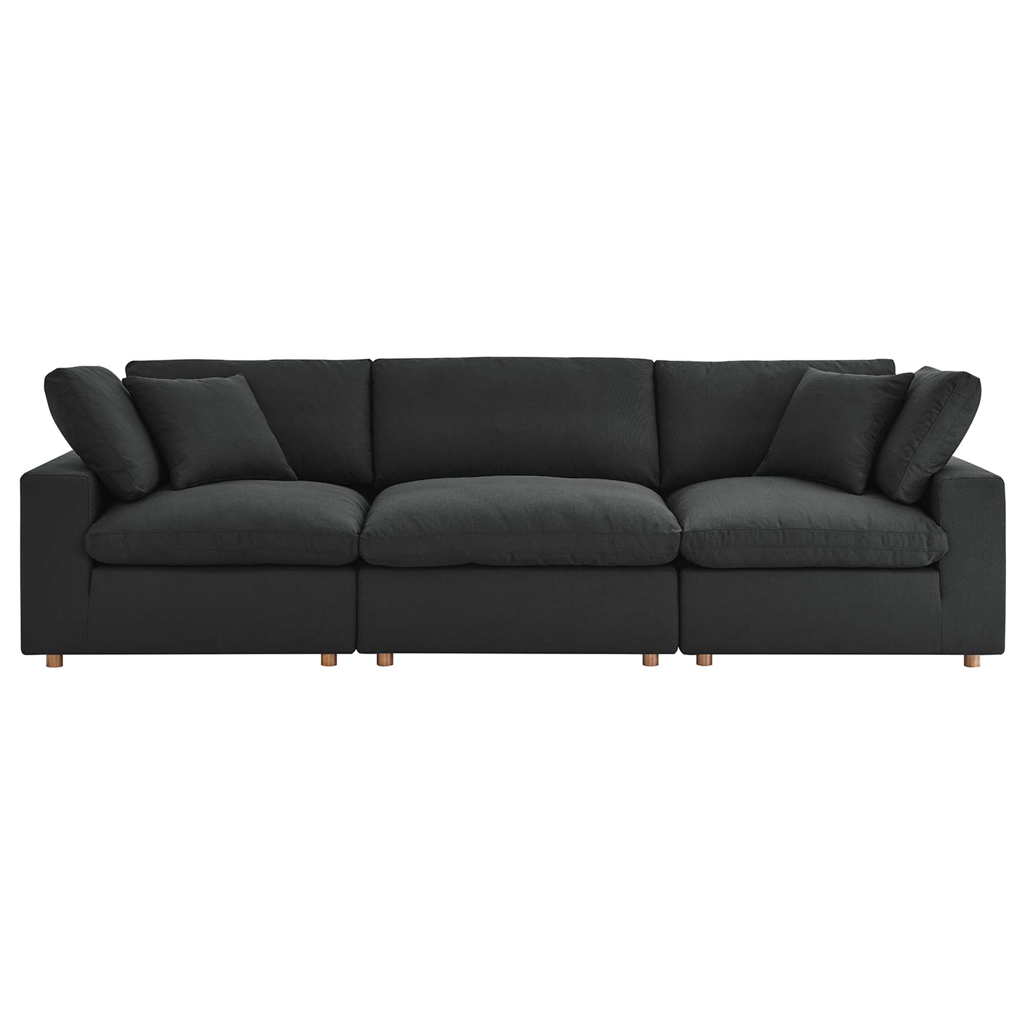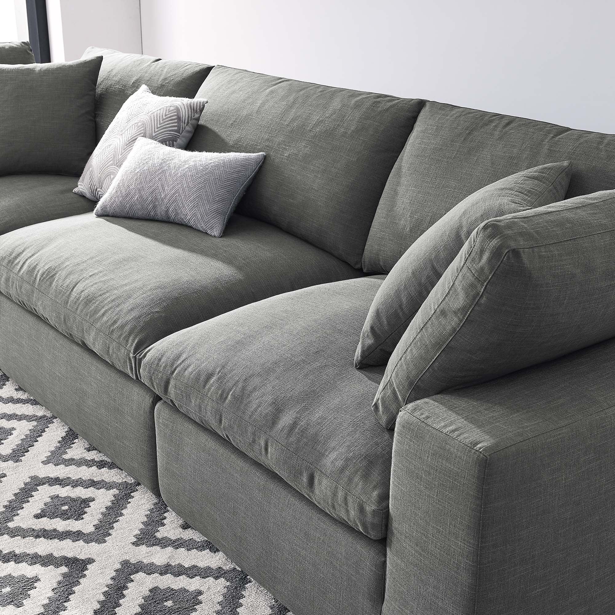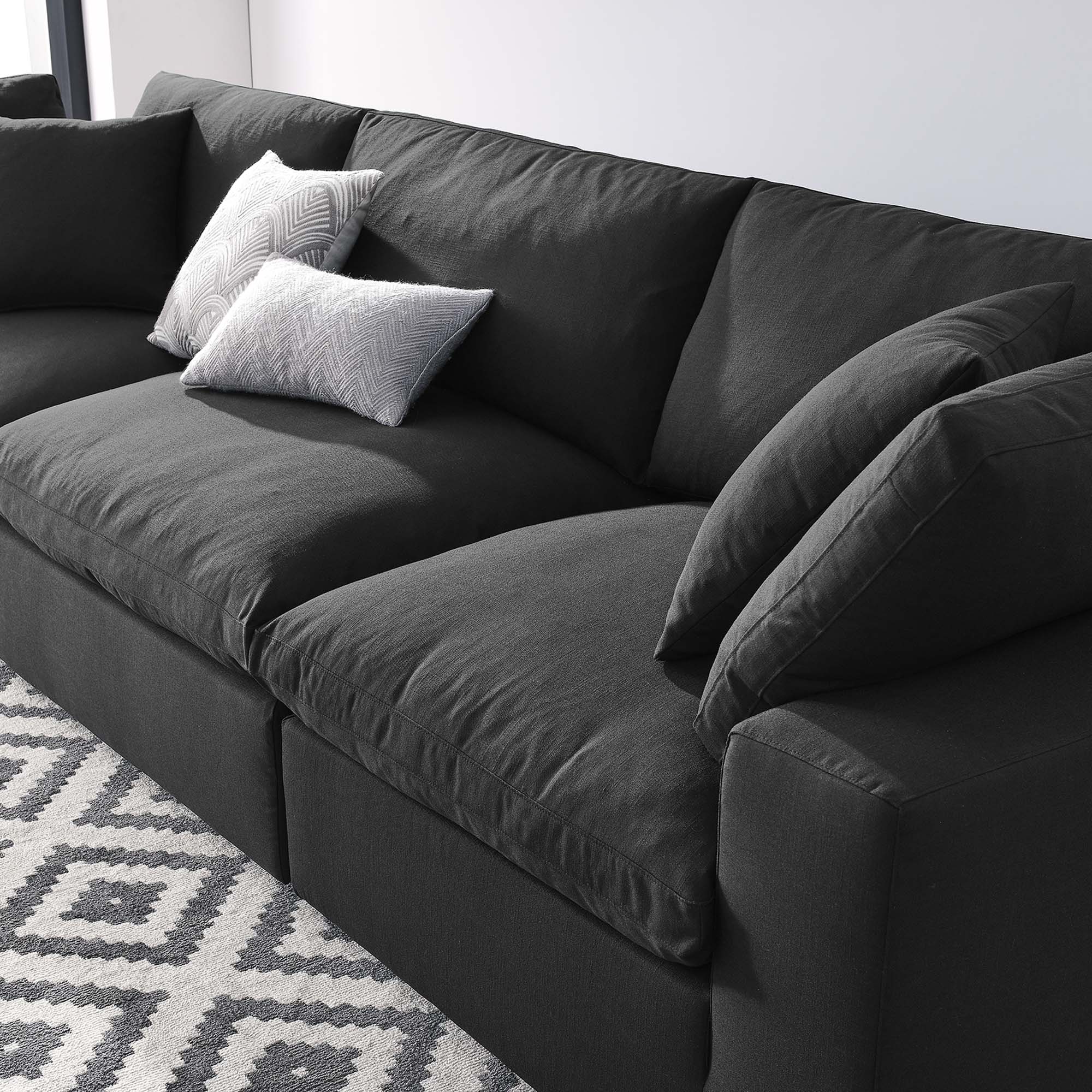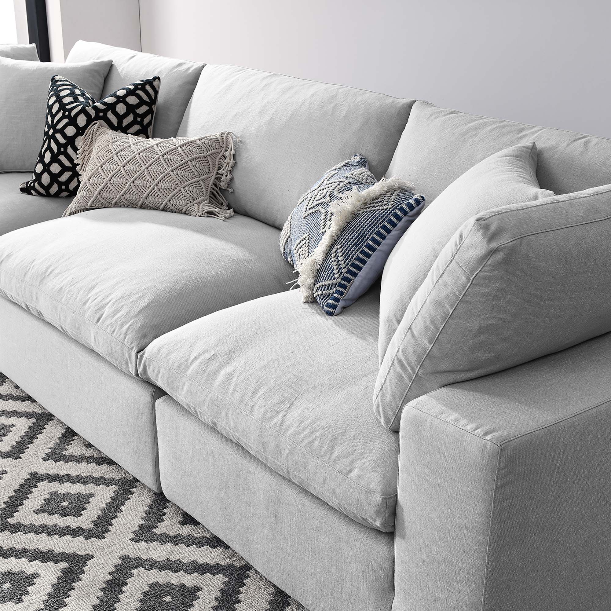 A haven for cozy relaxation, Commix features plush comfort, clean-lined design, and spacious profile, that makes an attractive statement in the modern home. Upholstered in polyester fabric that grants a luxe linen texture, this contemporary sofa comes with solid wood construction and cotton and down cushions for a luxurious sink-in feel. Commix comes with generously padded down feather and cotton cushions, and padded foam bases, making this sectional sofa collection perfect for the living room, family room, or game room. Made for sprawling out or curling up, Commix beckons you and guests to sit and stay a while. Includes plastic foot glides. Each Seat Weight Capacity: 331 lbs.