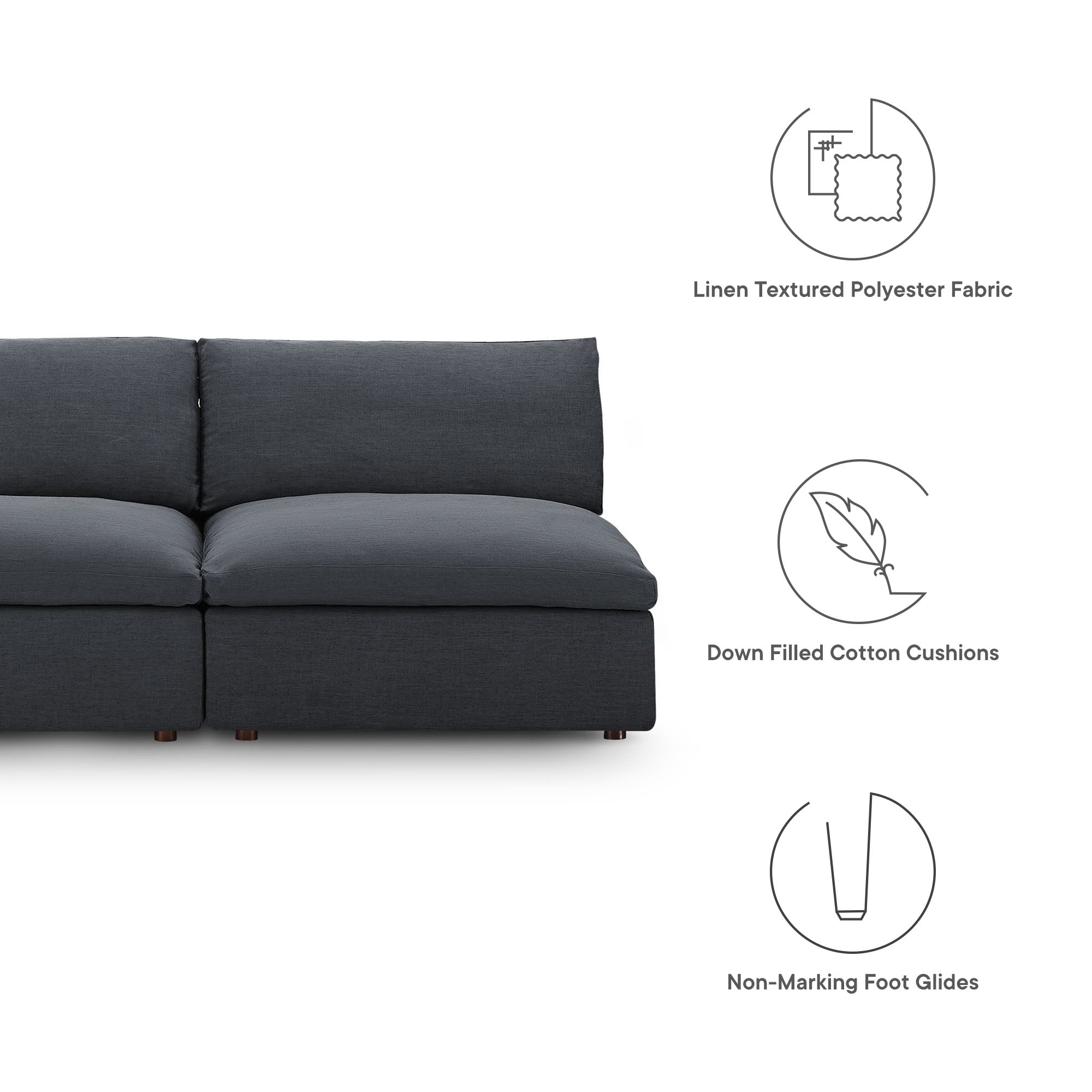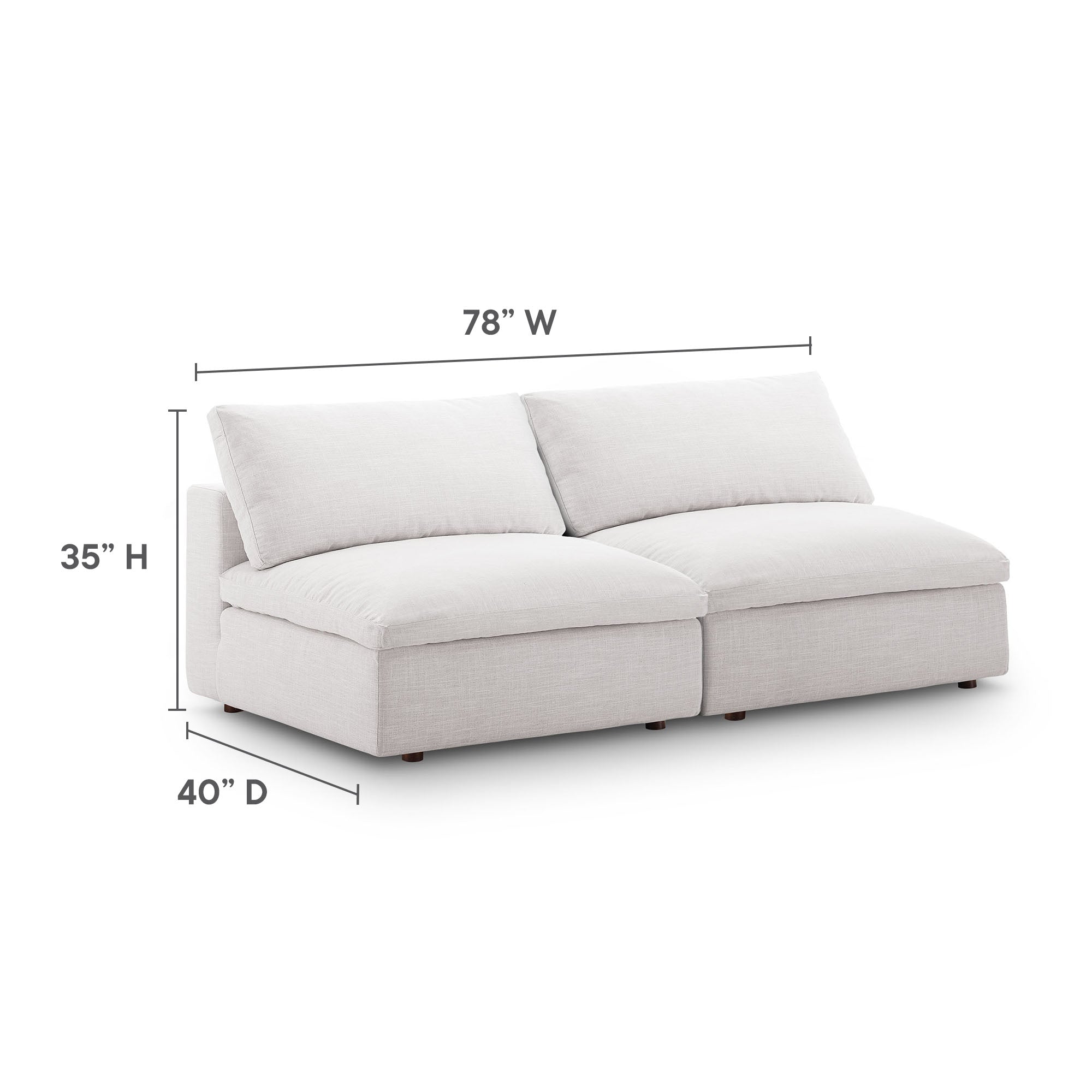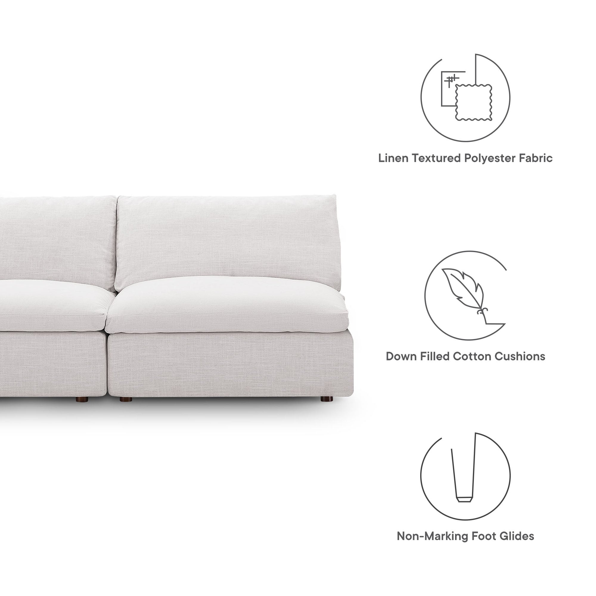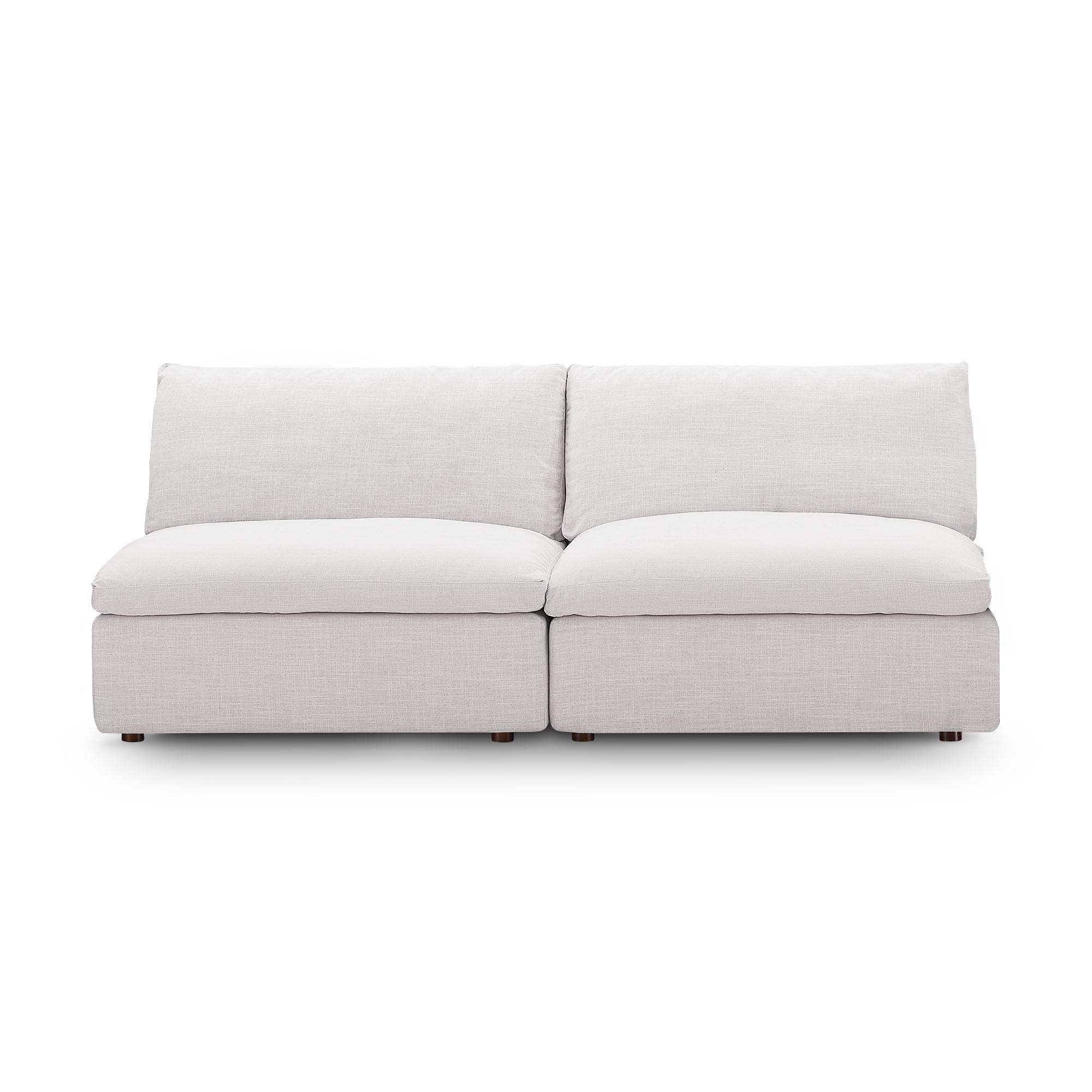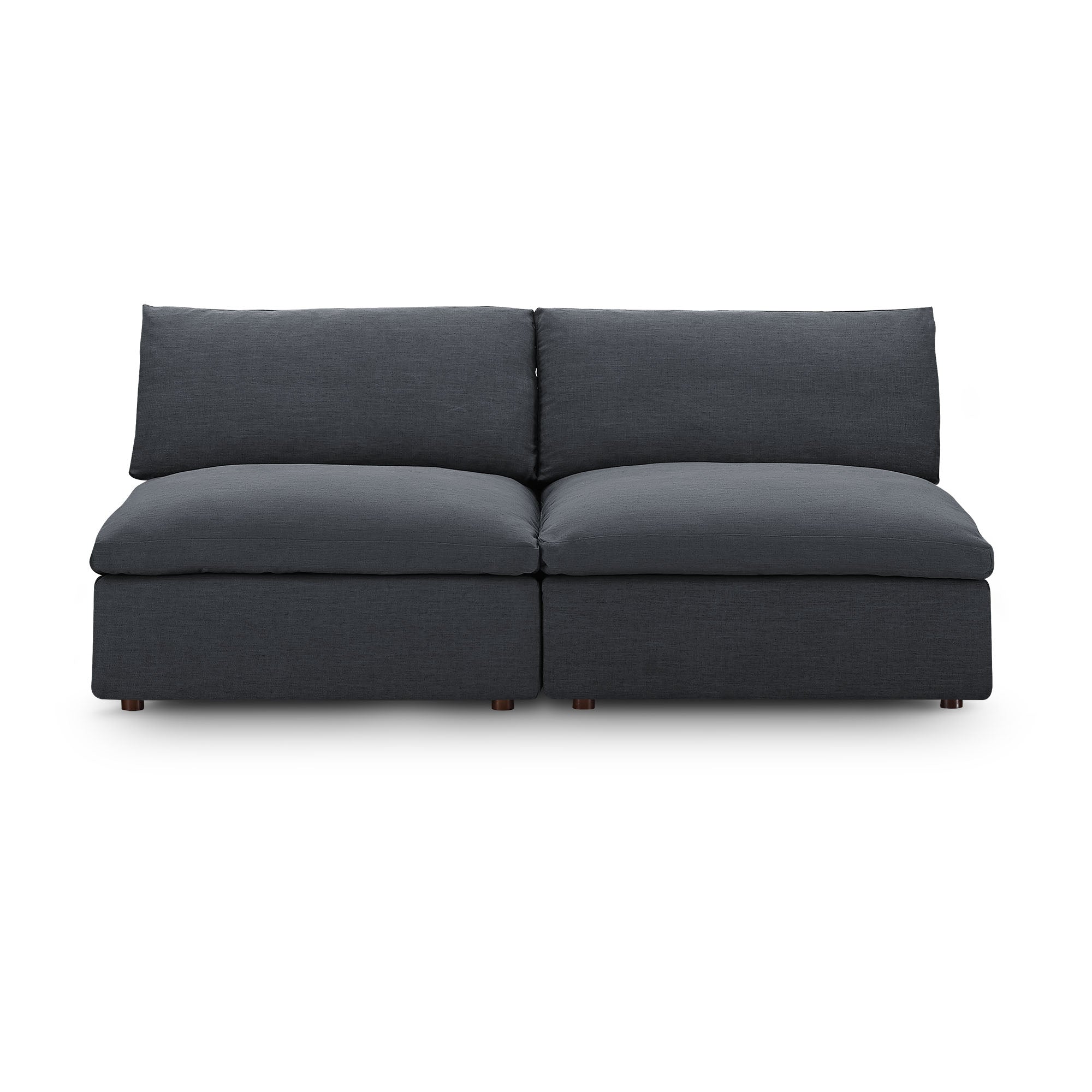 A haven for cozy relaxation, the Commix Armless Loveseat offers plush comfort and a clean-lined design. Made up of two armless chairs, its spacious profile makes an attractive statement in any modern home. Upholstered in polyester fabric for a linen-like texture, this contemporary modular sofa features generously padded down feather and cotton cushions, providing a luxurious sink-in feel. Built on a solid wood frame, the Commix deep sectional sofa is perfect for living rooms, family rooms, or game rooms. Made for sprawling out or curling up, this 2 seater couch beckons you and guests to sit and stay a while. Includes plastic foot glides and two armless chairs, each supporting up to 331 lbs.