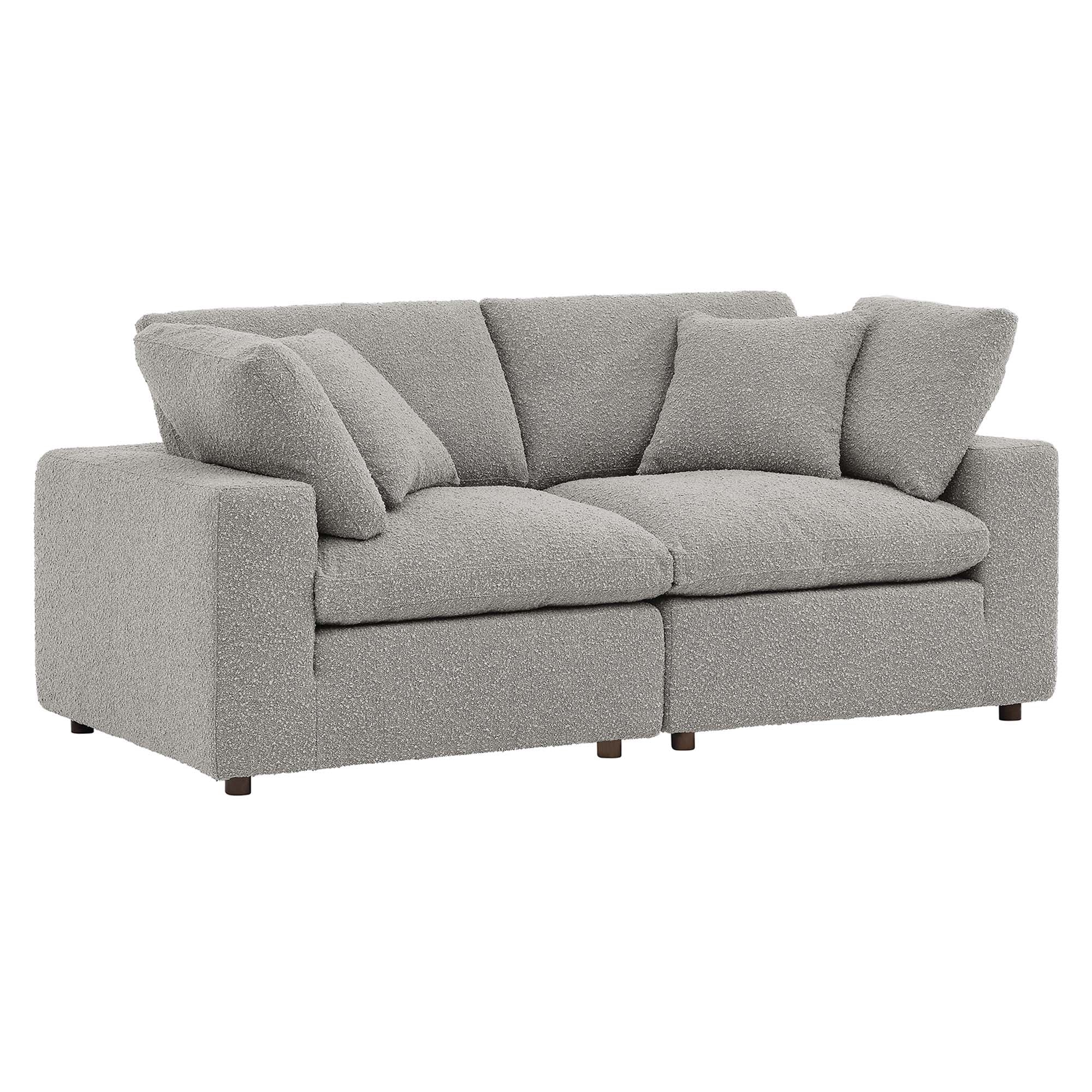 A haven for cozy relaxation, Commix features plush comfort and a clean-lined design. The spacious profile makes an attractive statement in the modern home. Covered in a boucle fabric with a charming nubby texture, this upholstered loveseat comes with a solid wood construction and foam padded and duck down cushions for a luxurious sink-in feel. Commix features overstuffed down feather cushions that offer a feeling of relaxation and calming comfort while lounging, making it the perfect addition to the living room, family room, or game room. Made for sprawling out or curling up, Commix beckons you and guests to sit and stay a while. Includes plastic foot glides. Weight Capacity of Each Piece: 331 lbs.