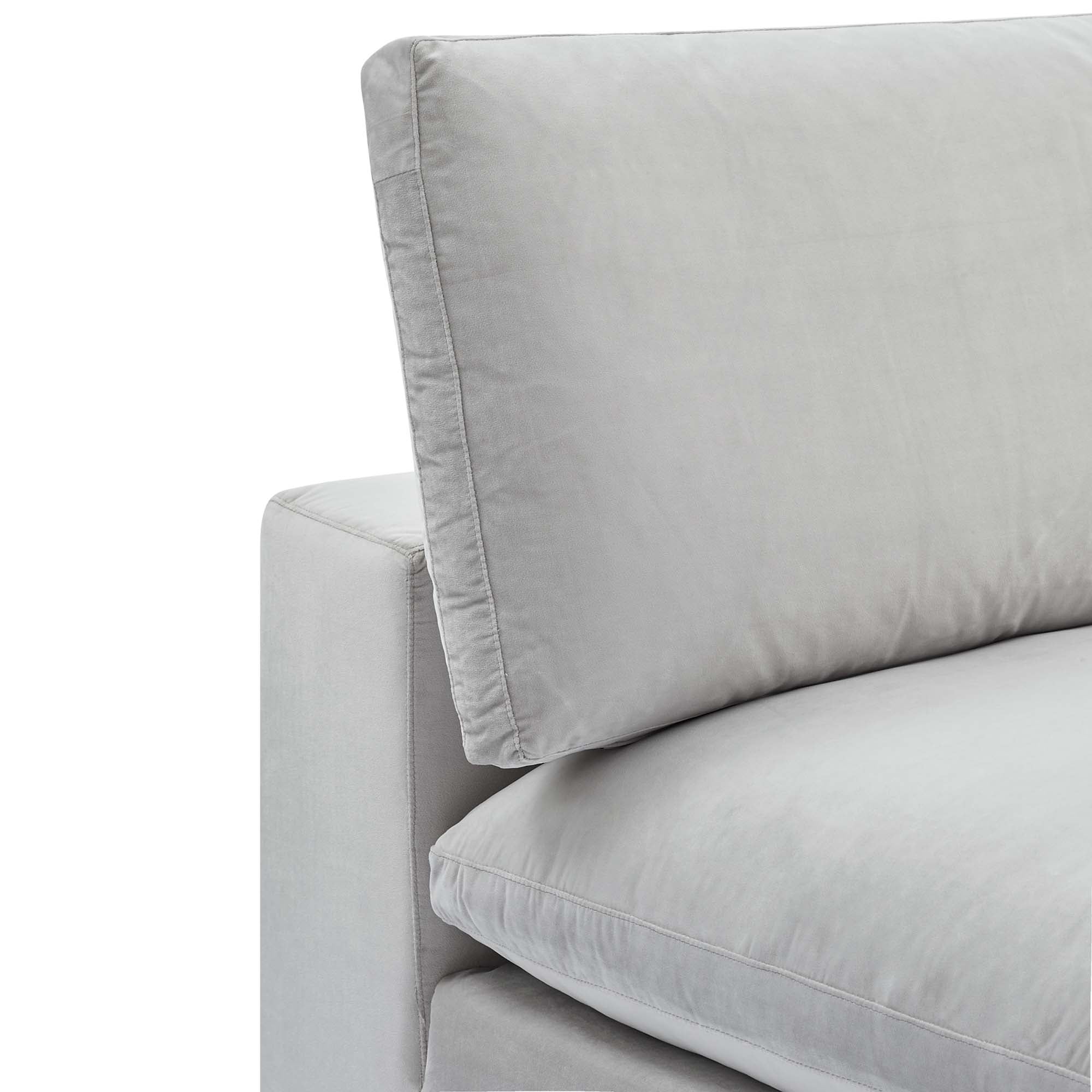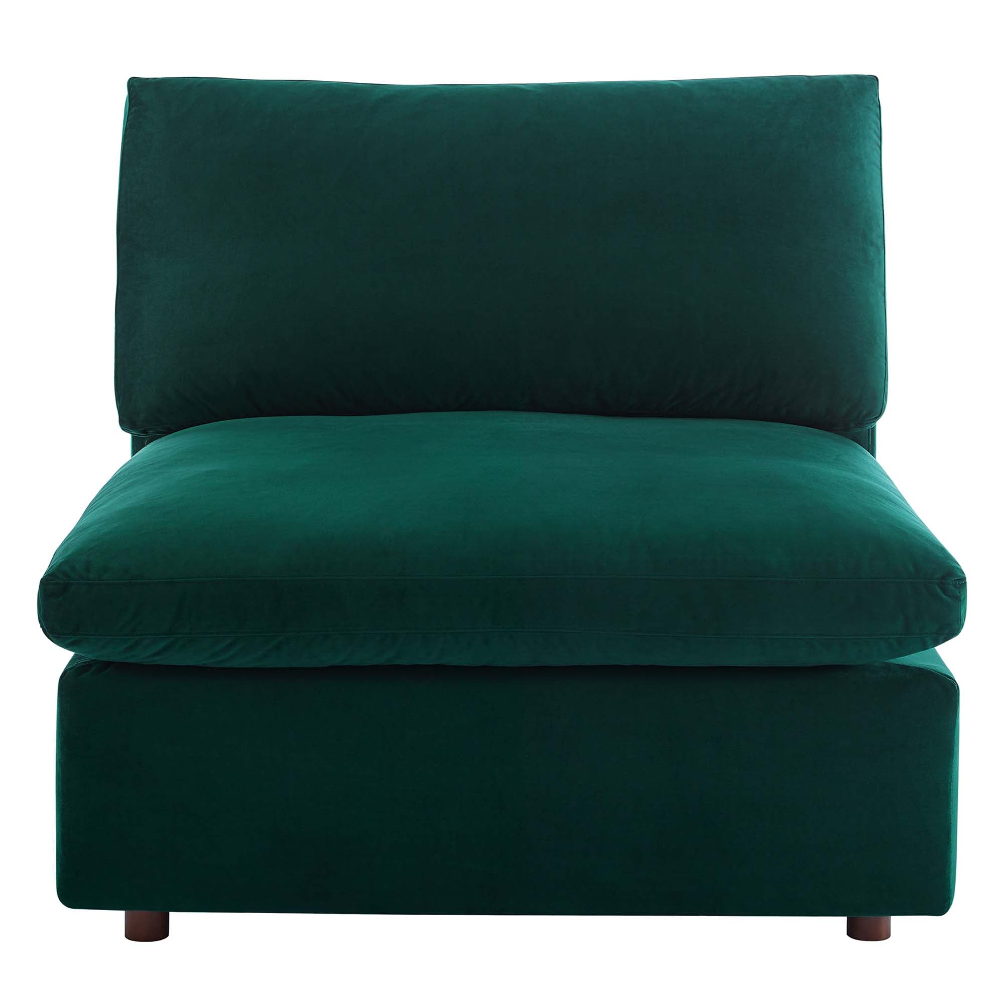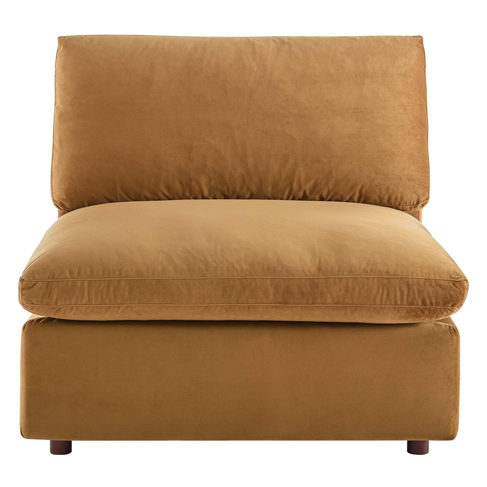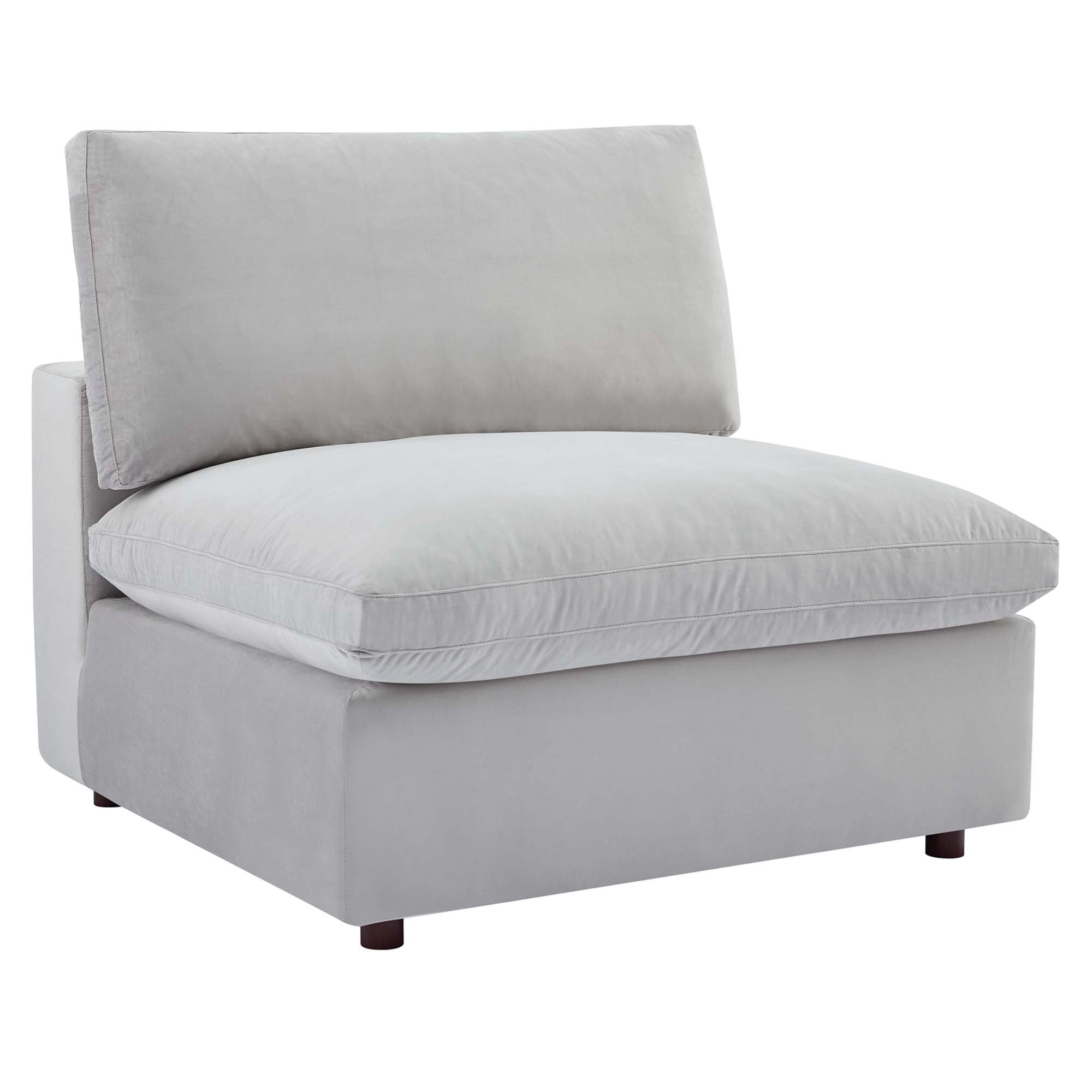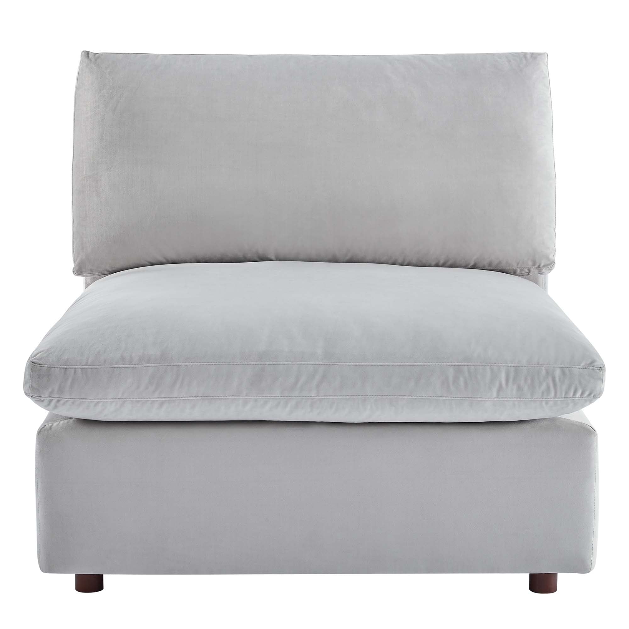 A haven for cozy relaxation, Commix features plush comfort, clean-lined design, and spacious profile, that makes an attractive statement in the modern home. Covered in stain-resistant performance velvet, this upholstered armless chair comes with a solid wood construction and foam padded and duck down cushions for a luxurious sink-in feel. Commix features overstuffed down feather cushions that offer a feeling of relaxation and calming comfort while lounging, making it the perfect addition to the living room, family room, or game room. Made for sprawling out or curling up, Commix beckons you and guests to sit and stay a while. Includes plastic foot glides. Armless Chair Weight Capacity: 331 lbs.