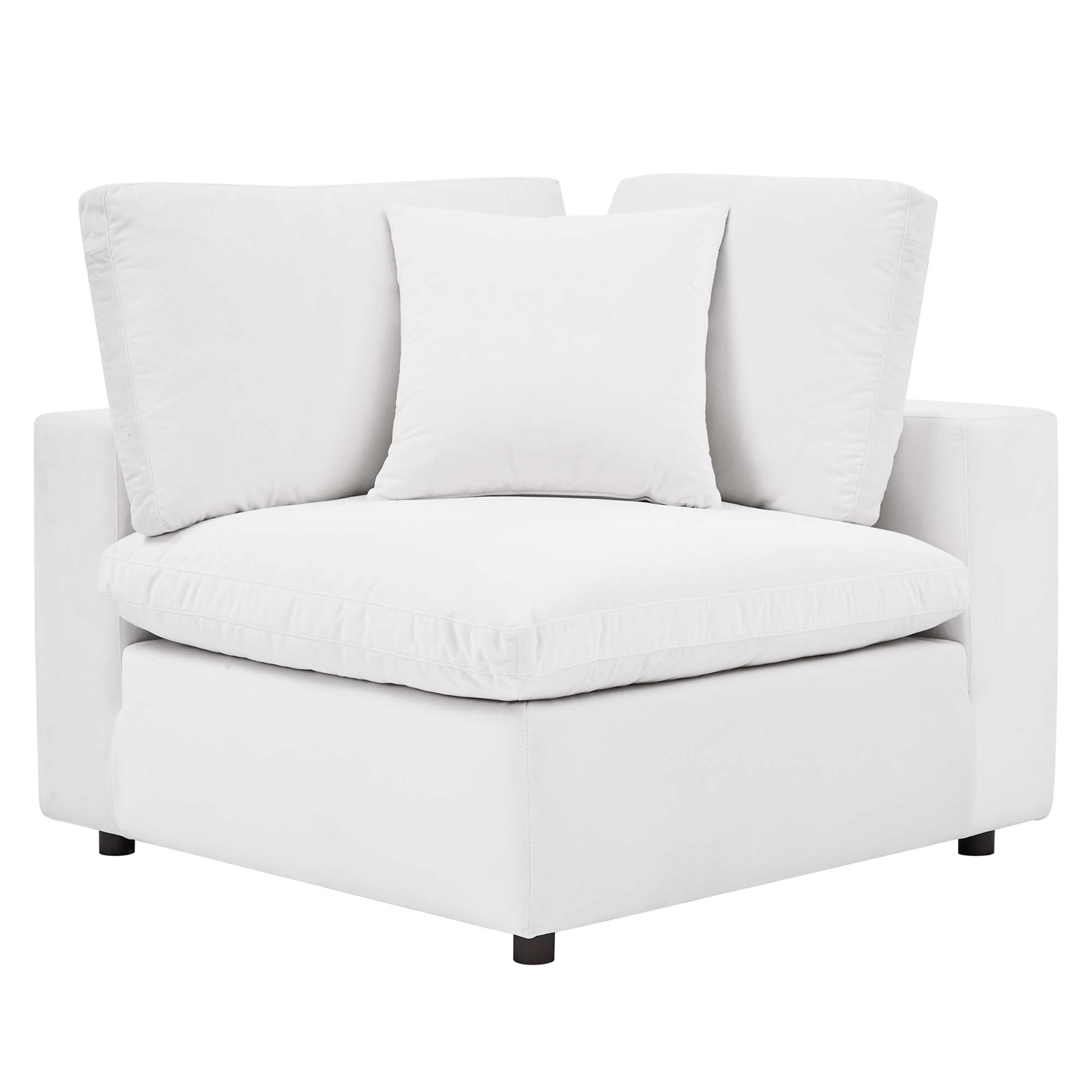 A haven for cozy relaxation, Commix features plush comfort, clean-lined design, and spacious profile, that makes an attractive statement in the modern home. Covered in stain-resistant performance velvet, this upholstered corner chair comes with a solid wood construction and foam padded and duck down cushions for a luxurious sink-in feel. Commix features overstuffed down feather cushions that offer a feeling of relaxation and calming comfort while lounging, making it the perfect addition to the living room, family room, or game room. Made for sprawling out or curling up, Commix beckons you and guests to sit and stay a while. Includes plastic foot glides. Corner Chair Weight Capacity: 331 lbs.