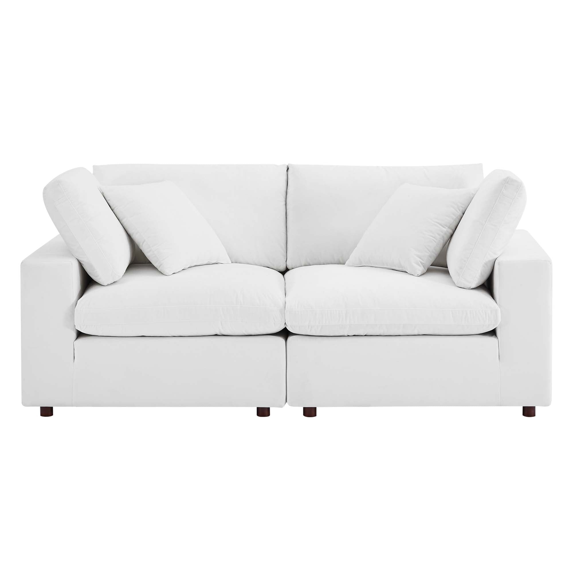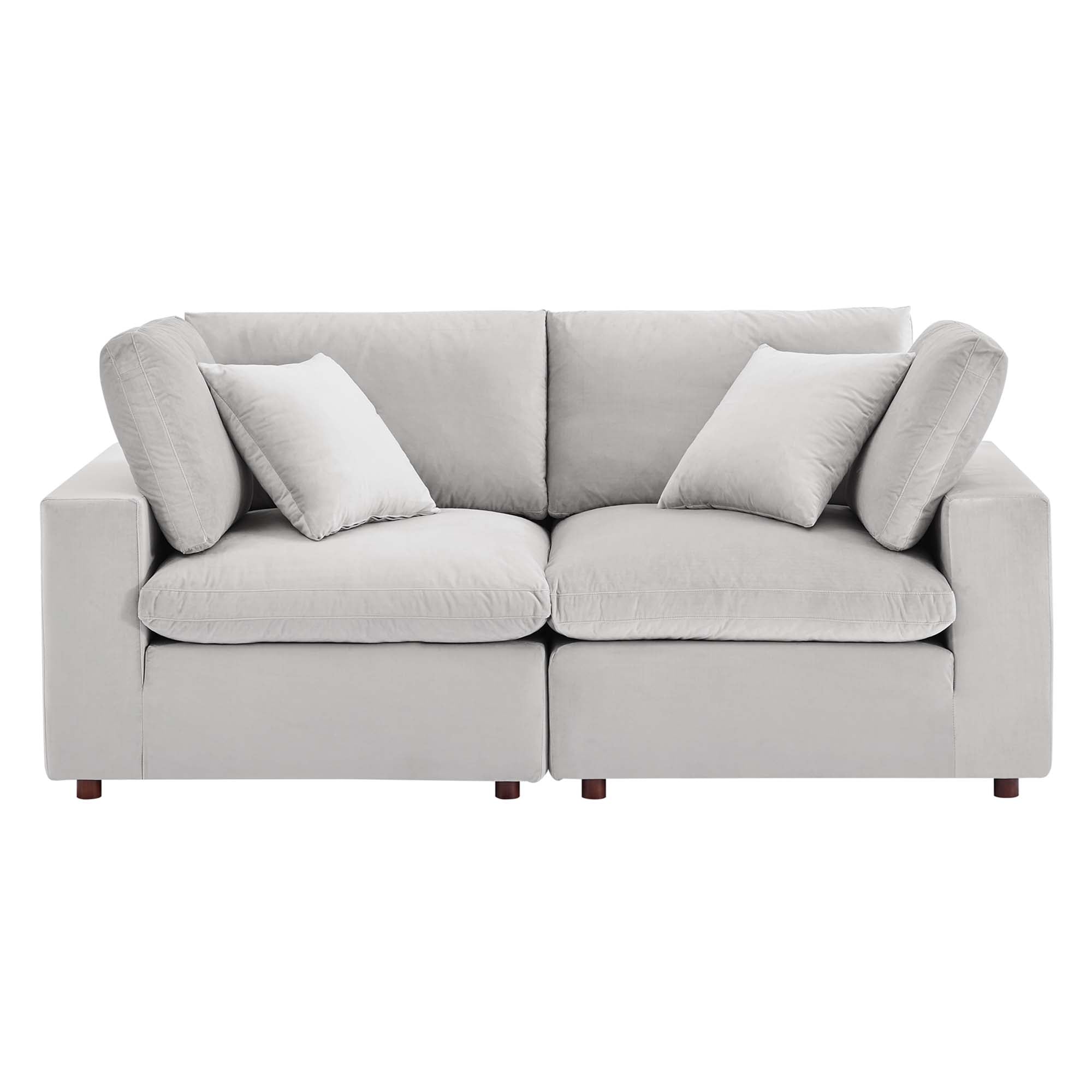 A haven for cozy relaxation, Commix features plush comfort, clean-lined design, and spacious profile, that makes an attractive statement in the modern home. Covered in stain-resistant performance velvet, this upholstered loveseat comes with a solid wood construction and foam padded and duck down cushions for a luxurious sink-in feel. Commix features overstuffed down feather cushions that offer a feeling of relaxation and calming comfort while lounging, making it the perfect addition to the living room, family room, or game room. Made for sprawling out or curling up, Commix beckons you and guests to sit and stay a while. Includes plastic foot glides. Weight Capacity of Each Piece: 331 lbs.