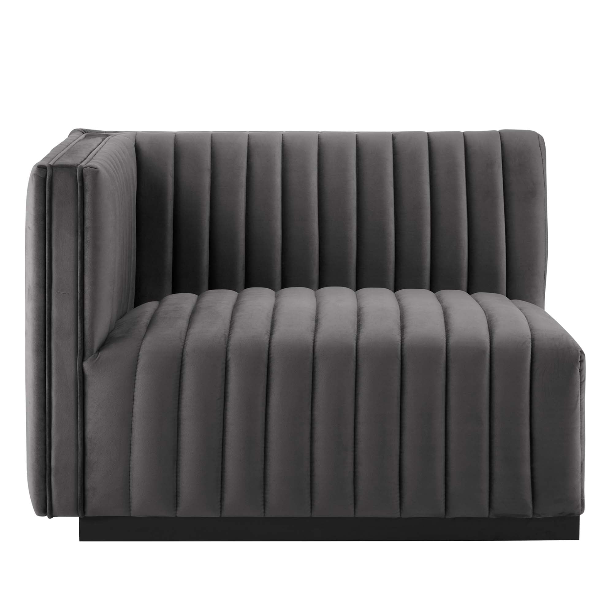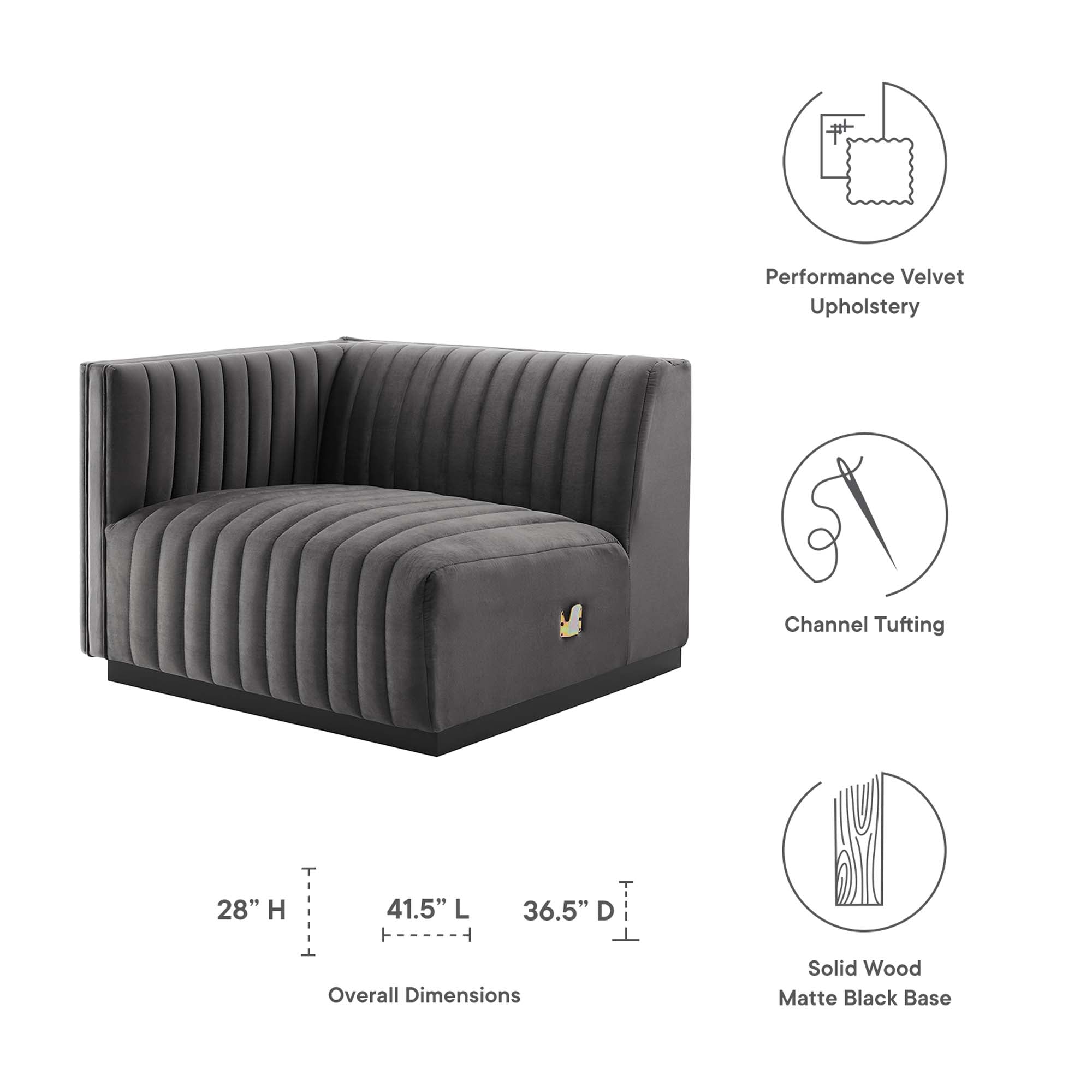 Modern appeal surrounds the Conjure Channel Tufted Performance Velvet Upholstered Left-Arm Chair. Luxuriously soft, stain-resistant performance velvet upholstery covers dense foam padding and an individually wrapped spring coil system for a supportive living room chair that will become the go-to lounge spot for family and friends. Vertical channel tufting and subtle French piping adds depth to this vintage inspired sectional piece that effortlessly becomes the focal point in your living room. Solidly constructed from wood and plywood, this armchair features non-marking foot caps and boasts a matte black base. Versatile and elegant, this sectional sofa piece is ideally suited for a variety of decor styles in your living room, lounge, or home office. Chair Weight Capacity: 331 lbs.