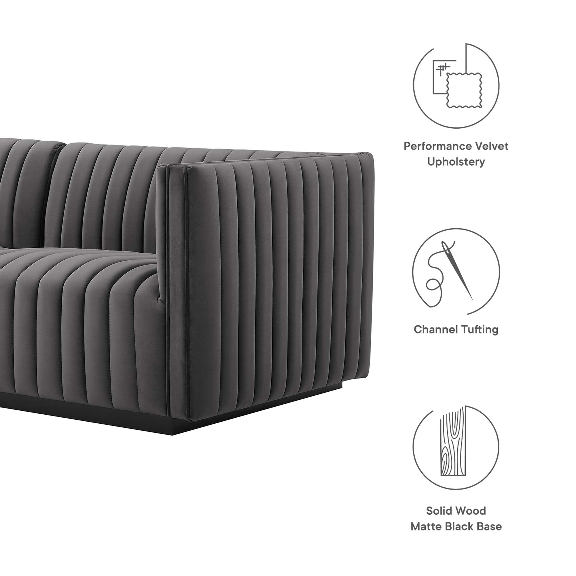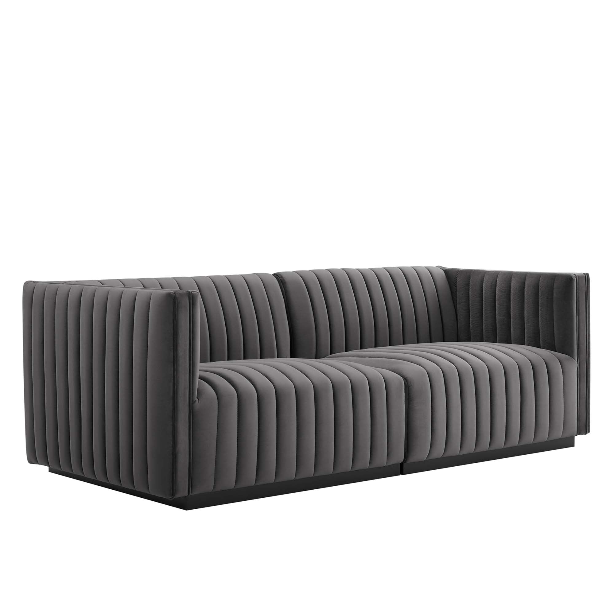 Modern appeal surrounds the Conjure Channel Tufted Performance Velvet Upholstered Loveseat. Luxuriously soft, stain-resistant performance velvet upholstery covers dense foam padding and an individually wrapped spring coil system for a supportive living room loveseat that will become the go-to lounge spot for family and friends. Vertical channel tufting and subtle French piping adds depth to this vintage inspired two-seater sofa that effortlessly becomes the focal point in your living room. Solidly constructed from wood and plywood, this loveseat features non-marking foot caps and boasts a matte black base. Versatile and elegant, this sectional loveseat is ideally suited for a variety of decor styles in your living room, lounge, or home office. Each Seat Weight Capacity: 331 lbs.