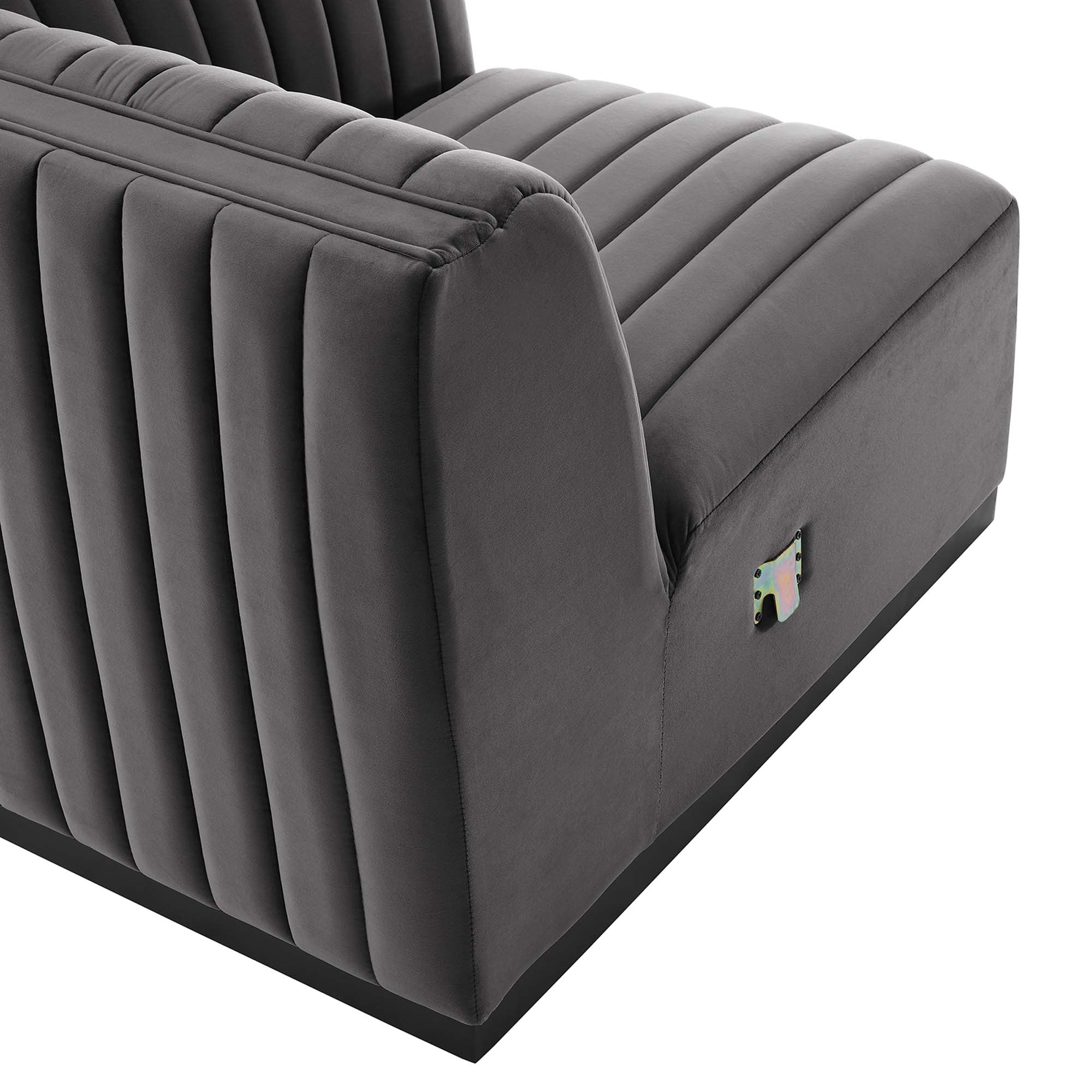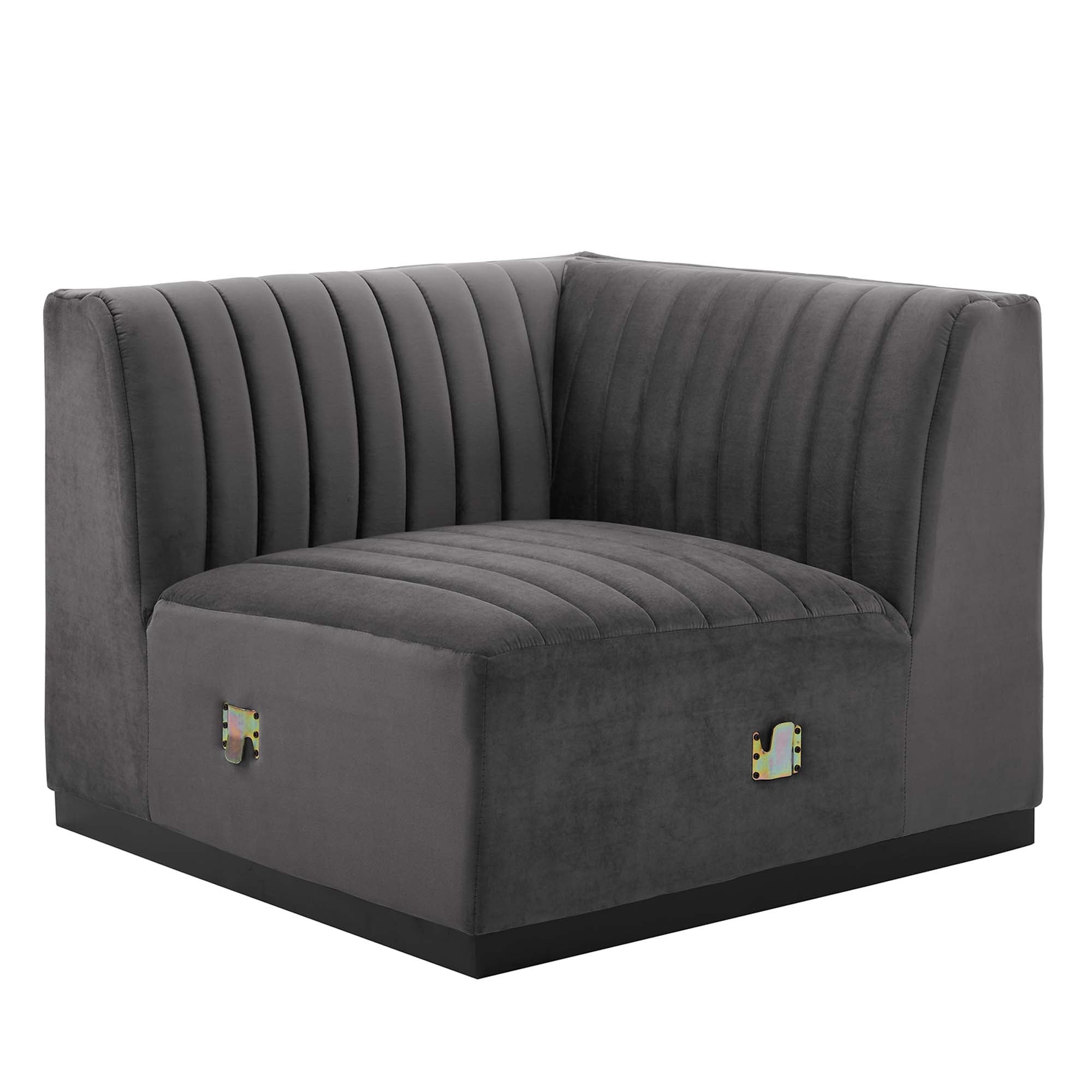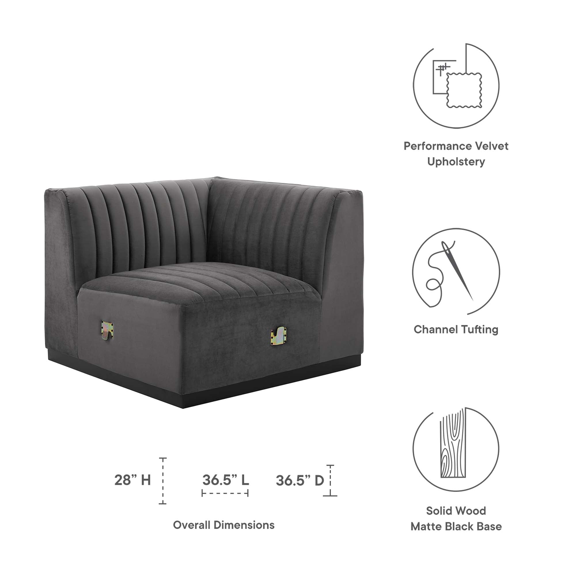 Modern appeal surrounds the Conjure Channel Tufted Performance Velvet Upholstered Right Corner Chair. Luxuriously soft, stain-resistant performance velvet upholstery covers dense foam padding and an individually wrapped spring coil system for a supportive living room chair that will become the go-to lounge spot for family and friends. Vertical channel tufting and subtle French piping adds depth to this vintage inspired sectional piece that effortlessly becomes the focal point in your living room. Solidly constructed from wood and plywood, this corner chair features non-marking foot caps and boasts a matte black base. Versatile and elegant, this sectional sofa piece is ideally suited for a variety of decor styles in your living room, lounge, or home office. Chair Weight Capacity: 331 lbs.
