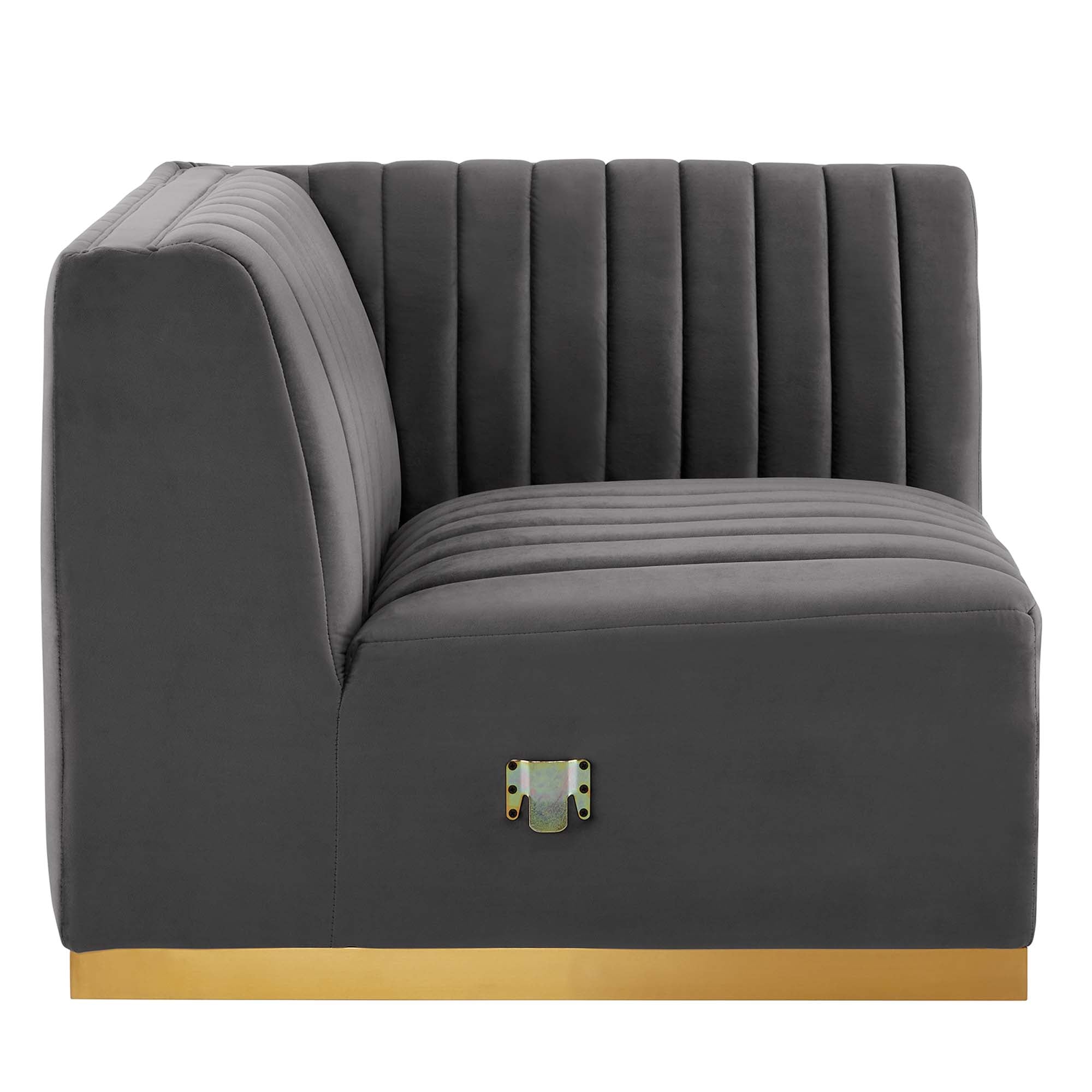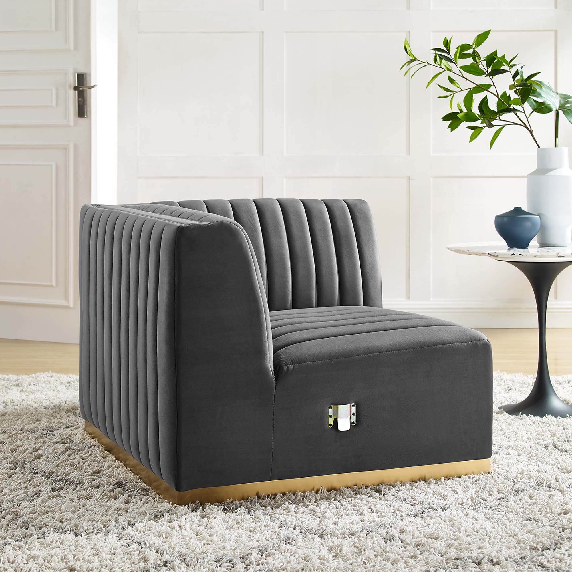 Modern appeal surrounds the Conjure Channel Tufted Performance Velvet Upholstered Right Corner Chair. Luxuriously soft, stain-resistant performance velvet upholstery covers dense foam padding and an individually wrapped spring coil system for a supportive living room chair that will become the go-to lounge spot for family and friends. Vertical channel tufting and subtle French piping adds depth to this vintage inspired sectional piece that effortlessly becomes the focal point in your living room. Solidly constructed from wood and plywood, this corner chair features non-marking foot caps and boasts a brushed gold stainless steel base. Versatile and elegant, this sectional sofa piece is ideally suited for a variety of decor styles in your living room, lounge, or home office. Chair Weight Capacity: 331 lbs.