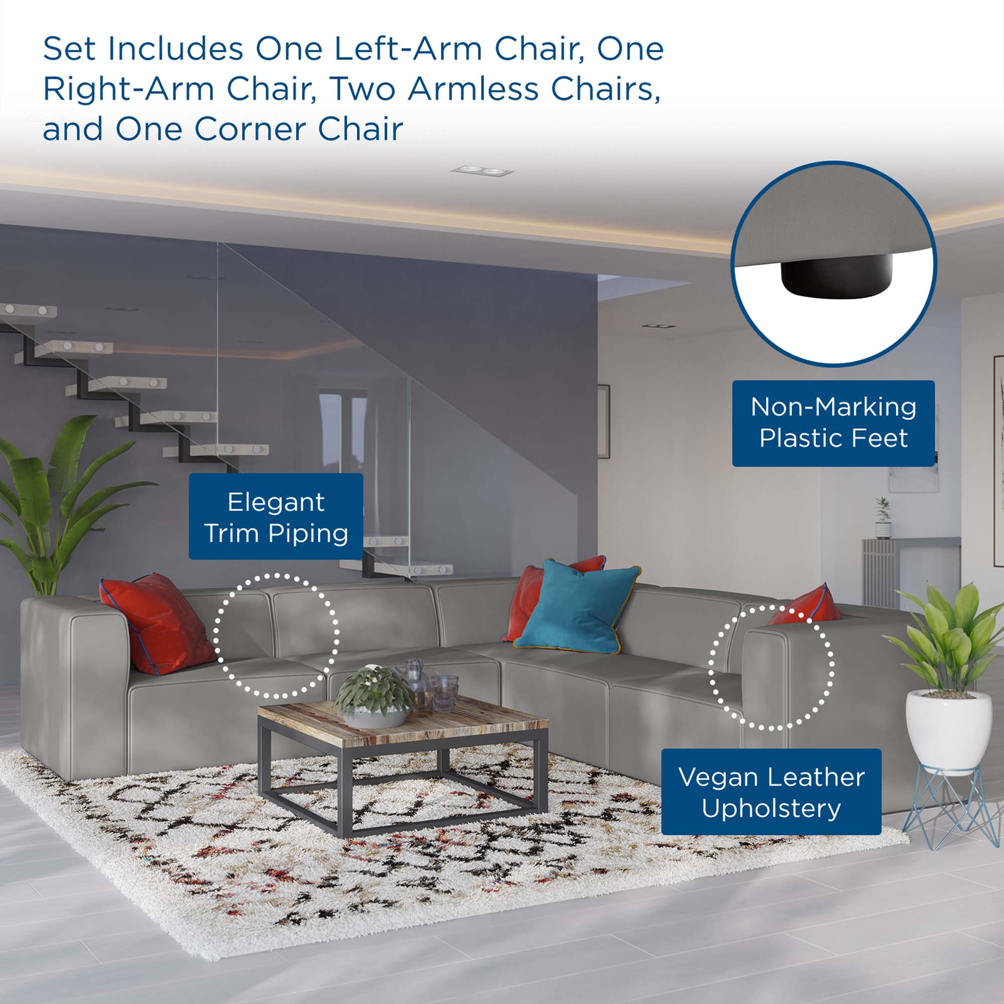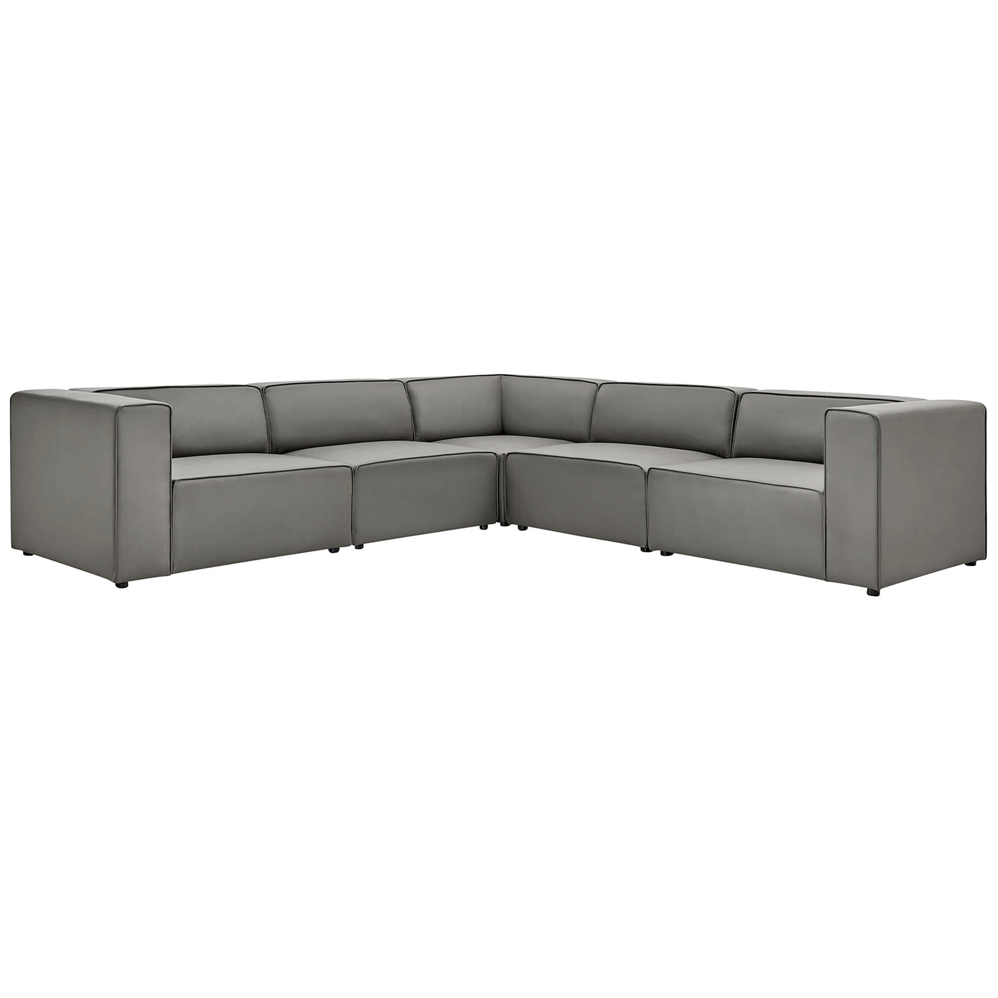 Kick back and relax with the Mingle Vegan Leather 5-Piece Sectional Sofa. Designed to wash away the hindrances that obstruct visual space, this sectional sofa set comes expansively designed with generous seating and dense foam padding that allows for just the right amount of giving. Mingle easily positions according to the needs of the moment and features rich vegan leather upholstery with elegant piping and plastic legs for steady support. Host animated living or lounge room get-togethers with a modular sectional sofa seating assortment perfect for contemporary modern décors. Set Includes: Left-Arm Chair, Right-Arm Chair, Corner Chair, 2 Armless Chairs