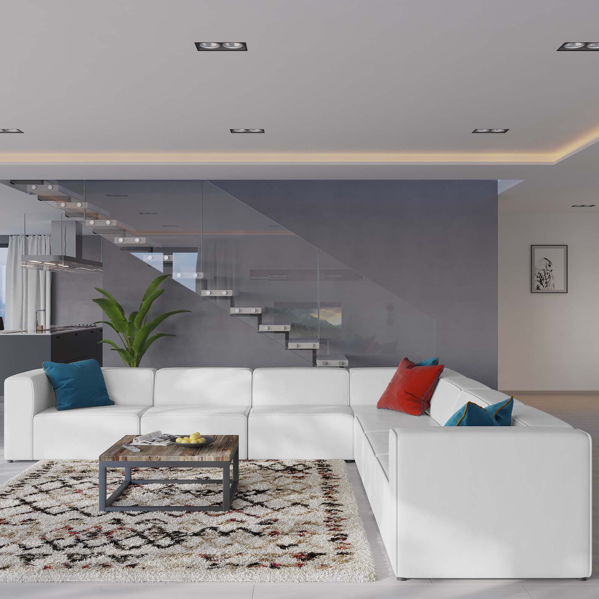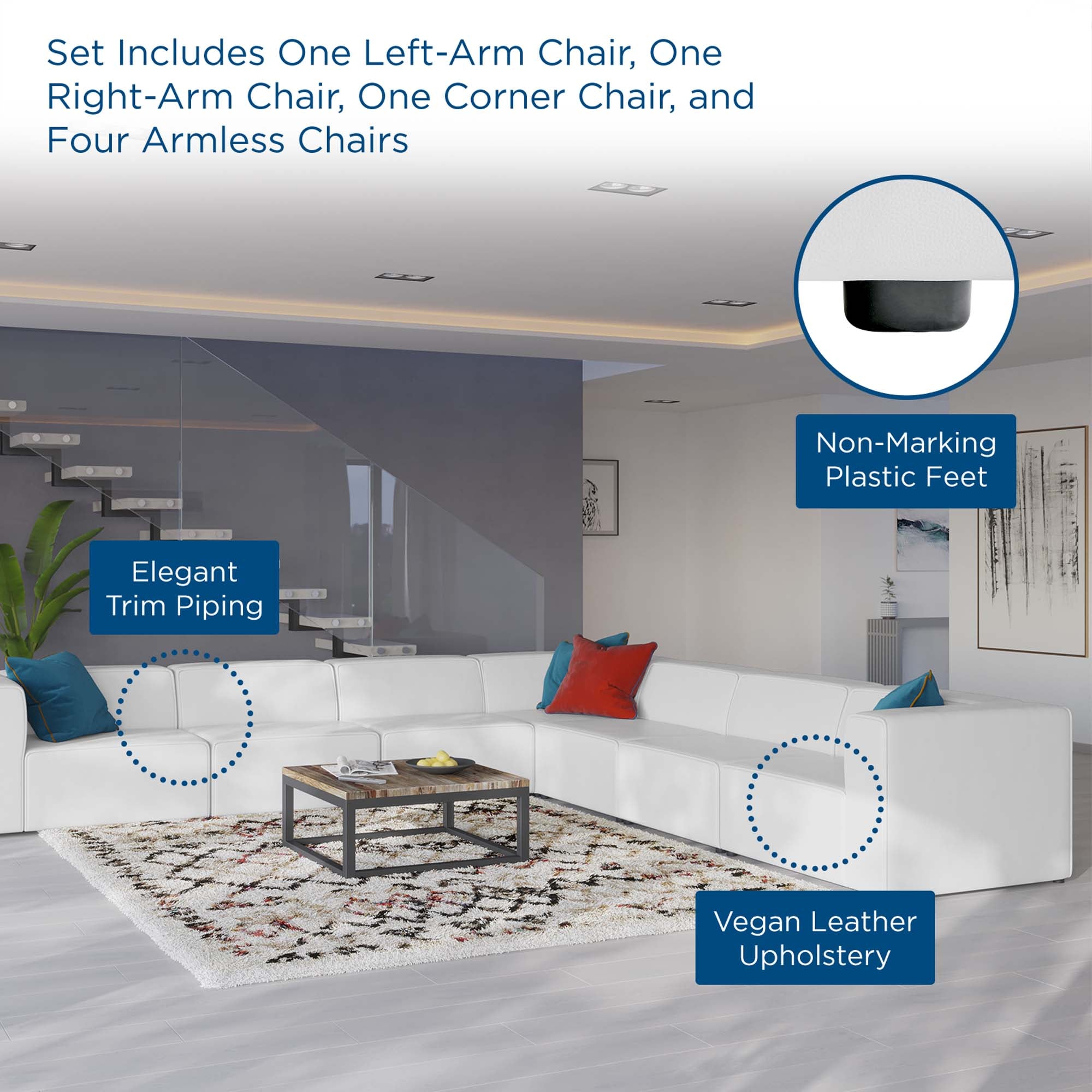 Kick back and relax with the Mingle Vegan Leather 7-Piece Sectional Sofa. Designed to wash away the hindrances that obstruct visual space, this sectional sofa set comes expansively designed with generous seating and dense foam padding that allows for just the right amount of giving. Mingle easily positions according to the needs of the moment and features rich vegan leather upholstery with elegant piping and plastic legs for steady support. Host animated living or lounge room get-togethers with a modular sectional sofa seating assortment perfect for contemporary modern décors. Set Includes: 1 Left-Arm Chair, 1 Right-Arm Chair, 1 Corner Chair, 4 Armless Chairs