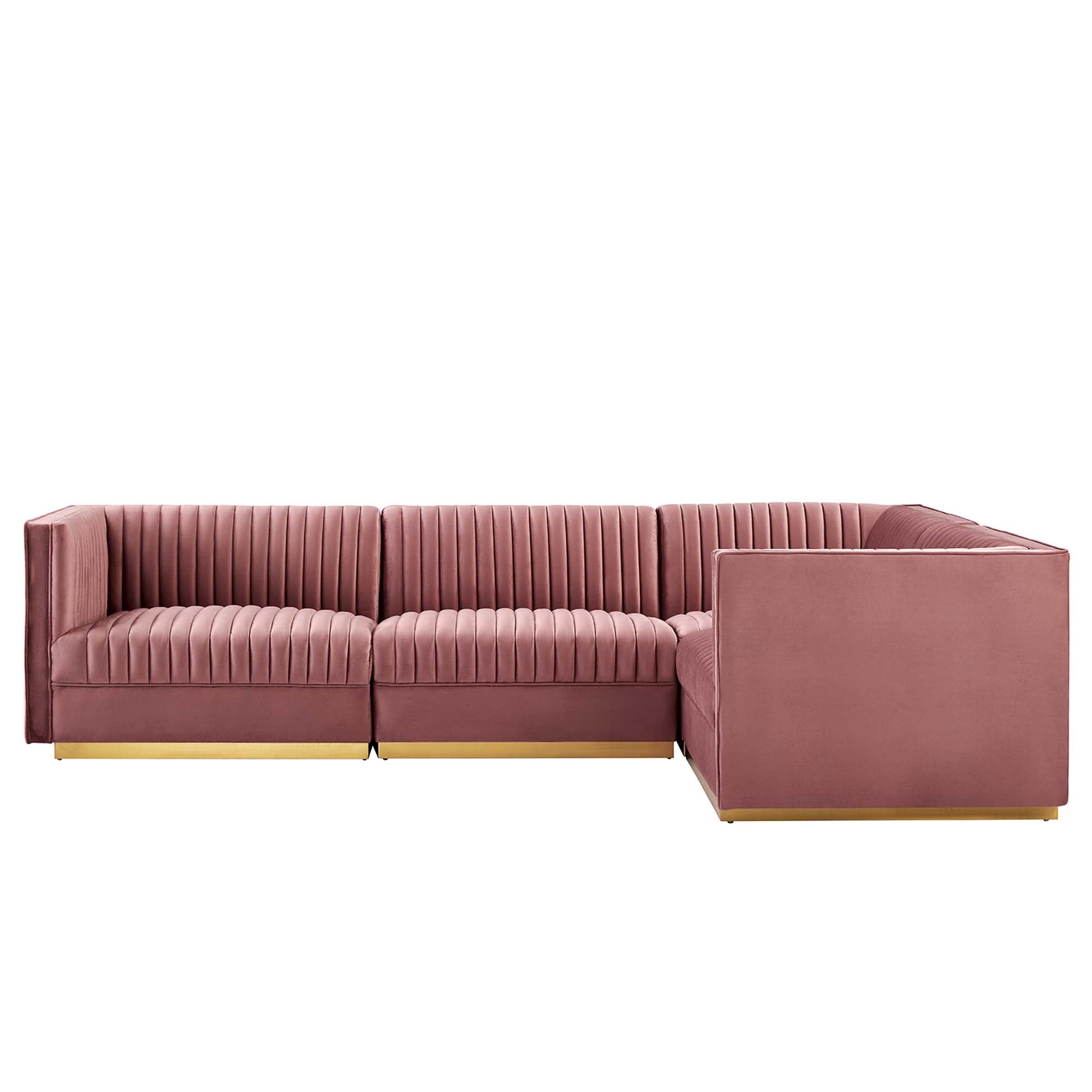 Glamour radiates from the organic linear design of the Sanguine Channel Tufted Performance Velvet Right-Facing Modular Sectional Sofa. Relax and follow the vertical channel tufting for a streamlined look that adds retro modern glamour to your living room, lounge, or home office. Soft, stain-resistant performance velvet upholstery creates a luxurious tactile experience while dense foam padding and an individually wrapped spring coil system provide ultimate comfort and support for this sectional sofa. Solidly constructed from eucalyptus wood and plywood, this sectional sofa is an eye-catching addition. Sanguine's palatial accents and premium comfort rest securely on a gold stainless steel base that complements any contemporary modern home or apartment. Includes non-marking foot pads to protect flooring and modular connectors. Each Seat Weight Capacity: 330 lbs.