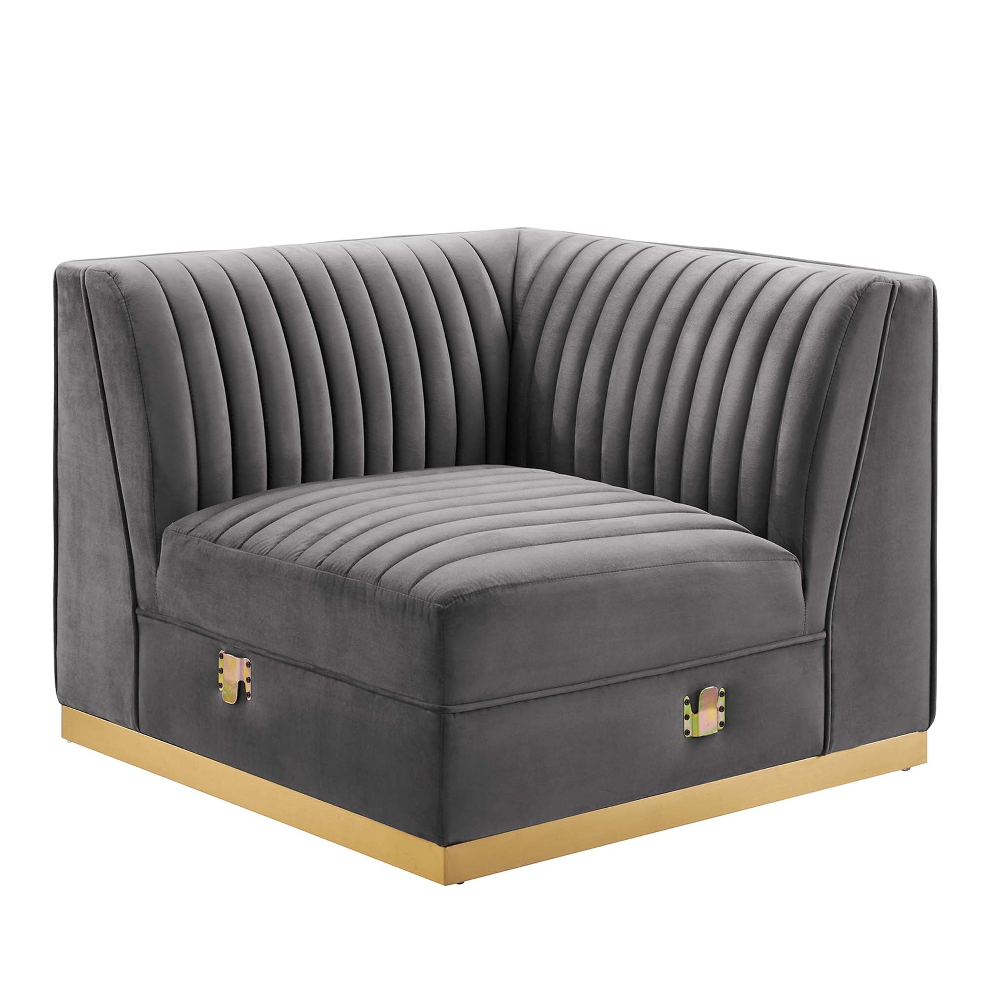 Glamour radiates from the organic linear design of the Sanguine Channel Tufted Performance Velvet Left-Facing Modular Sectional Sofa. Relax and follow the vertical channel tufting for a streamlined look that adds retro modern glamour to your living room, lounge, or home office. Soft, stain-resistant performance velvet upholstery creates a luxurious tactile experience while dense foam padding and an individually wrapped spring coil system provide ultimate comfort and support for this sectional sofa. Solidly constructed from eucalyptus wood and plywood, this sectional sofa is an eye-catching addition. Sanguine's palatial accents and premium comfort rest securely on a gold stainless steel base that complements any contemporary modern home or apartment. Includes non-marking foot pads to protect flooring and modular connectors. Each Seat Weight Capacity: 330 lbs.