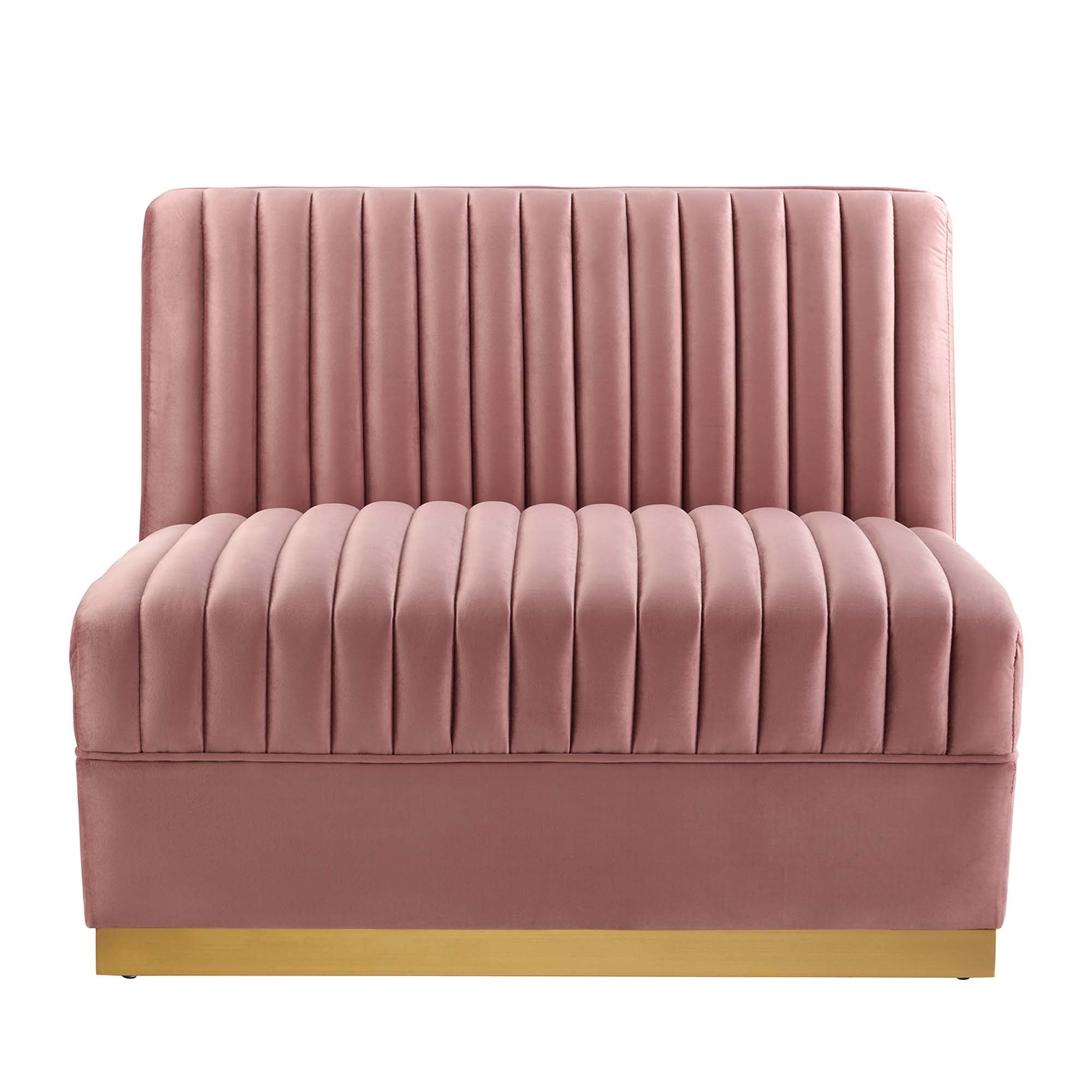 Glamour radiates from the organic linear design of the Sanguine Channel Tufted Performance Velvet Modular Sectional Sofa. Relax and follow the vertical channel tufting for a streamlined look that adds retro modern glamour to your living room, lounge, or home office. Soft, stain-resistant performance velvet upholstery creates a luxurious tactile experience while dense foam padding and an individually wrapped spring coil system provide ultimate comfort and support for this sectional sofa. Solidly constructed from eucalyptus wood and plywood, this sectional sofa is an eye-catching addition. Sanguine's palatial accents and premium comfort rest securely on a gold stainless steel base that complements any contemporary modern home or apartment. Includes non-marking foot pads to protect flooring and modular connectors. Each Seat Weight Capacity: 330 lbs.