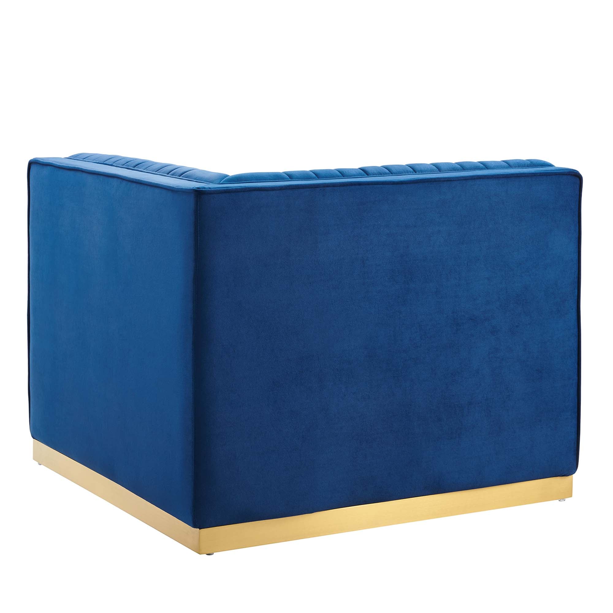 Glamour radiates from the organic linear design of the Sanguine Channel Tufted Performance Velvet Modular Sectional Sofa Right Corner Chair. Relax and follow the vertical channel tufting for a streamlined look that adds retro modern glamour to your living room, lounge, or home office. Soft, stain-resistant performance velvet upholstery creates a luxurious tactile experience while dense foam padding and an individually wrapped spring coil system provide ultimate comfort and support for this sectional sofa piece. Solidly constructed from eucalyptus wood and plywood, this sectional sofa collection is an eye-catching addition. Sanguine's palatial accents and premium comfort rest securely on a gold stainless steel base that complements any contemporary modern home or apartment. Includes non-marking foot pads to protect flooring. Weight Capacity: 330 lbs.