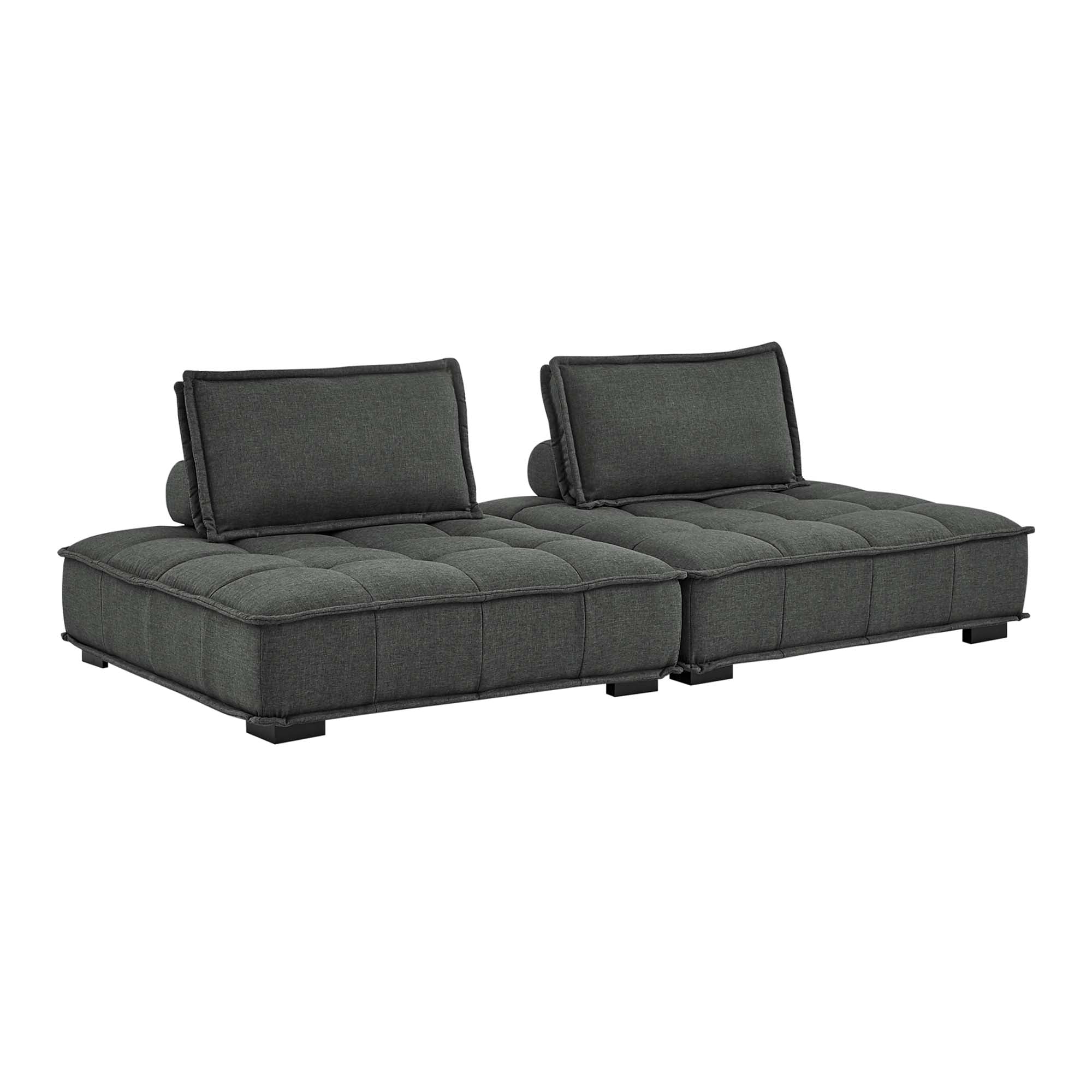 Sprawl out amidst comfort and style on the Saunter Tufted Fabric 2-Piece Loveseat. With square biscuit tufting, French piping detail, and soft polyester upholstery, this sectional sofa collection brings tailored style to your living space or lounge area with its charming low profile silhouette. A removable bolster pillow supporting a seat back cushion offers a comfortable place to rest while watching TV, relaxing, or entertaining. Dense foam padding and a sinuous spring support system grant a premium seating experience for all occasions. This two-piece loveseat rests atop L-shaped rubberwood legs with non-marking foot caps. Set Includes: 2 Armless Chairs; Weight Capacity Each Chair: 300 lbs.