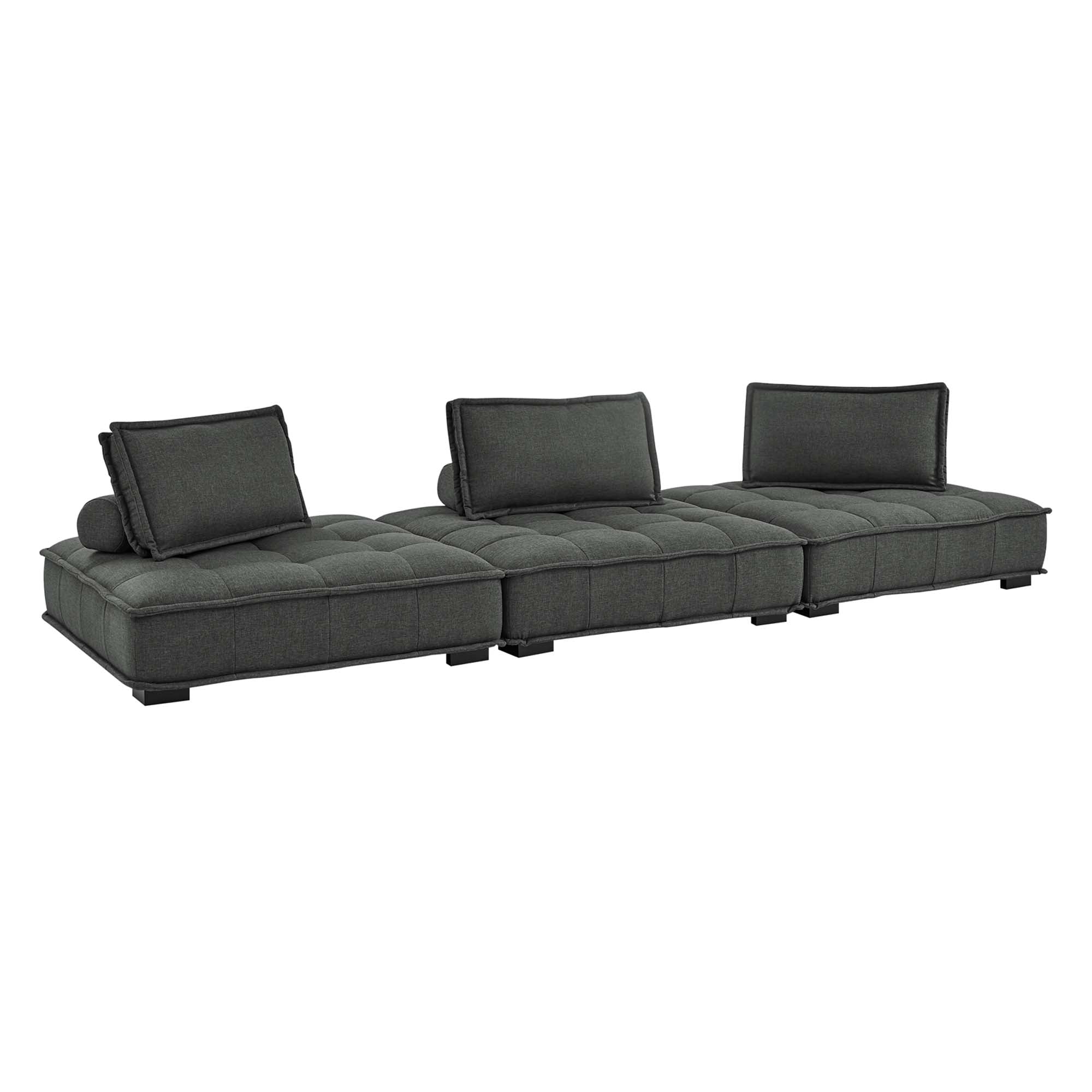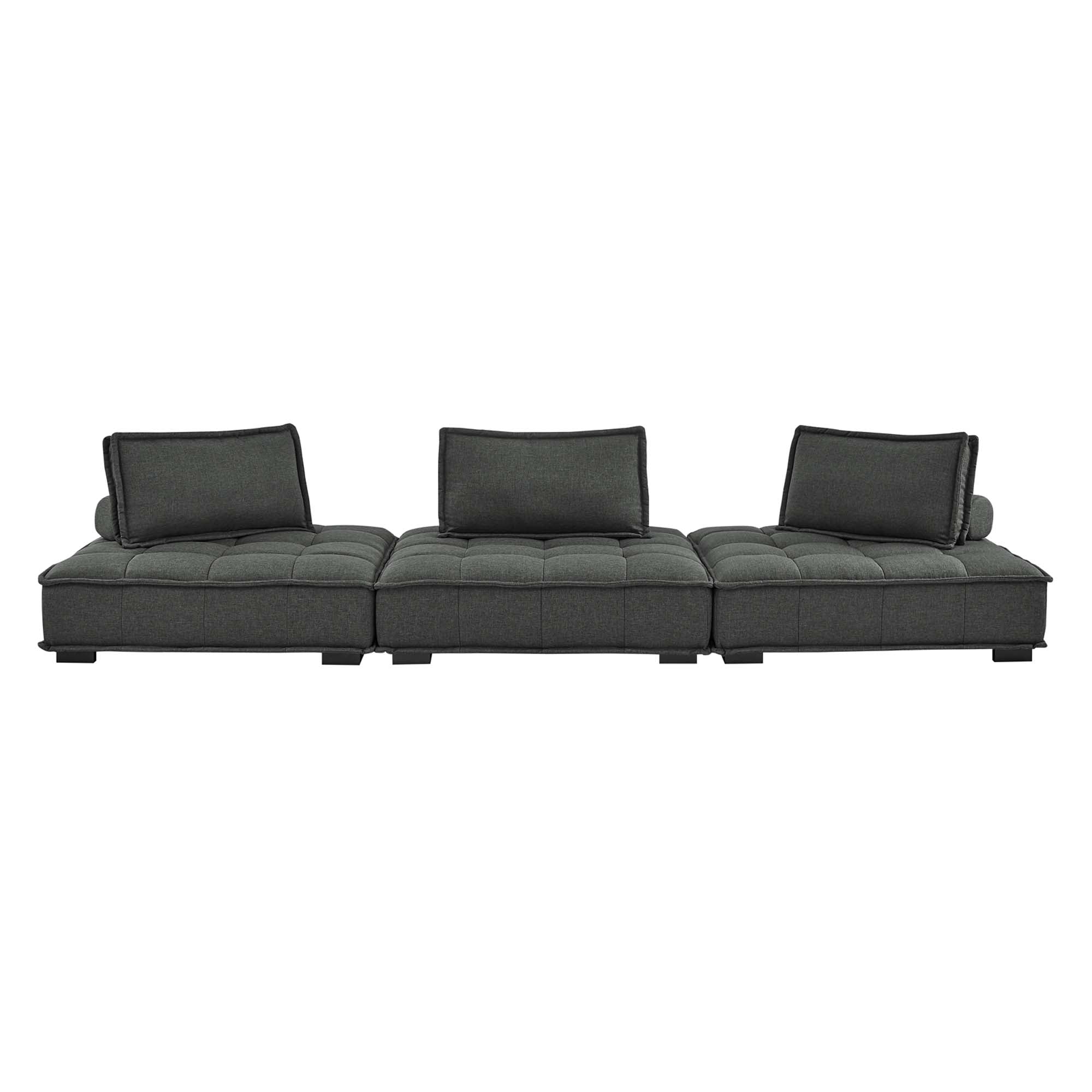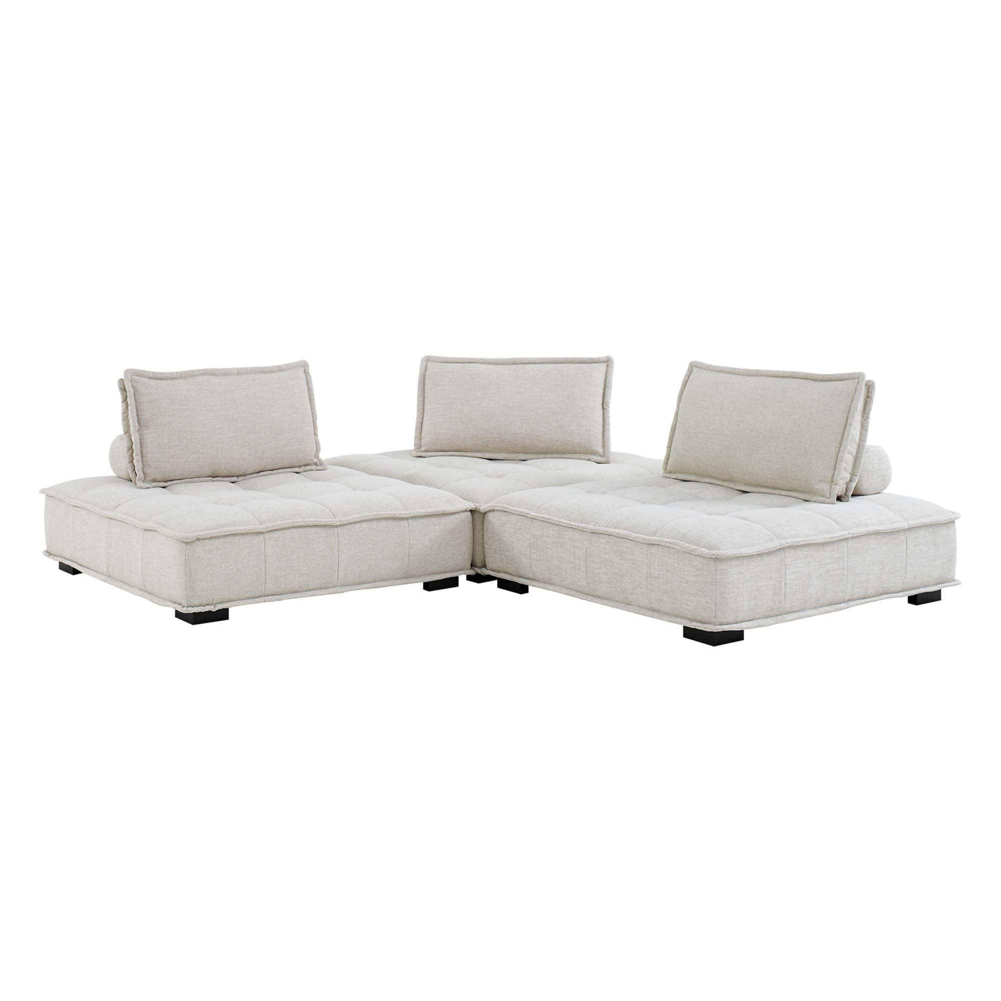 Sprawl out amidst comfort and style on the Saunter Tufted Fabric 3-Piece Sofa. With square biscuit tufting, French piping detail, and soft polyester upholstery, this sectional sofa collection brings tailored style to your living space or lounge area with its charming low profile silhouette. A removable bolster pillow supporting a seat back cushion offers a comfortable place to rest while watching TV, relaxing, or entertaining. Dense foam padding and a sinuous spring support system grant a premium seating experience for all occasions. This three-piece sofa rests atop L-shaped rubberwood legs with non-marking foot caps. Set Includes: 3 Armless Chairs; Weight Capacity Each Chair: 300 lbs.