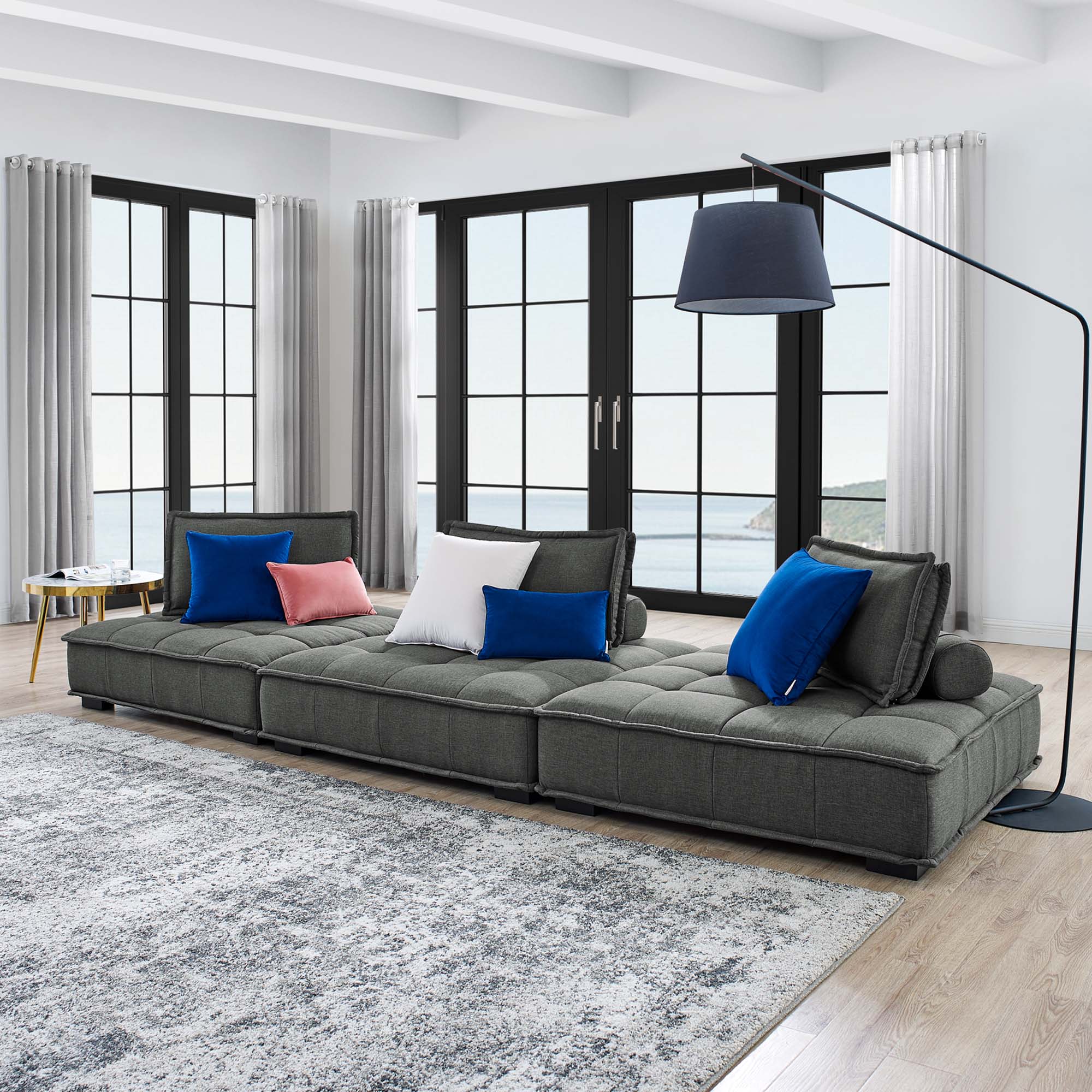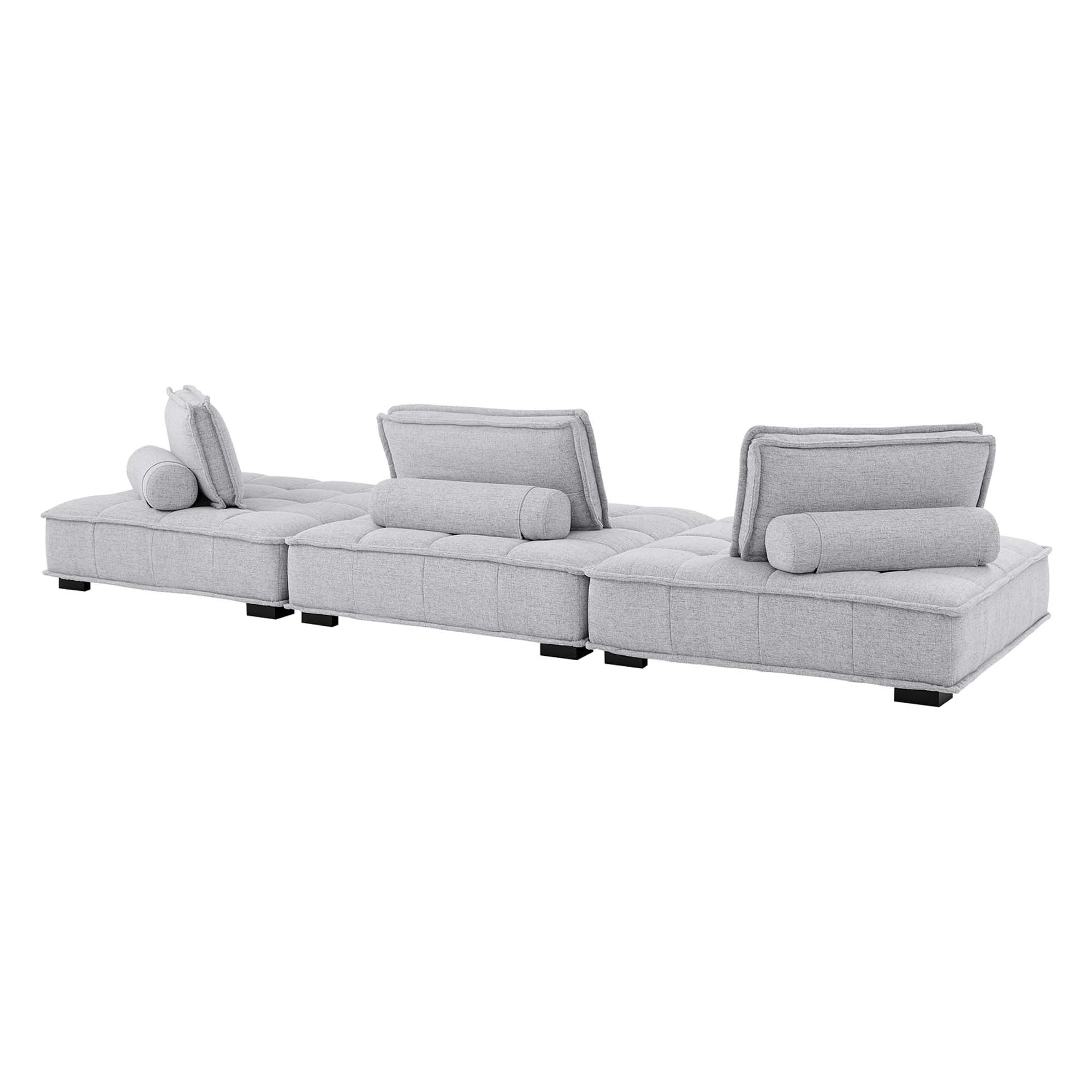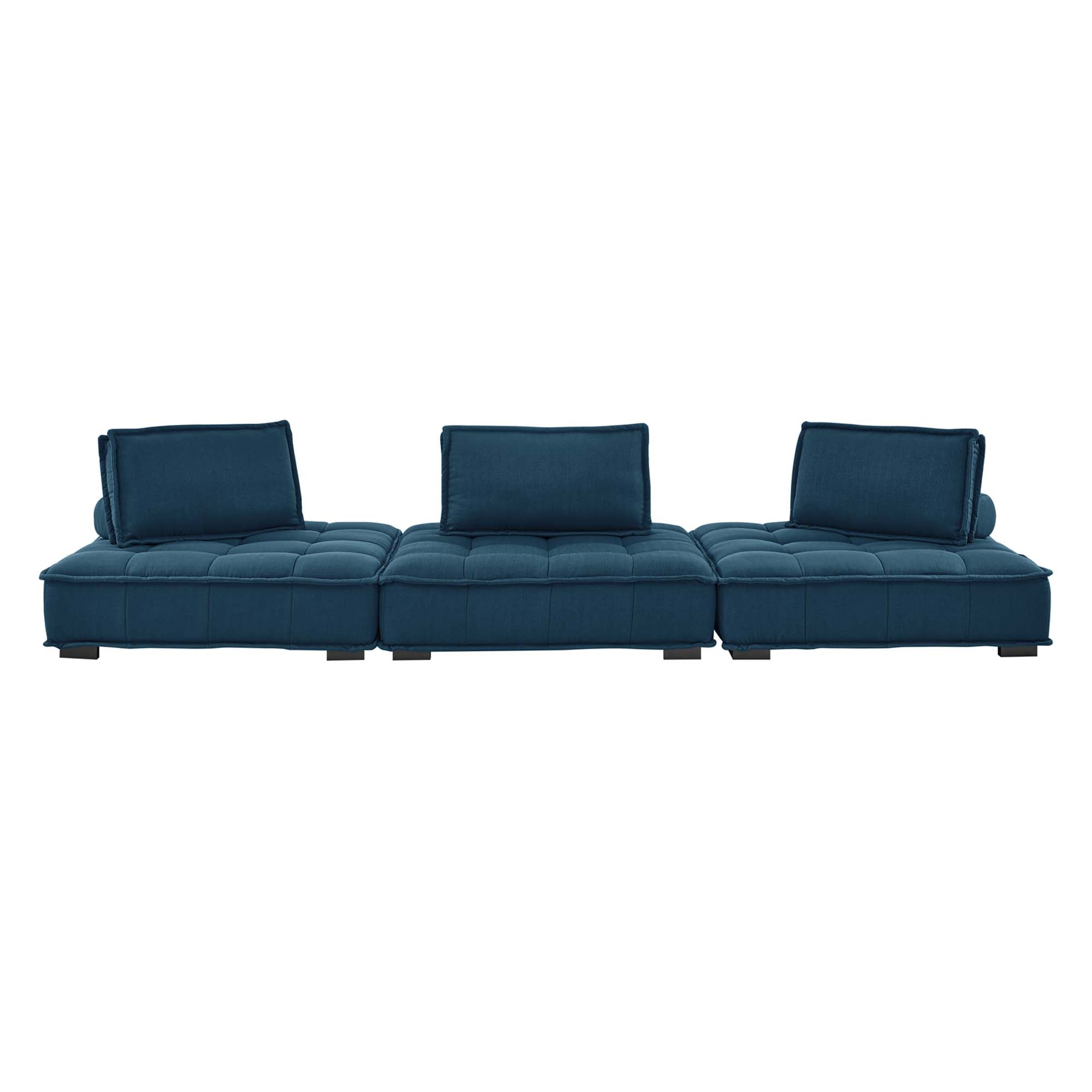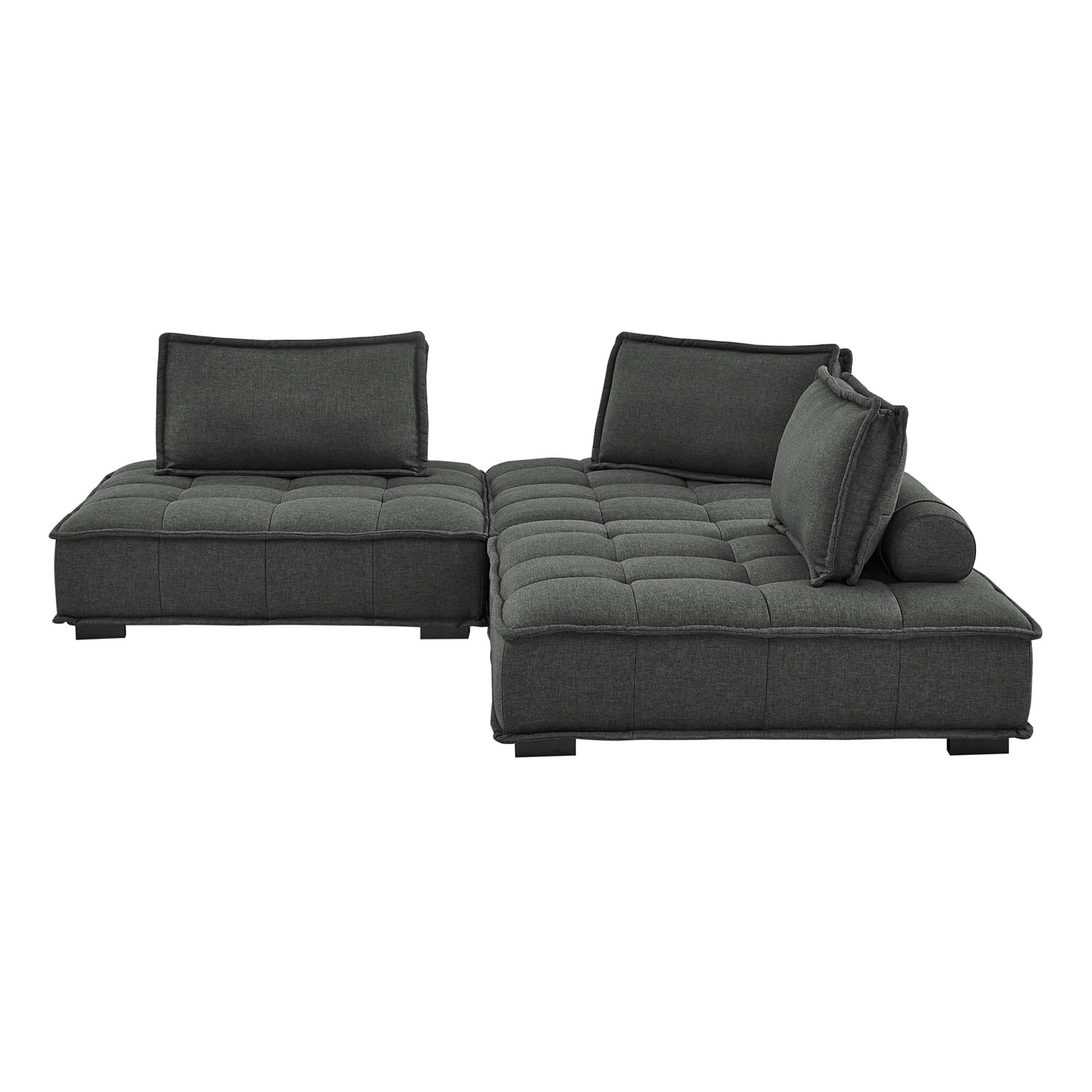 Sprawl out amidst comfort and style on the Saunter Tufted Fabric 3-Piece Sofa. With square biscuit tufting, French piping detail, and soft polyester upholstery, this sectional sofa collection brings tailored style to your living space or lounge area with its charming low profile silhouette. A removable bolster pillow supporting a seat back cushion offers a comfortable place to rest while watching TV, relaxing, or entertaining. Dense foam padding and a sinuous spring support system grant a premium seating experience for all occasions. This three-piece sofa rests atop L-shaped rubberwood legs with non-marking foot caps. Set Includes: 3 Armless Chairs; Weight Capacity Each Chair: 300 lbs.