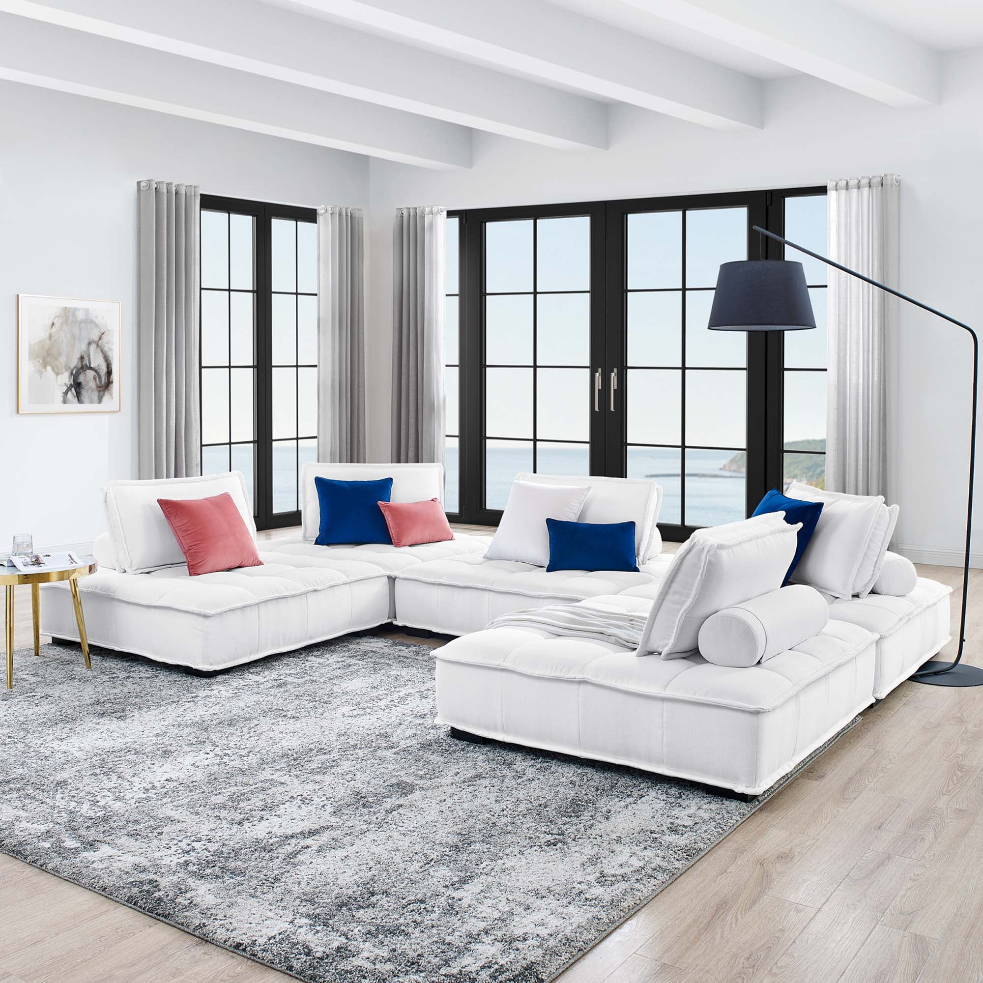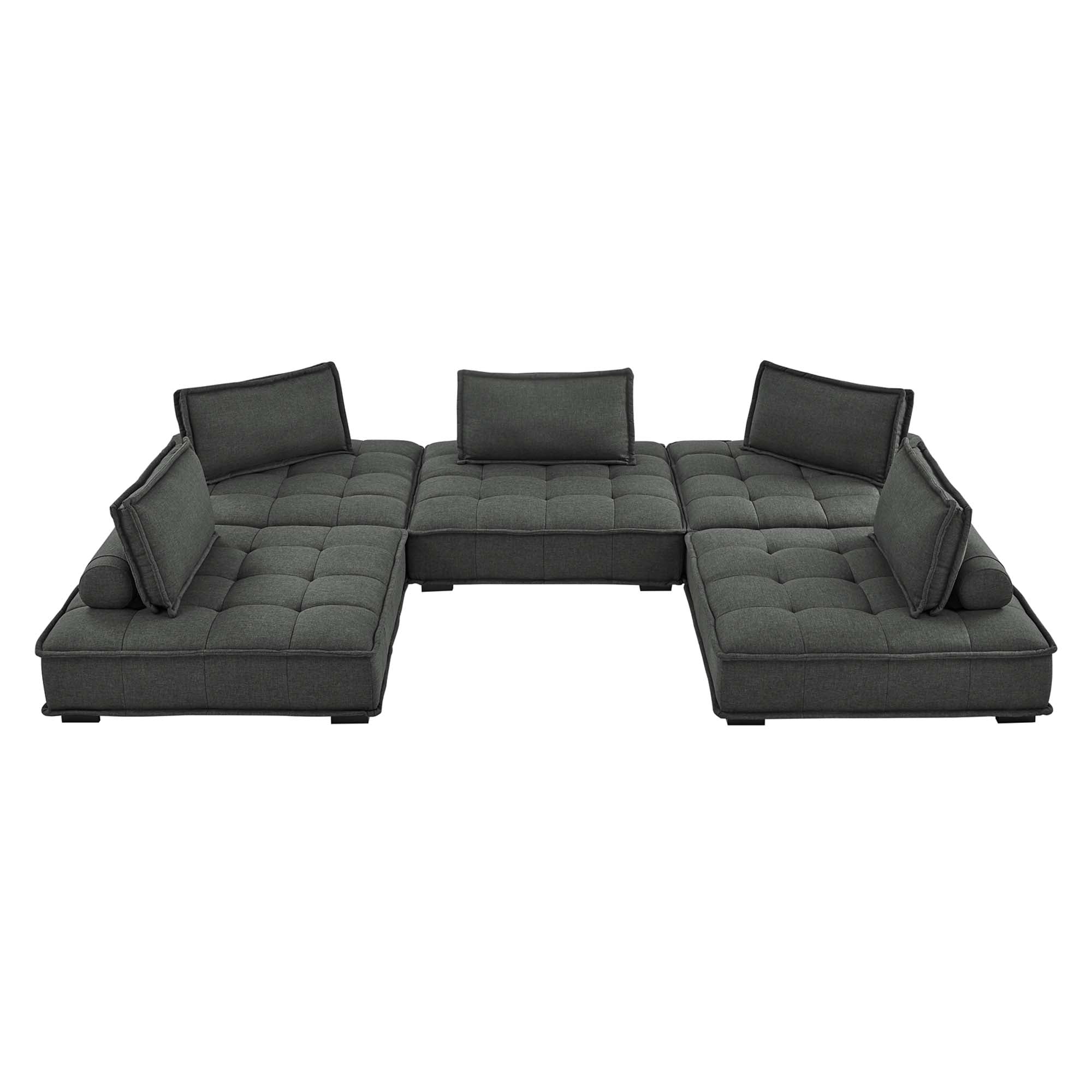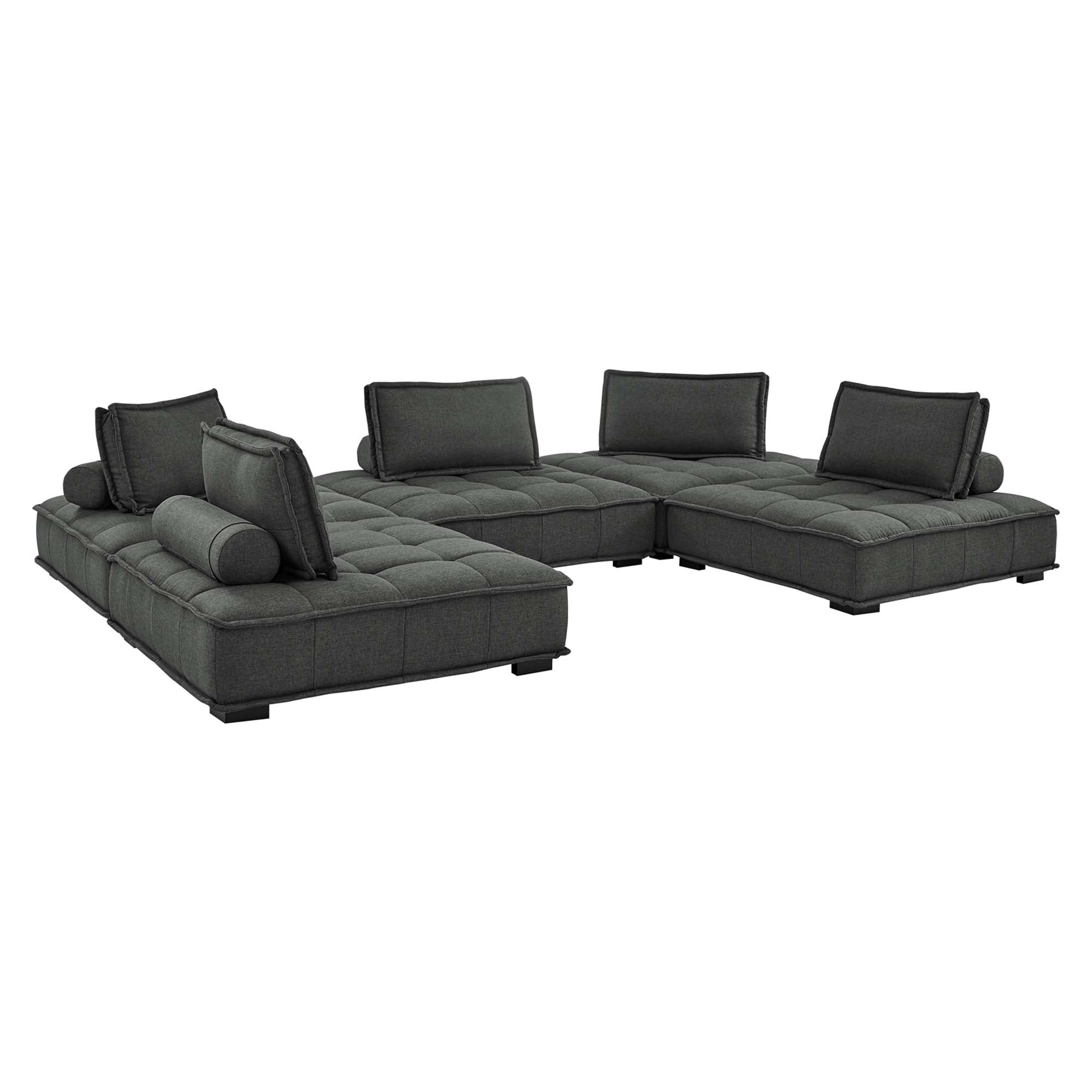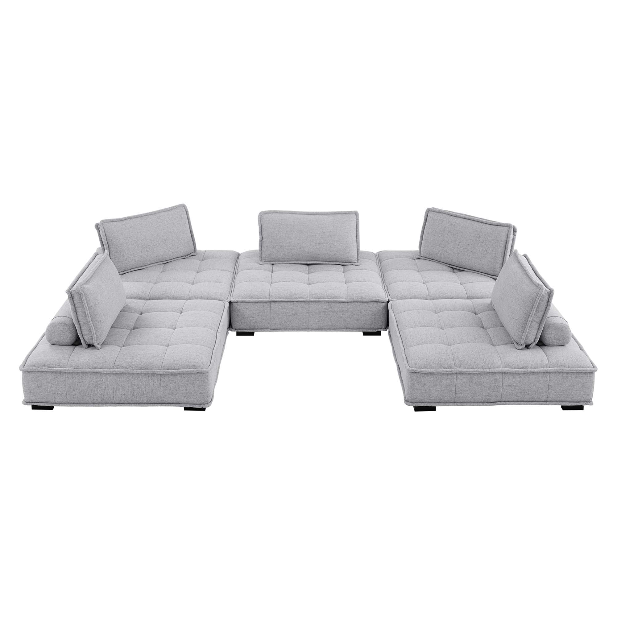 Sprawl out amidst comfort and style on the Saunter Tufted Fabric 5-Piece Sectional Sofa. With square biscuit tufting, French piping detail, and soft polyester upholstery, this sectional sofa collection brings tailored style to your living space or lounge area with its charming low profile silhouette. A removable bolster pillow supporting a seat back cushion offers a comfortable place to rest while watching TV, relaxing, or entertaining. Dense foam padding and a sinuous spring support system grant a premium seating experience for all occasions. This four-piece sectional sofa rests atop L-shaped rubberwood legs with non-marking foot caps. Set Includes: 5 Armless Chairs; Weight Capacity Each Chair: 300 lbs.