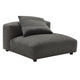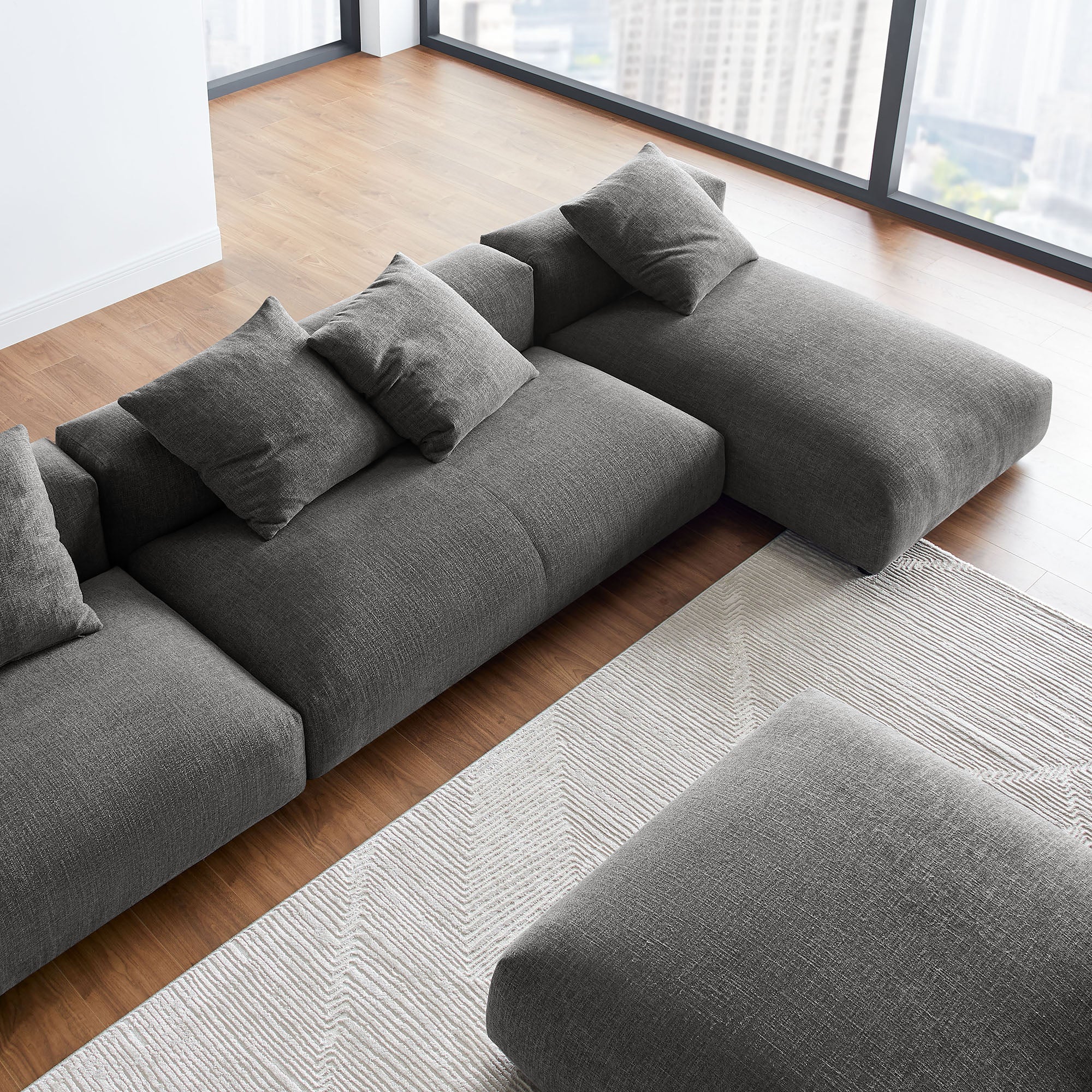 Revel in ultimate comfort and modern style with the Solace Modular Sectional Sofa. This oversized fabric sectional sofa is perfect for any living room, offering endless flexibility. Its modular furniture design allows you to change the arrangement to suit the needs of the moment or expand your seating by adding more pieces in the future. Featuring a sturdy frame, dense foam padding, and a sinuous spring support system, the Solace Large Sectional Sofa grants a premium seating experience with its soft textured woven fabric upholstery. The comfy upholstery adds a cozy, casual vibe, making this deep sectional sofa a perfect addition to any living space or lounge area. Equipped with non-marking plastic glides and complementing accent pillows, this 4-piece sectional sofa set is both stylish and practical. With no assembly required, you can enjoy immediate relaxation with this L-shaped modular sectional sofa. Set Includes: 1 Armless Chair, 1 Armless Loveseat, 1 Armless Chaise, 1 Ottoman