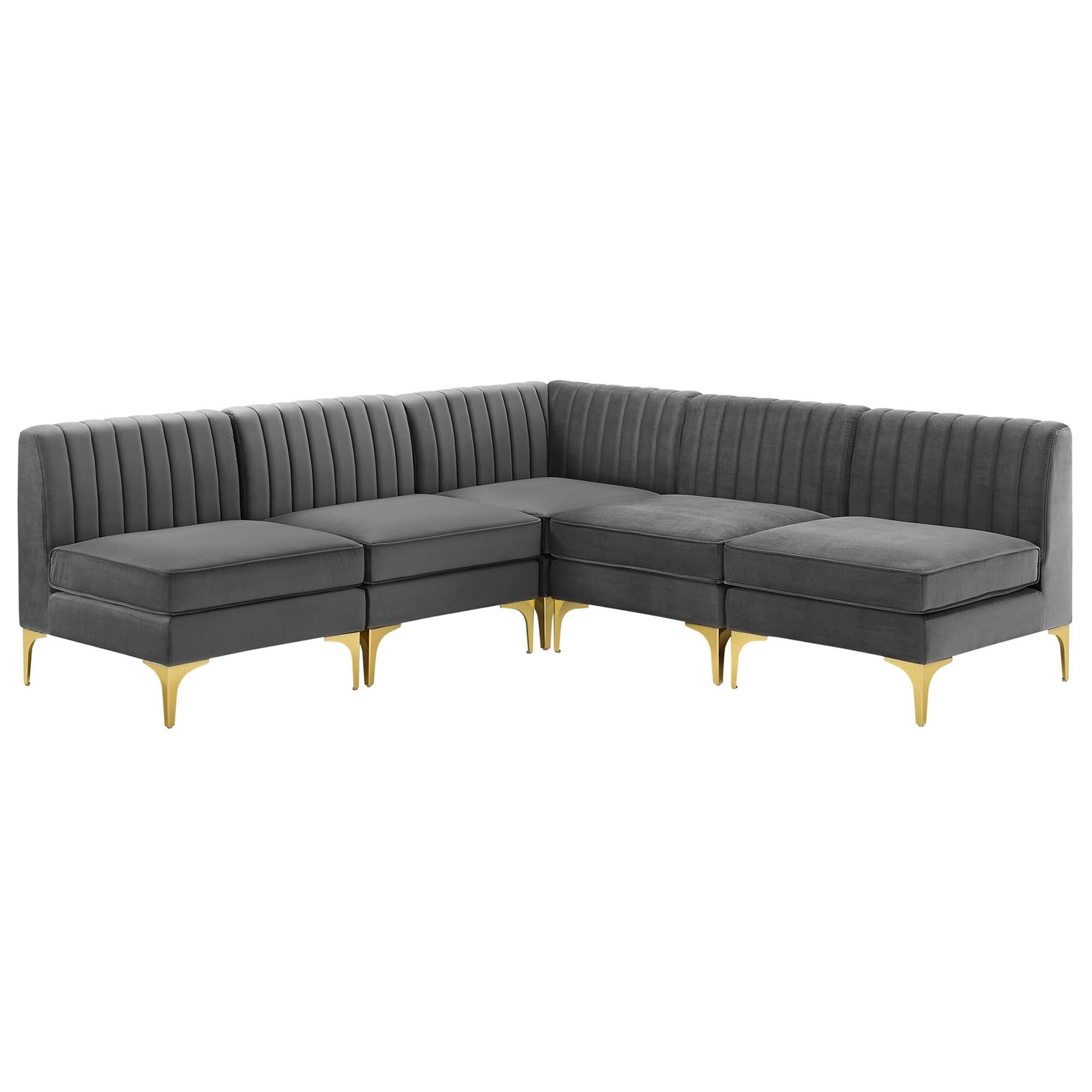 Elevate your living space with the visual appeal and linear detail of the Triumph Channel Tufted Performance Velvet 5-Piece Sectional Sofa. With interior channel tufting and luxe velvety texture, this sectional sofa abounds in retro modern style and glam deco charm. This couch is part of a sectional sofa collection that allows you to create a seating solution that works for your living room, bedroom, office space, entryway, or lounge area. This upholstered sectional sofa is covered in stain-resistant performance velvet and features dense foam padding and a sinuous spring support system for a premium seating experience. The velvet sofa sits on four gold metal legs with non-marking foot caps to protect your flooring. Weight Capacity for Each Sectional Sofa Piece: 440 lbs.