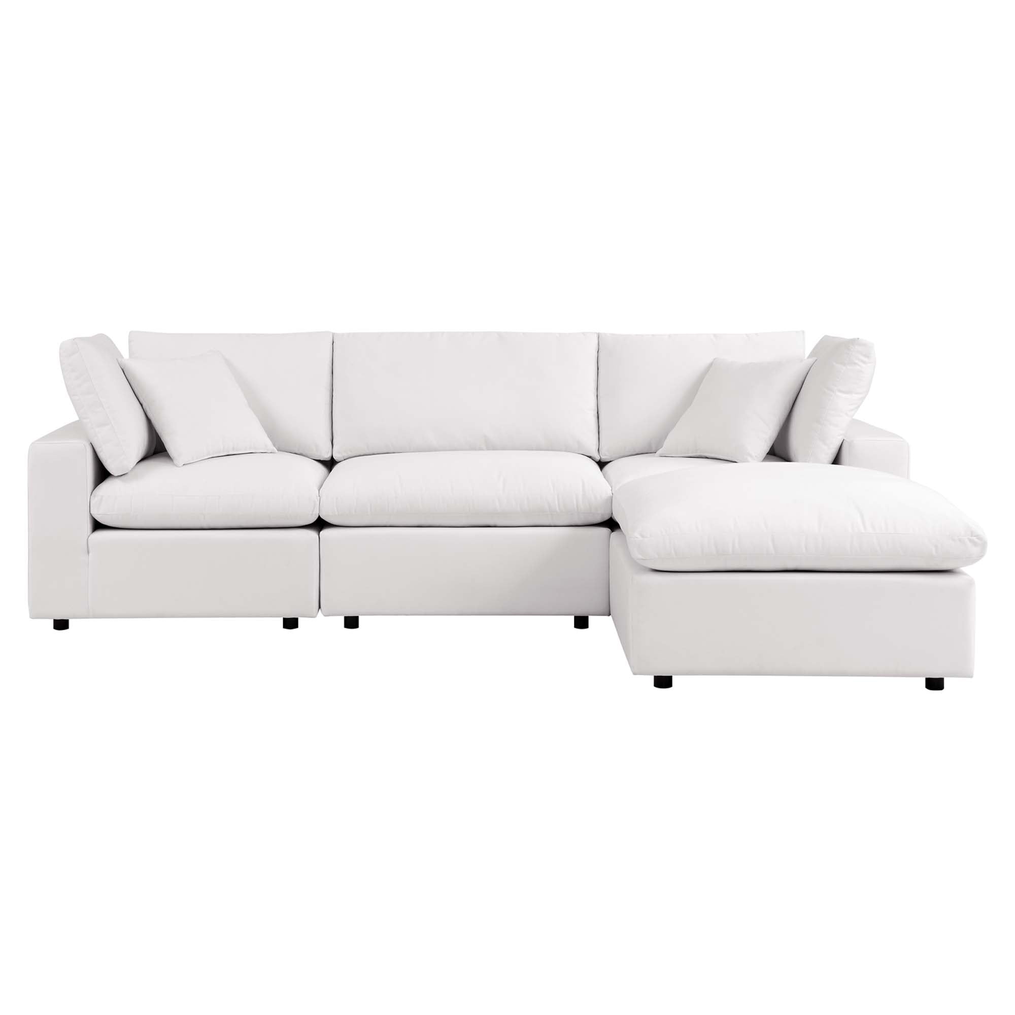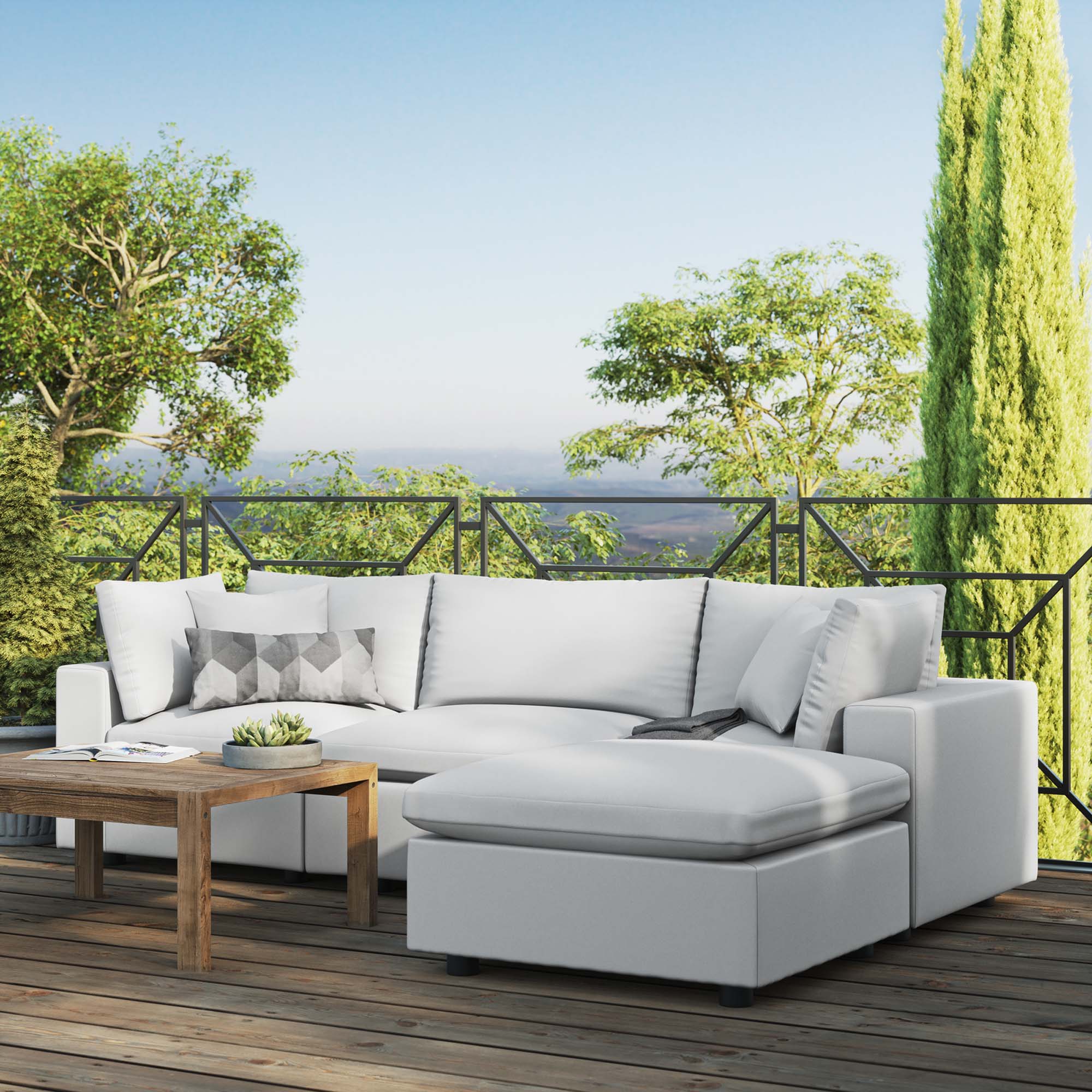 A haven for cozy relaxation right in your own backyard, Commix features plush comfort, a clean-lined design, and a spacious profile that makes an attractive statement on the porch, patio, or by the poolside. Made for sprawling out in the sun or curling up with a good book, this outdoor patio sectional sofa features generously padded cushions covered in water-repellent, UV-resistant covers making them ideal for your outdoor space. This outdoor sectional sofa features an all-weather construction with a powder-coated aluminum frame and non-marking foot caps to protect flooring surfaces. Beckoning guests to sit and stay a while, the Commix Outdoor Patio Collection is perfect for al fresco entertaining or lounging amidst warm weather. Set Includes: 1 Armless Chair, 1 Ottoman, 2 Corner Chairs. Each Chair Weight Capacity: 300 lbs.