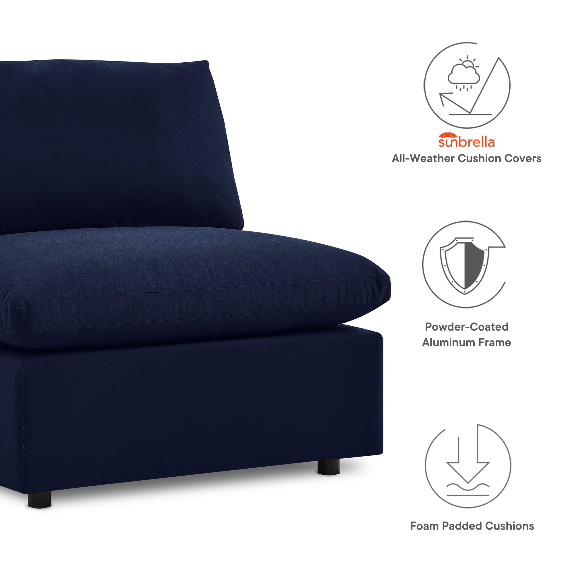 A haven for cozy relaxation right in your own backyard, Commix features plush comfort, a clean-lined design, and a spacious profile that makes an attractive statement on the porch, patio, or by the poolside. Made for sprawling out in the sun or curling up with a good book, this outdoor patio sectional sofa features generously padded cushions covered in water-repellent, UV-resistant Sunbrella® fabric covers making them ideal for your outdoor space. This outdoor sectional sofa features an all-weather construction with a powder-coated aluminum frame and non-marking foot caps to protect flooring surfaces. Beckoning guests to sit and stay a while, the Commix Outdoor Patio Collection is perfect for al fresco entertaining or lounging amidst warm weather. Set Includes: 4 Armless Chairs, 1 Corner Chair. Each Chair Weight Capacity: 300 lbs.