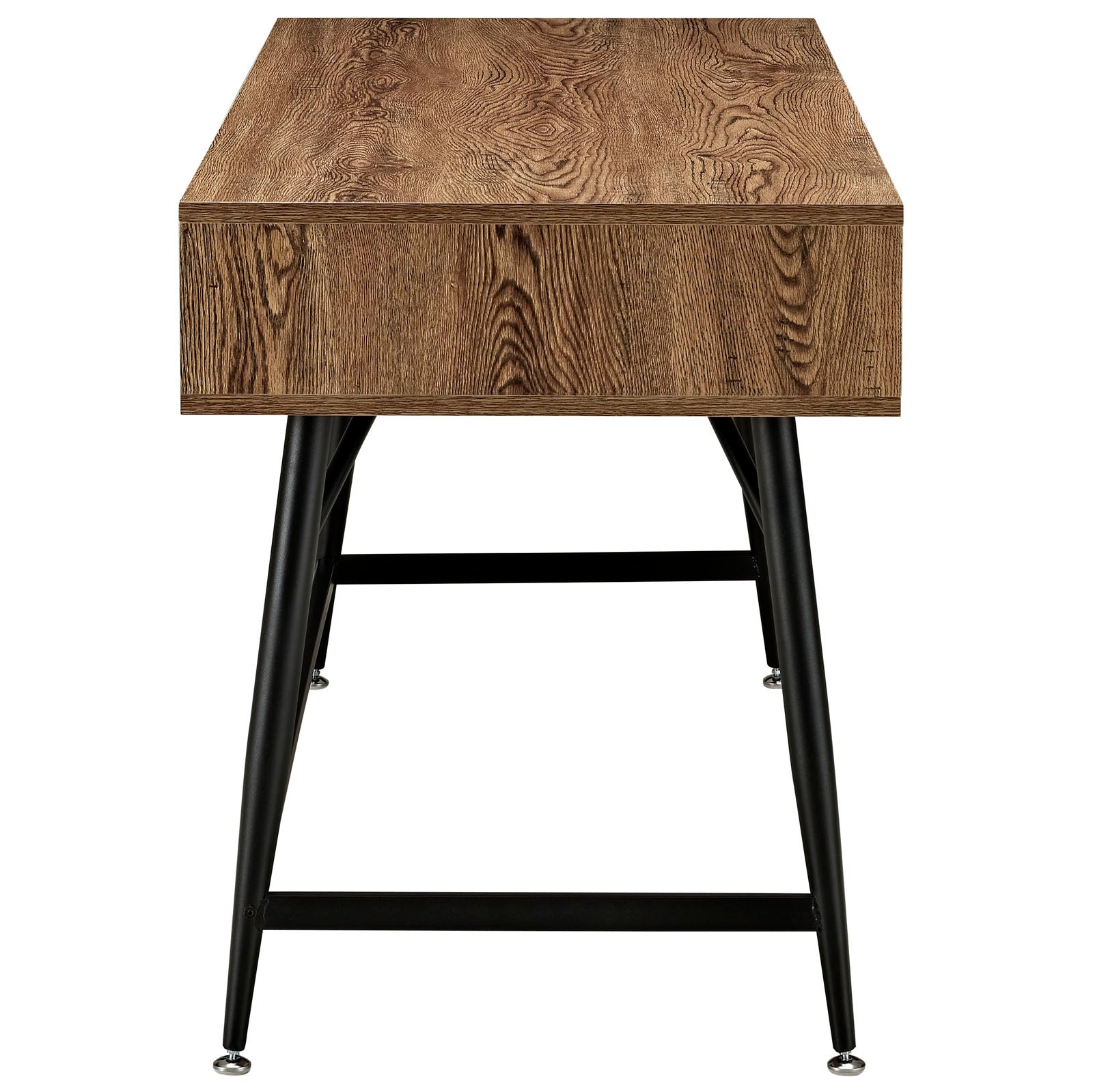 Designed to present a contemporary take on excess inventory, the Surplus desk is a rustic piece that reclaims and repurposes the sentiments of old. Made with a wood grain-patterned melamine top and powder-coated black steel legs, the beauty of Surplus is in its ability to redefine industrial-era design for the modern day. Surplus is outfitted with easy glide right and left storage drawers, and one long center drawer for pads and pens or keyboard storage. All four-foot glides are adjustable to ensure steady positioning.