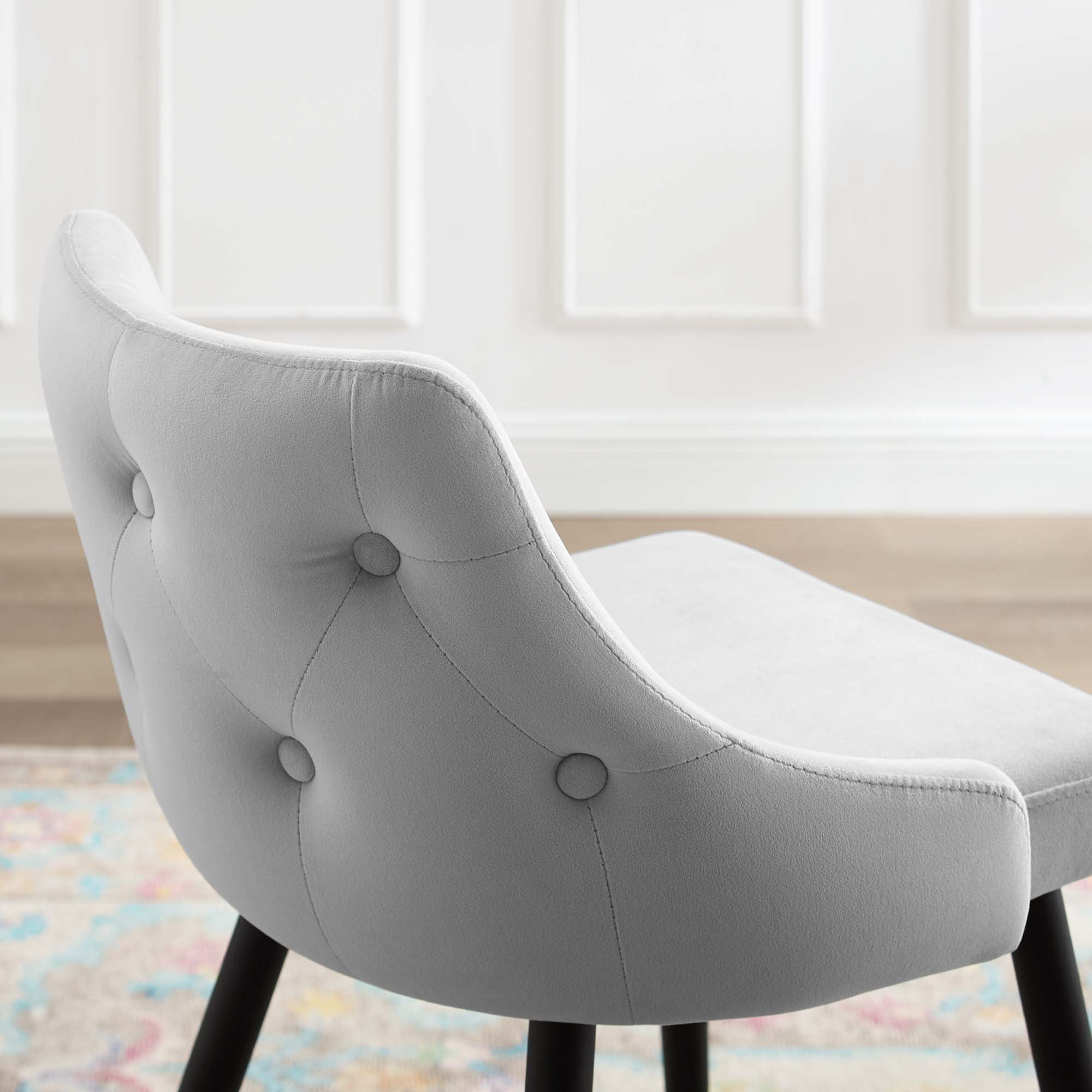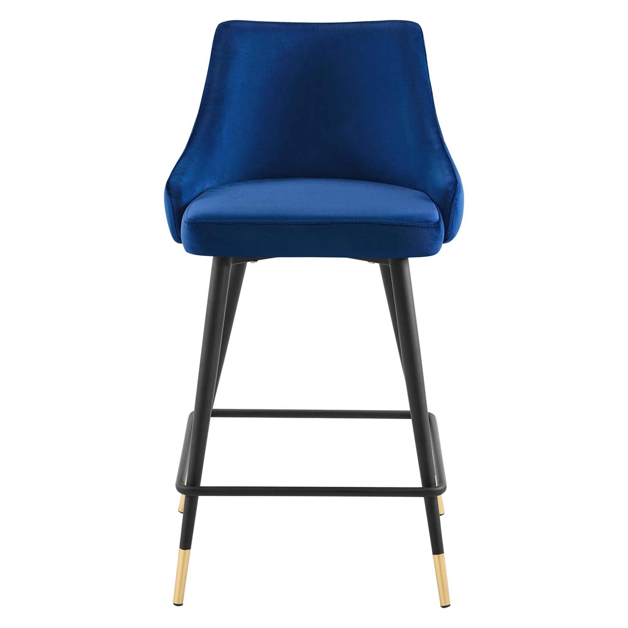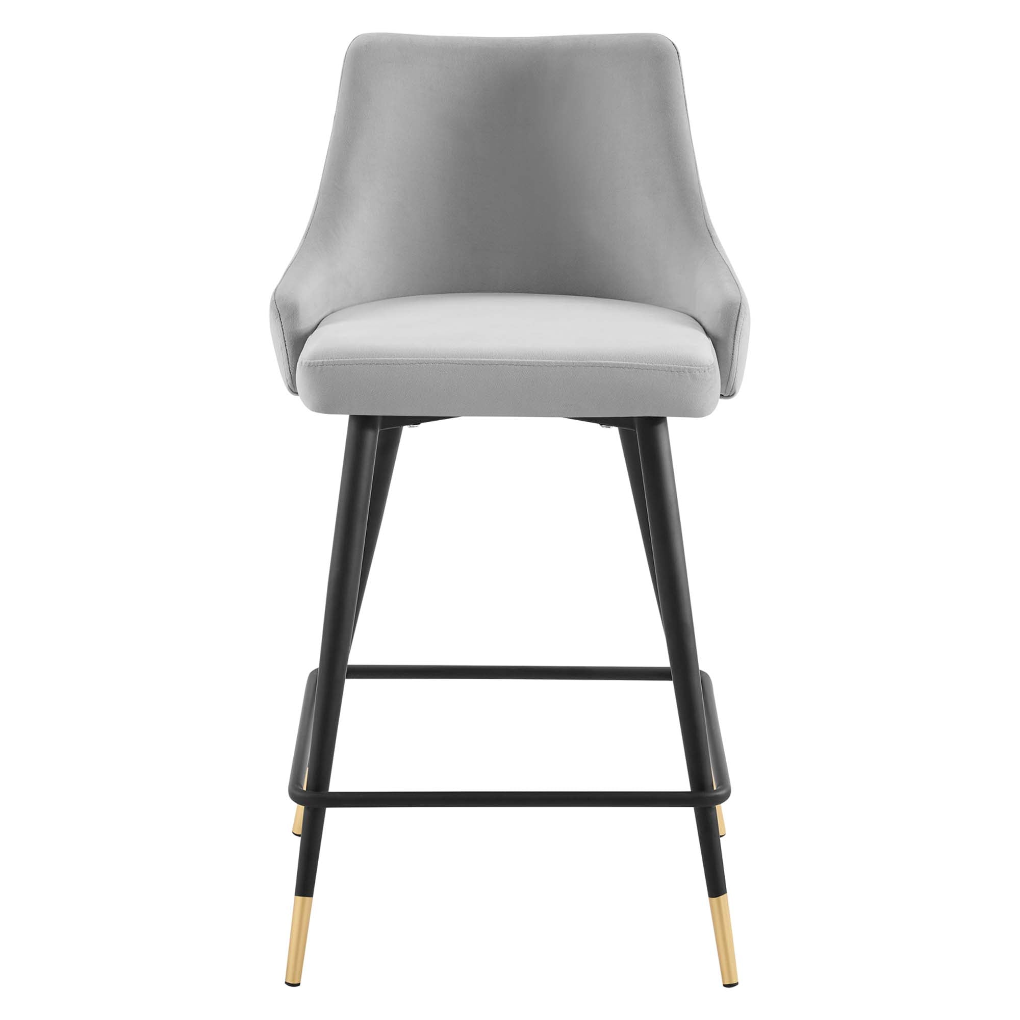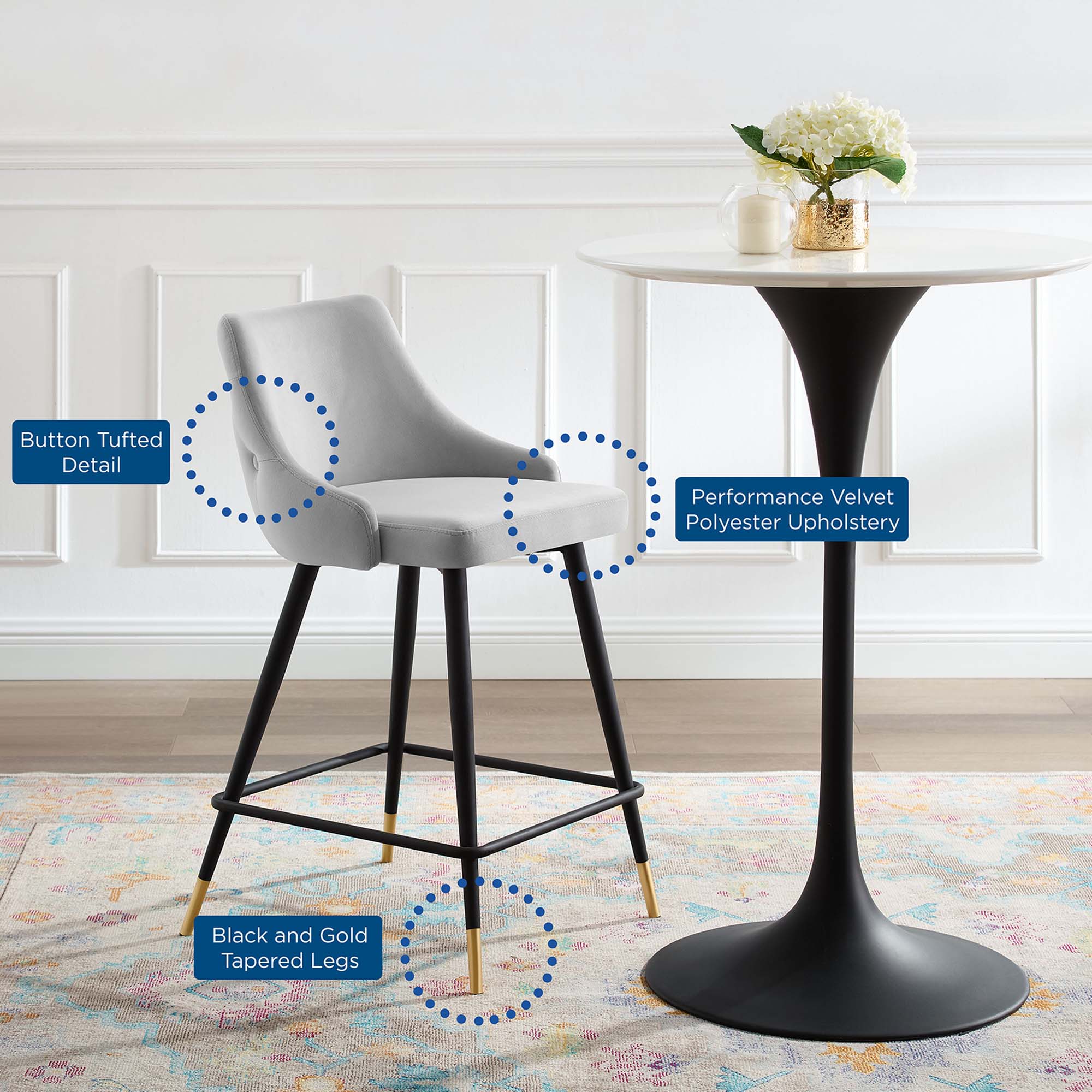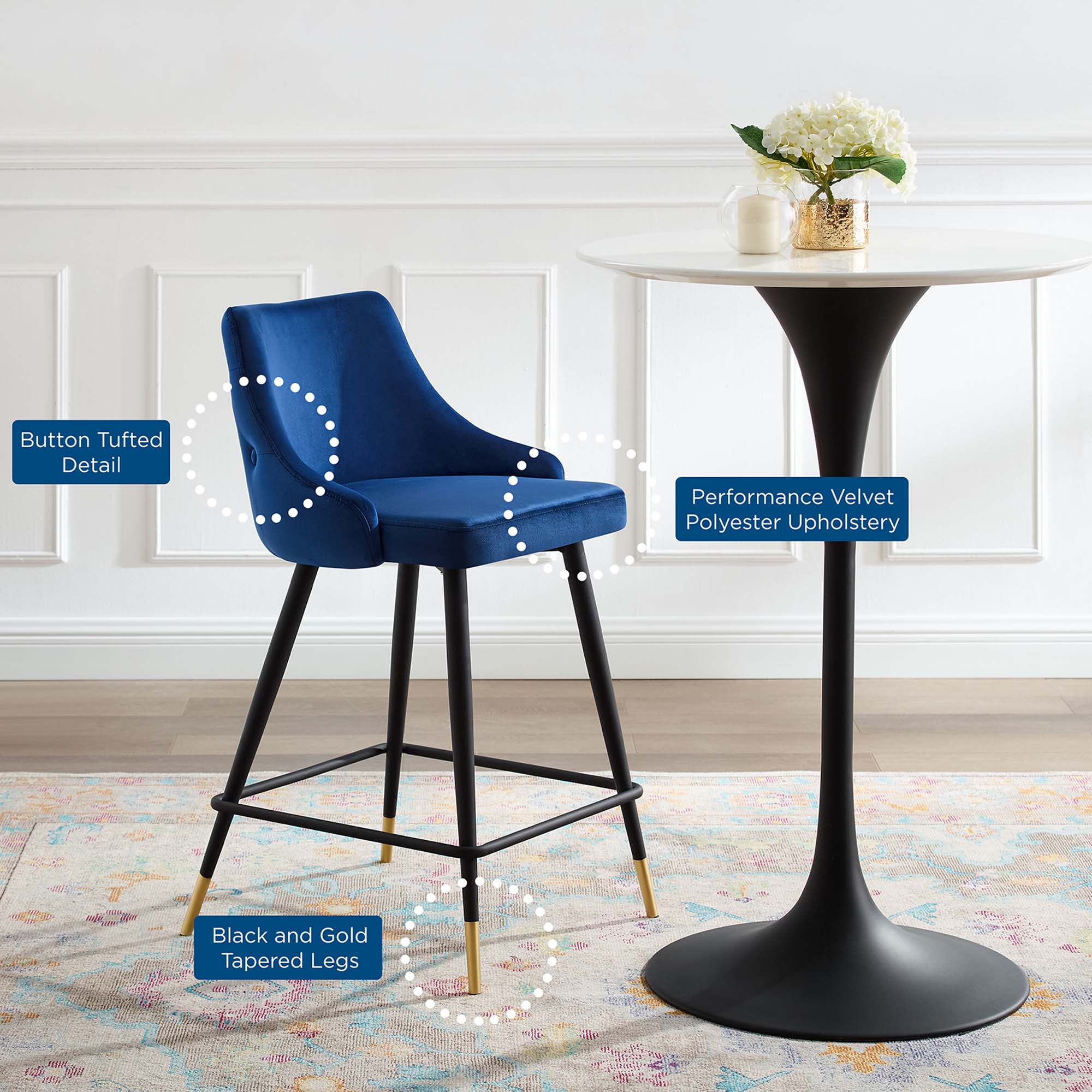 Revitalize dining room or kitchen decor with the Adorn Performance Velvet Counter Stool. Classic button tufting along the stool's exterior and graceful sweeping lines blend seamlessly into the lush comfort of this counter stool. Covered with soft stain-resistant performance velvet, this upholstered bar stool offers a comfortable place to dine with a dense foam padded seat. Sitting on four black tapered legs with gold foot sleeves, Adorn's vintage modern style and glam deco charm makes this bar stool ideally suited for a counter-height bar table or kitchen island, or even as an accompaniment to a drafting desk in the home office. This modern dining bar stool supports up to 300 lbs. and is complete with non-marking foot caps to protect your flooring. No assembly required.
